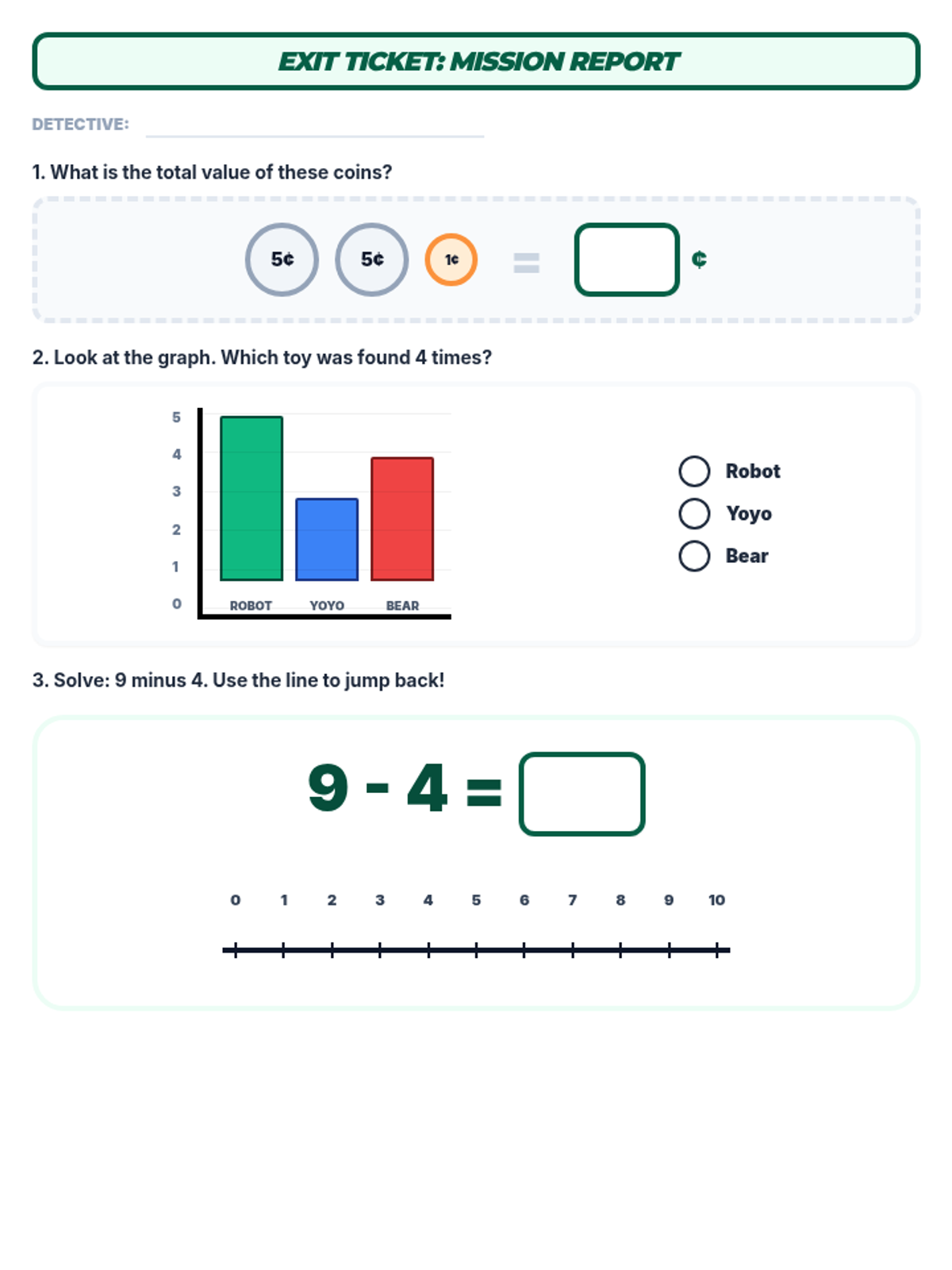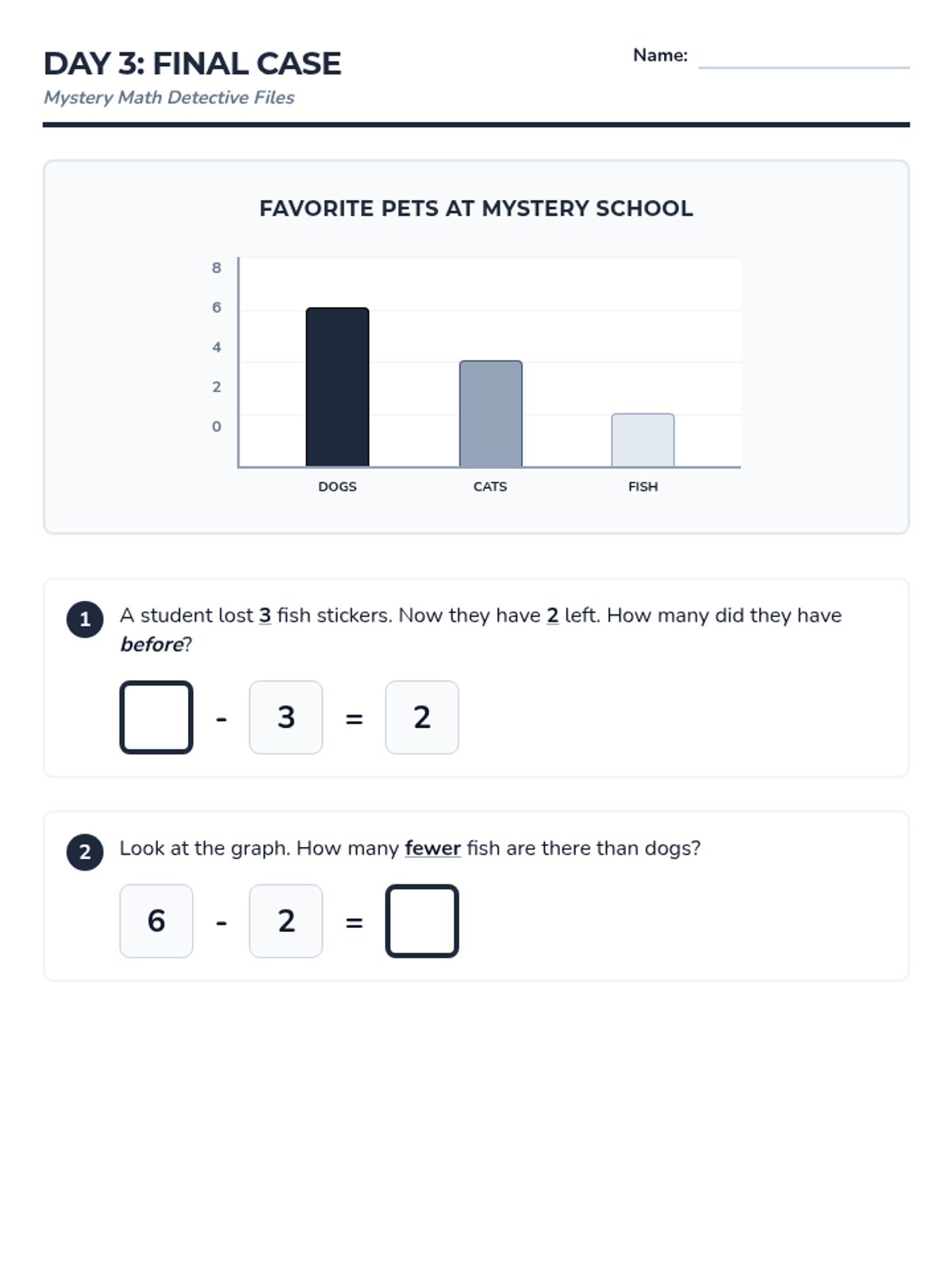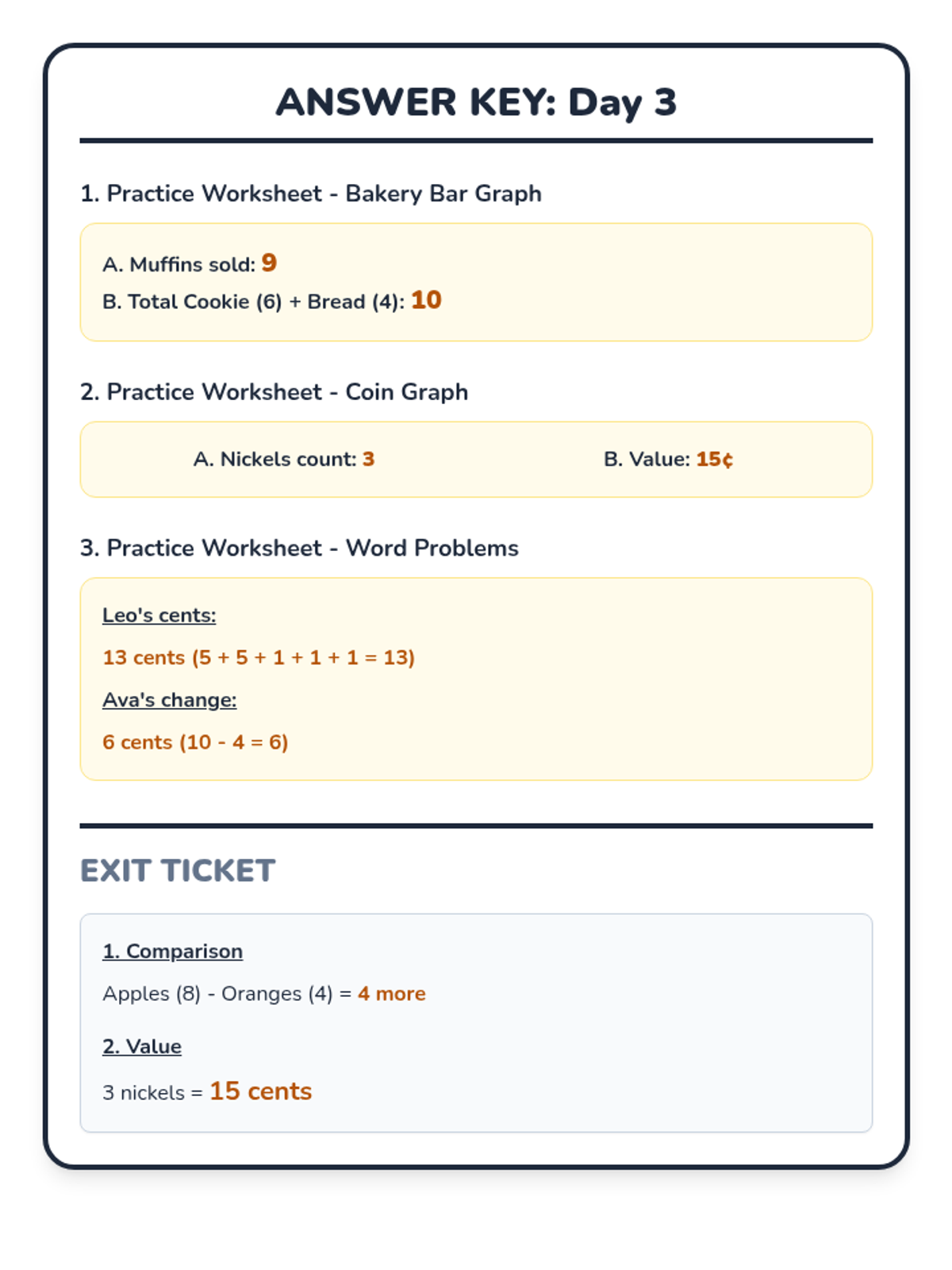 Students count sets of pennies and nickels and analyze data from bar graphs to solve comparison problems. Subtraction skills are reinforced through data-based word problems.