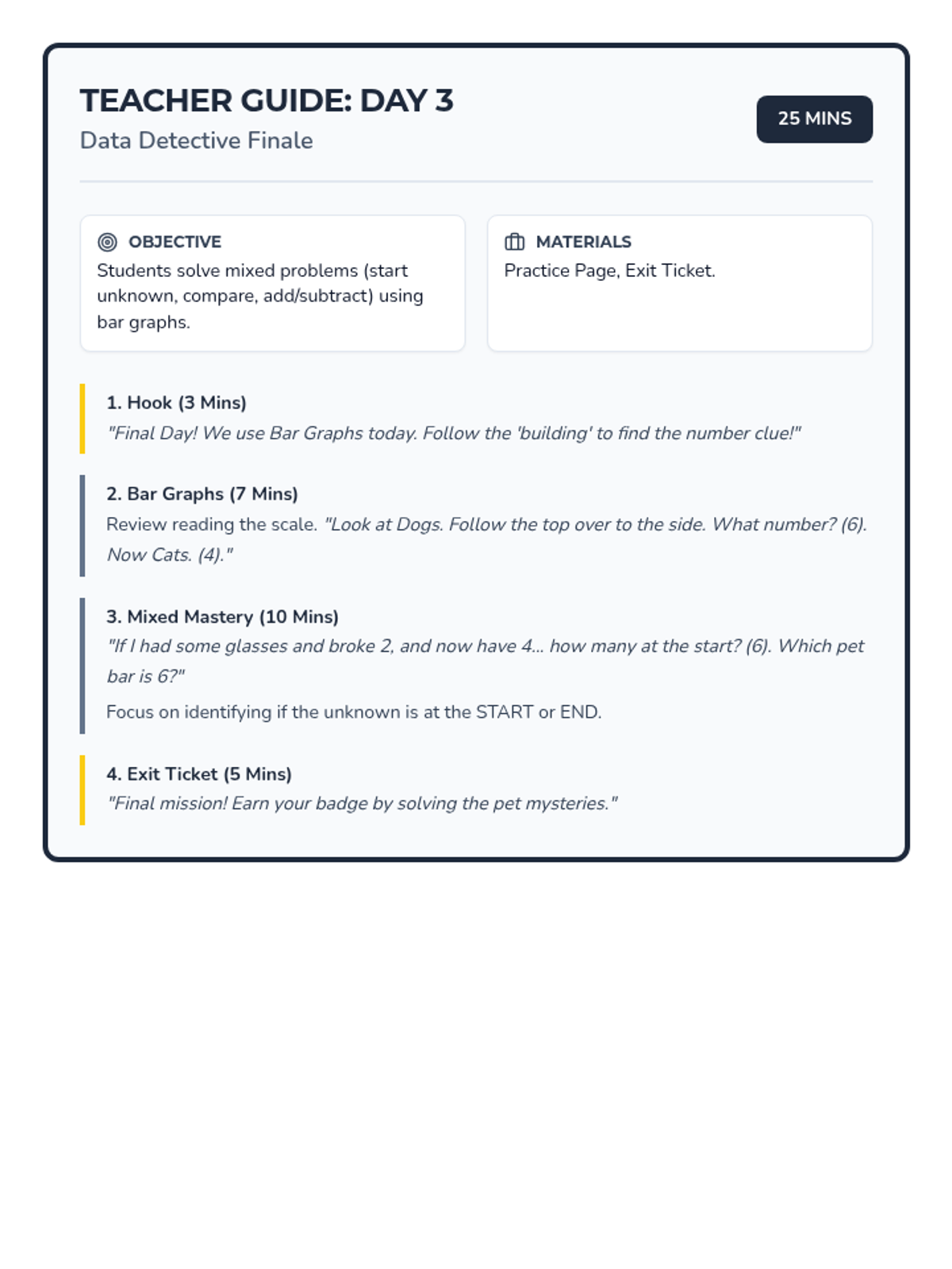 Integrates all previous word problem types (start-unknown, compare, and mix) using simple bar graphs.