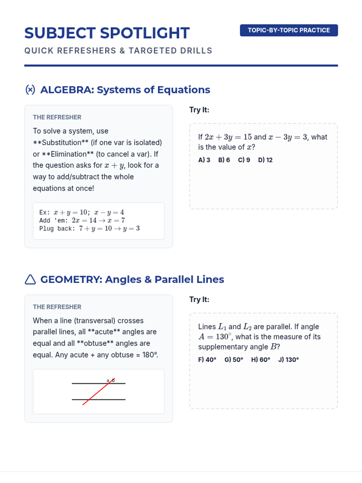 Review critical Geometry and Trigonometry concepts, from SOH CAH TOA to circle properties and coordinate geometry.
