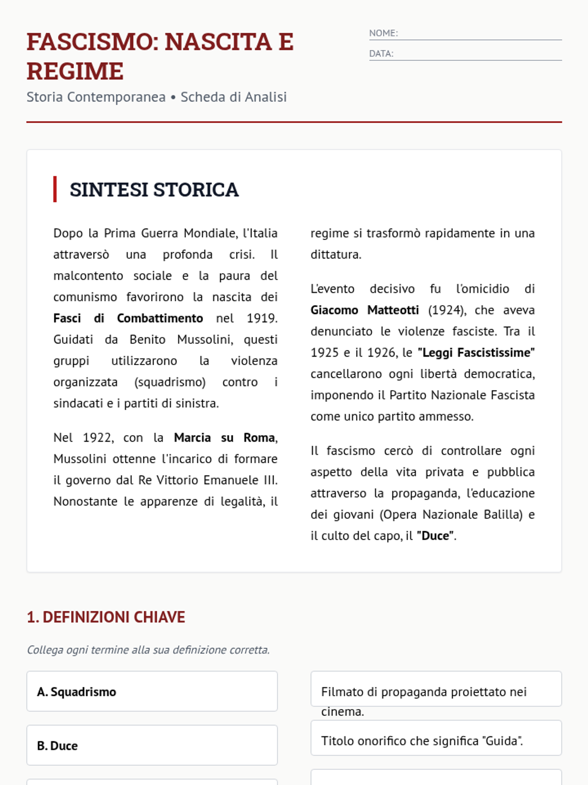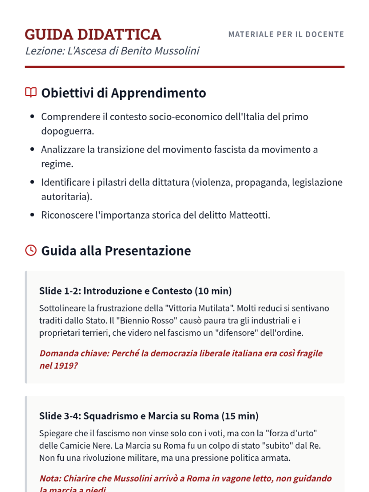 Una lezione approfondita sull'ascesa di Benito Mussolini, il consolidamento del regime fascista e l'impatto della sua dittatura sull'Italia e sul mondo.