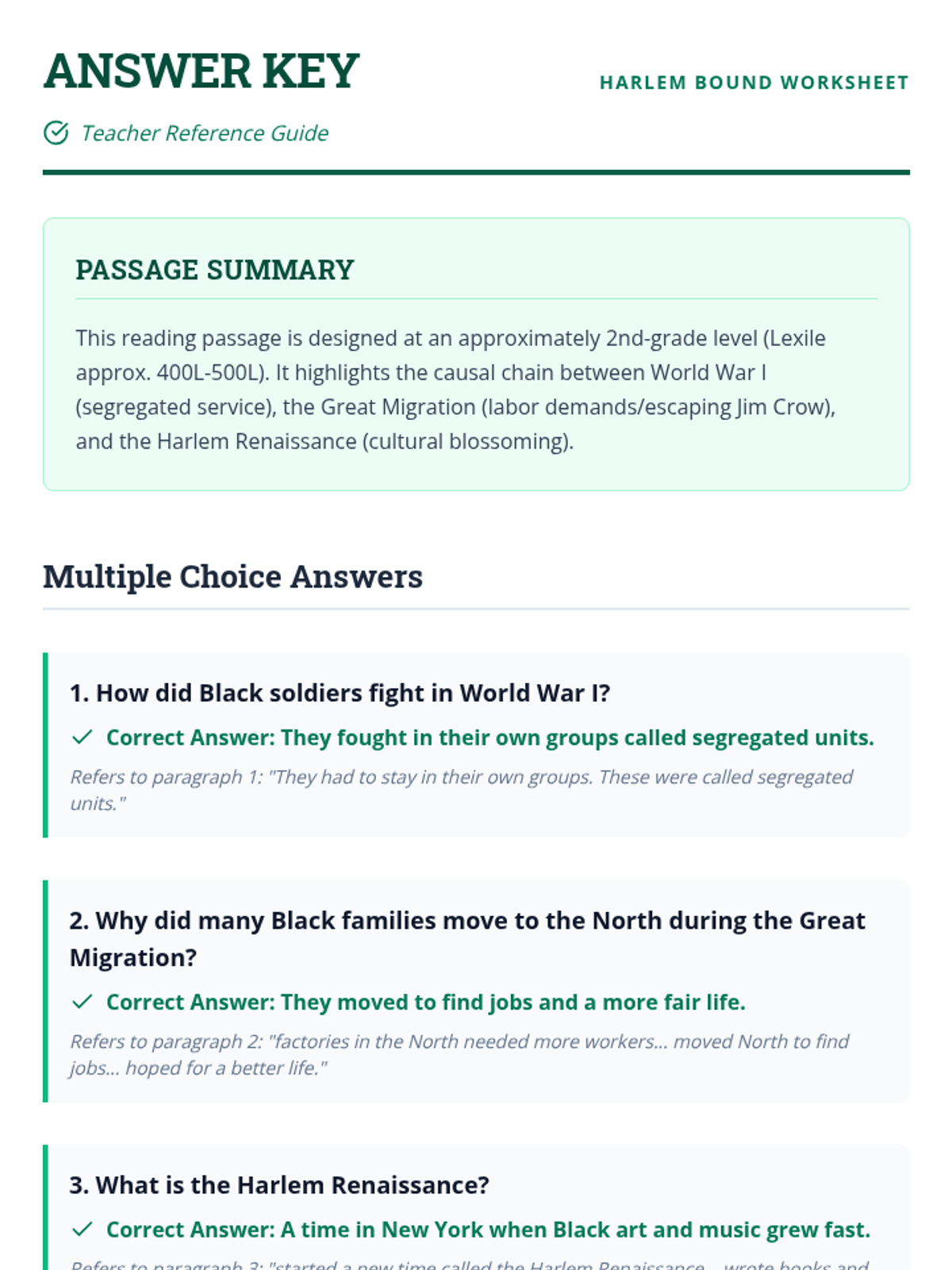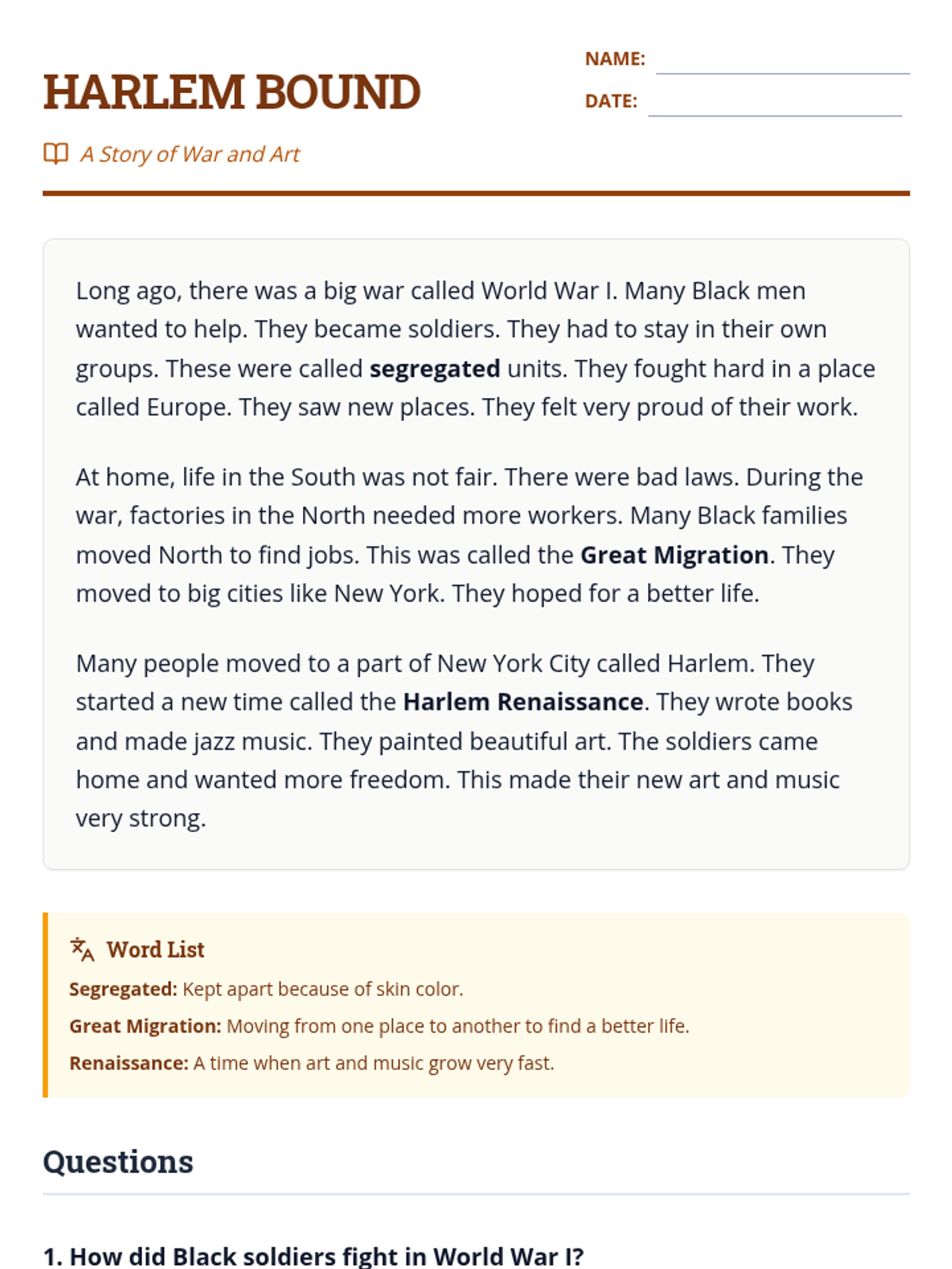 This lesson explores how World War I and the Great Migration led to the cultural explosion of the Harlem Renaissance. Students will read a simplified text and answer comprehension questions.