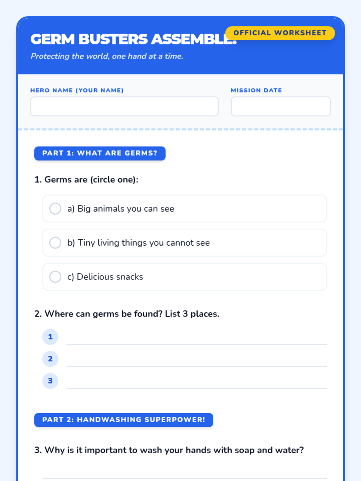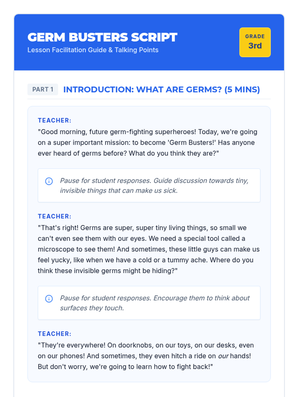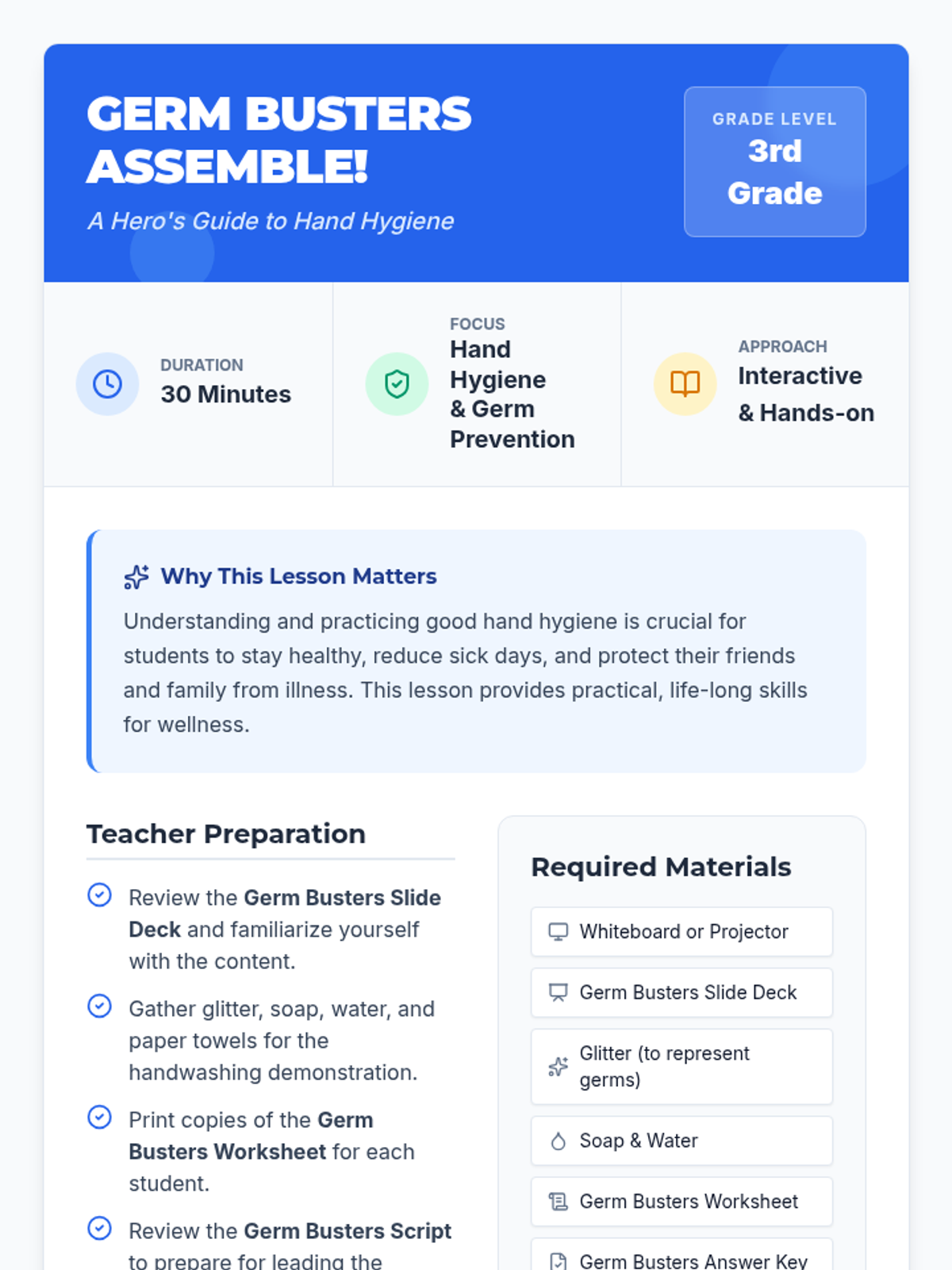 This engaging 30-minute lesson for 3rd-grade students introduces the importance of handwashing and proper hygiene to prevent the spread of germs. Students will learn practical steps to keep themselves and their community healthy.