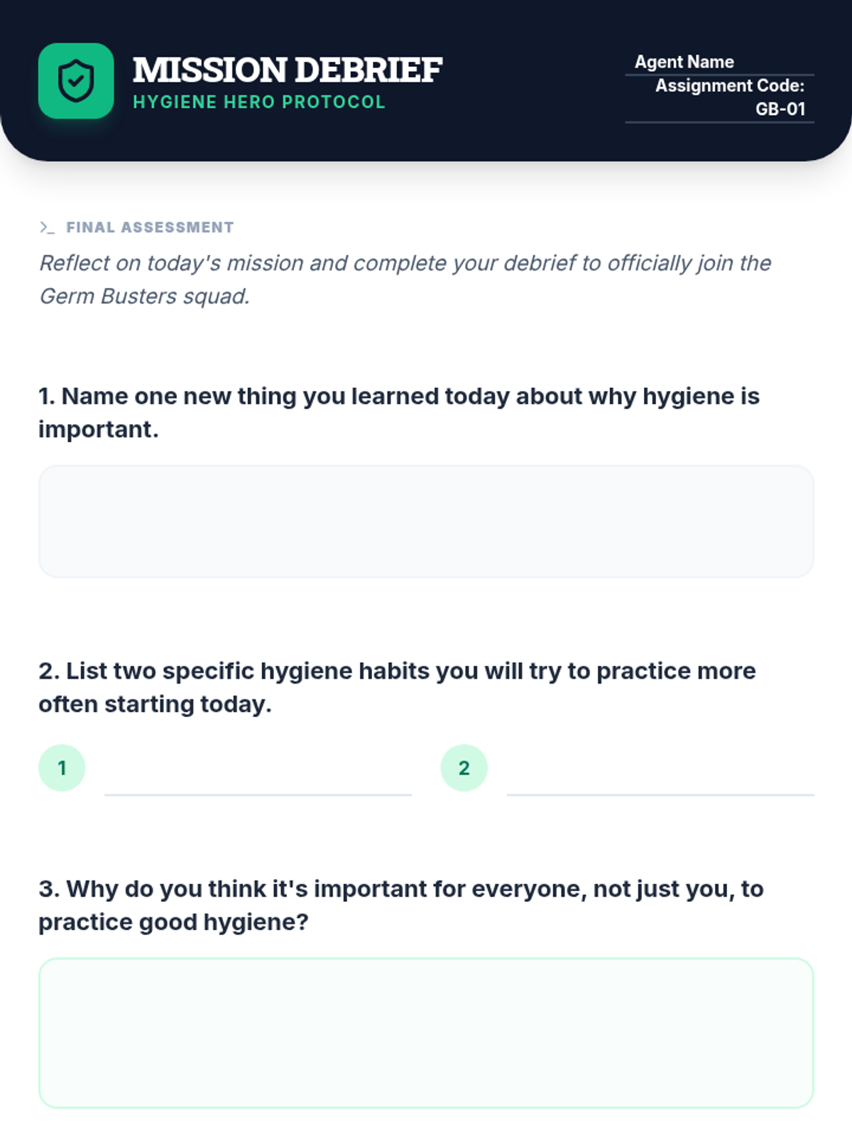 The introductory lesson for the Dirt Destroyers Squad, covering the 'why' of hygiene and the 'how' of daily missions. It includes visual presentations and tools for tracking success across the whole family.
