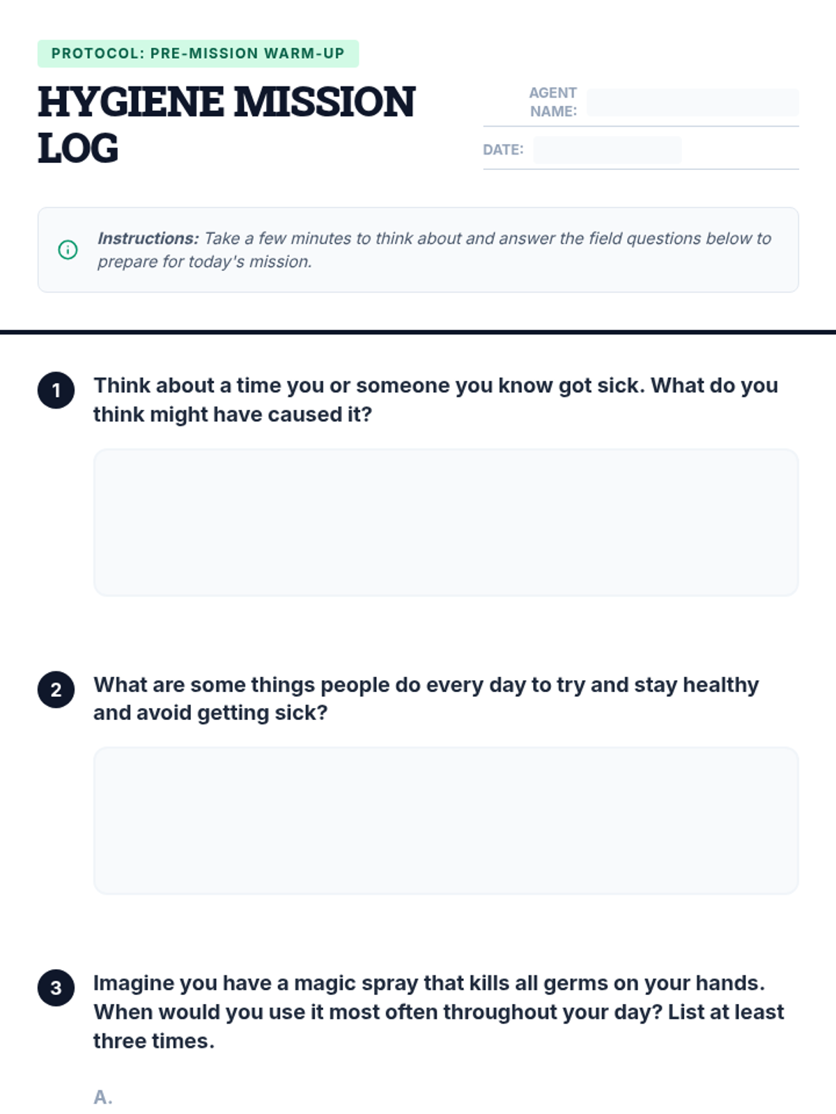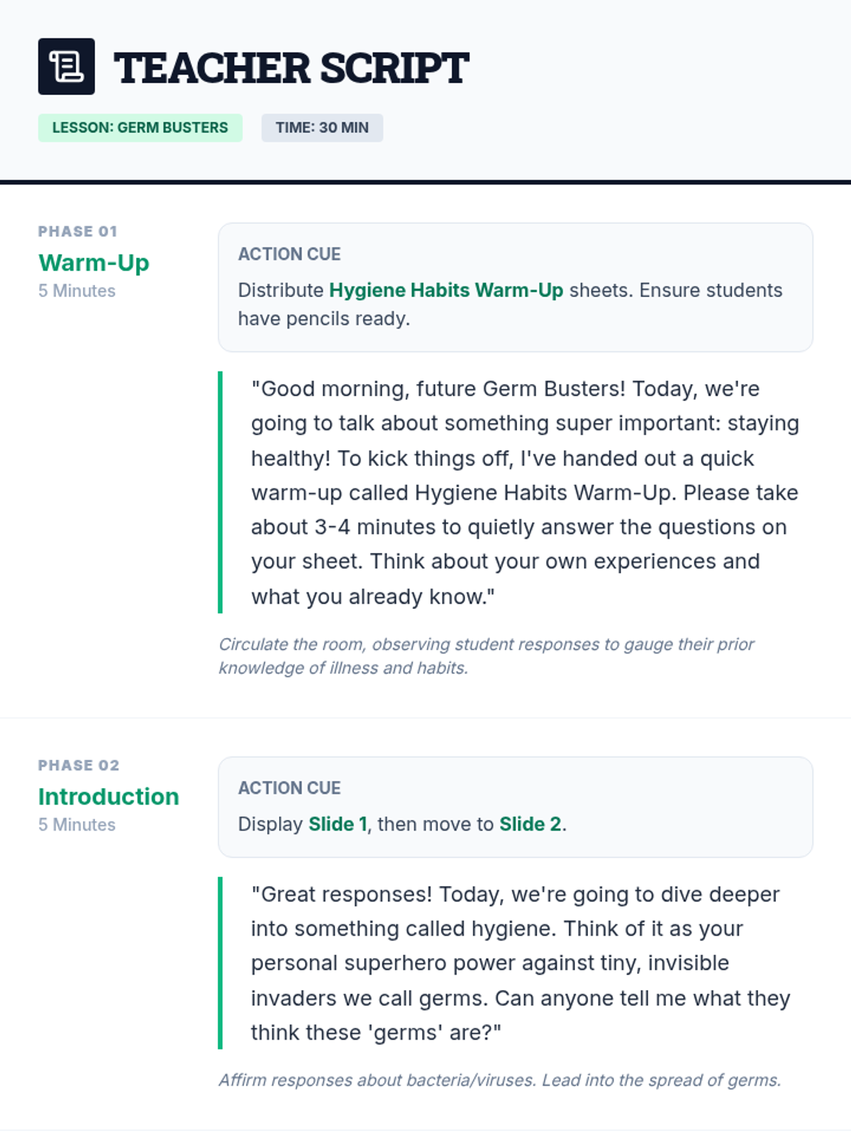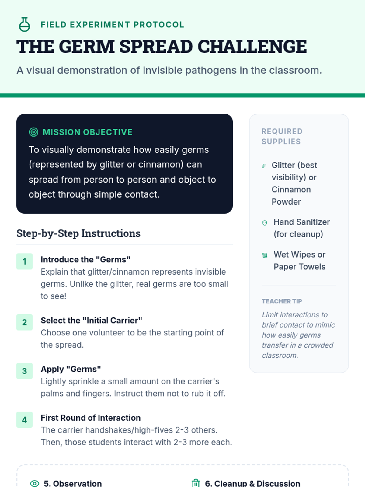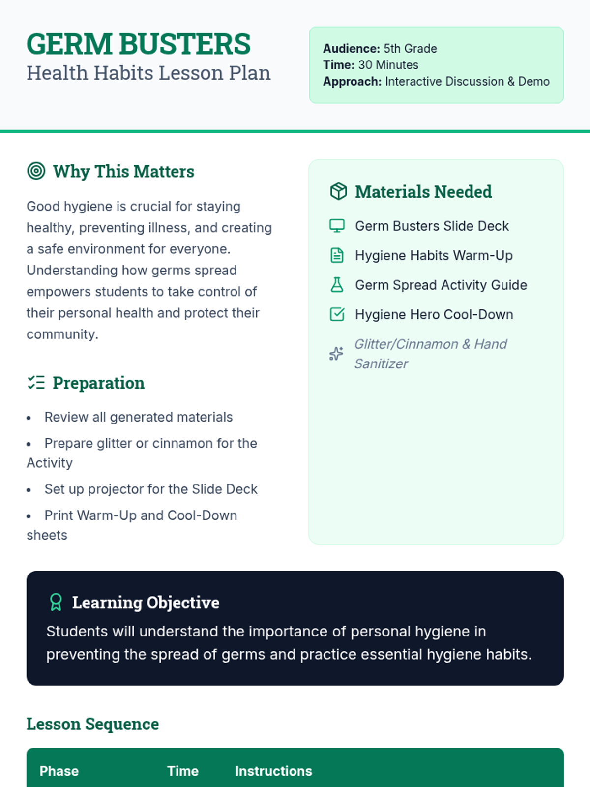 A high-energy, interactive lesson for 5th graders on hygiene, featuring a visual 'germ spread' demonstration and practical health habits.