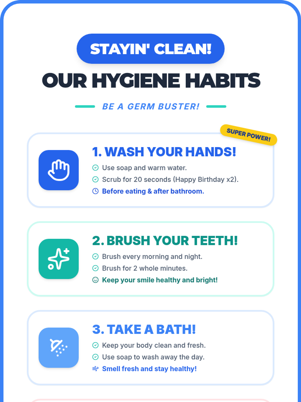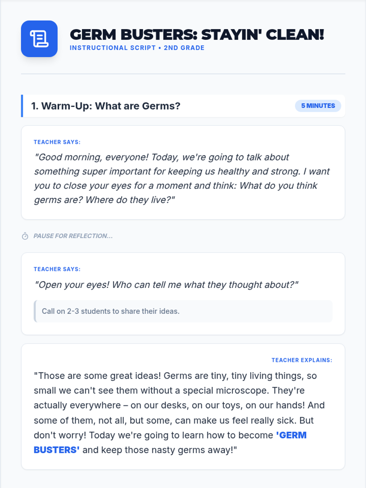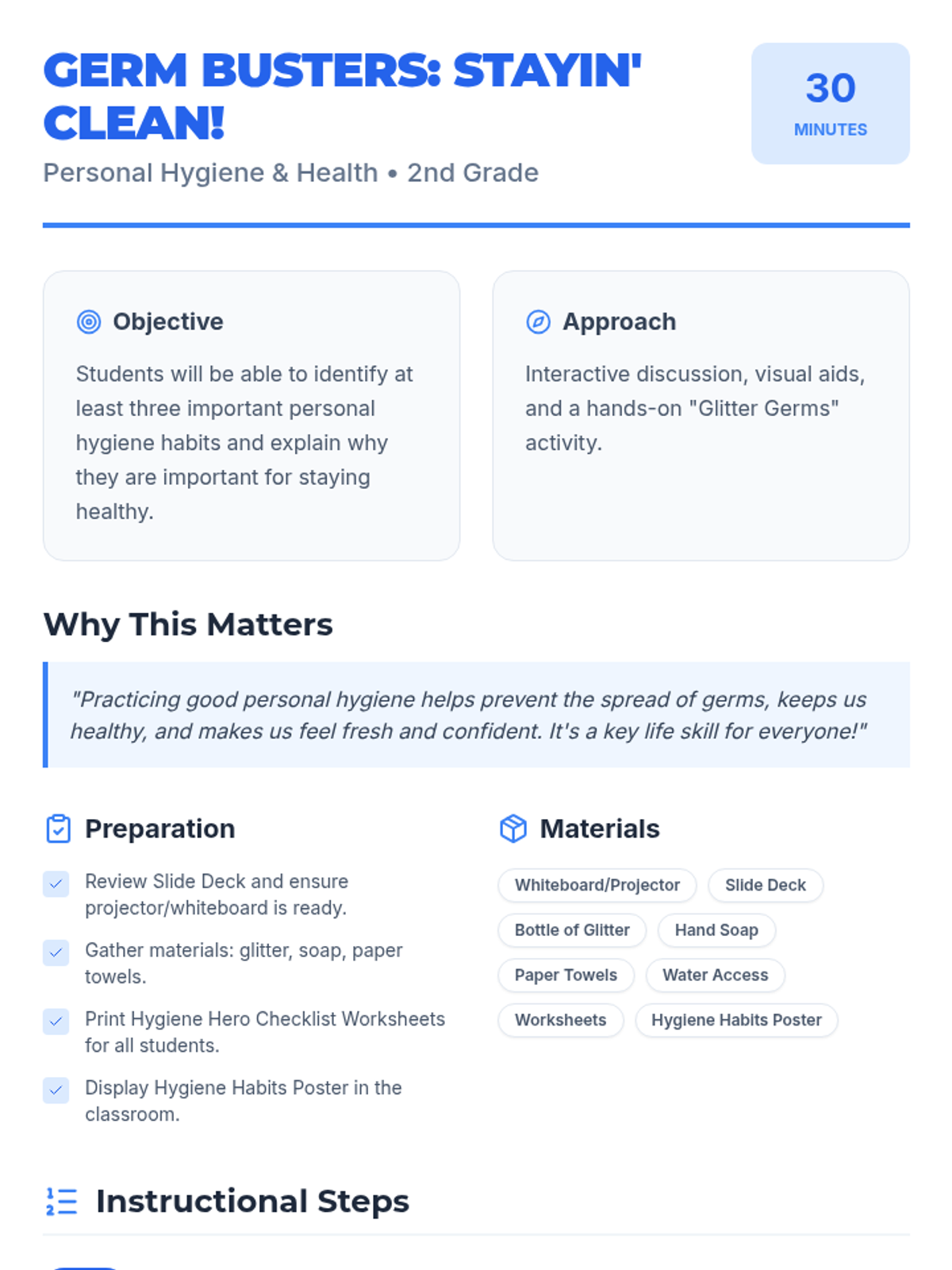 A 30-minute lesson for 2nd graders on personal hygiene habits, using a 'Germ Busters' theme to teach handwashing, teeth brushing, and more.