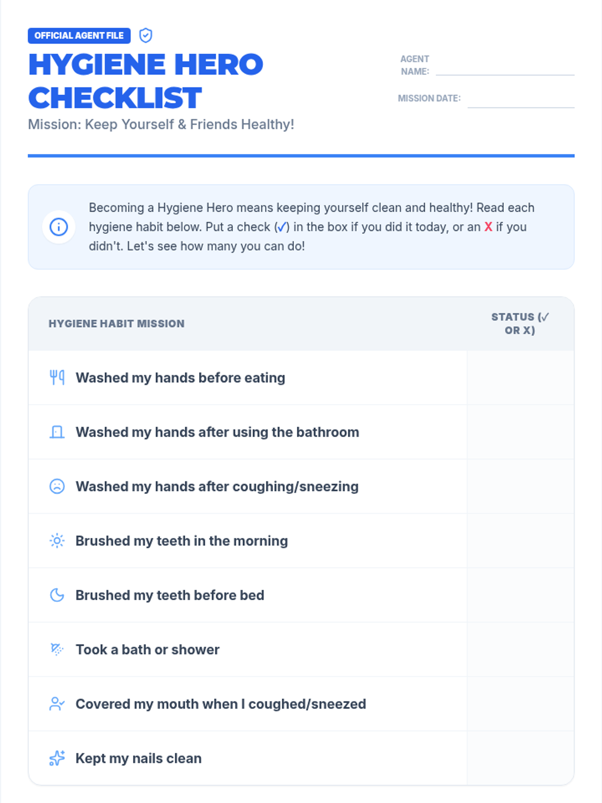The introductory lesson for the Dirt Destroyers Squad, covering the 'why' of hygiene and the 'how' of daily missions. It includes visual presentations and tools for tracking success across the whole family.