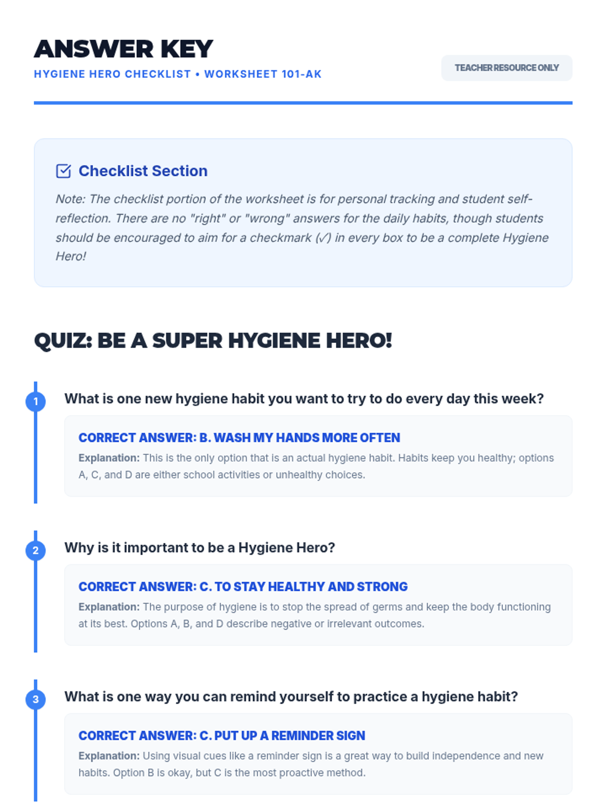 A collection of hygiene reference postcards tailored for elementary, middle school, high school, and adults. Each double-sided card provides empathetic, age-appropriate guidance on essential daily routines to support health and confidence.