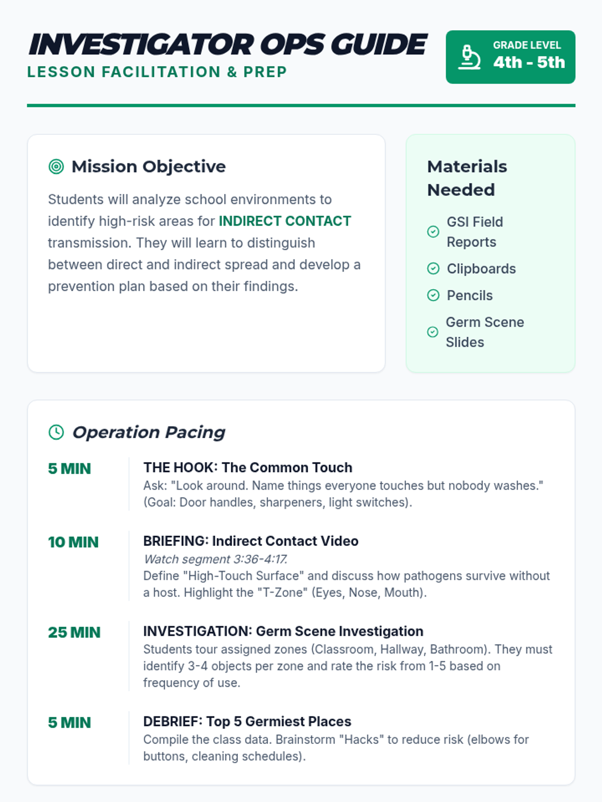 Students become 'Germ Scene Investigators' to identify high-touch surfaces and analyze indirect contact transmission risks in their school environment.