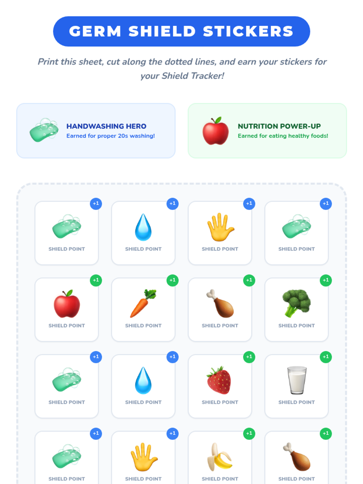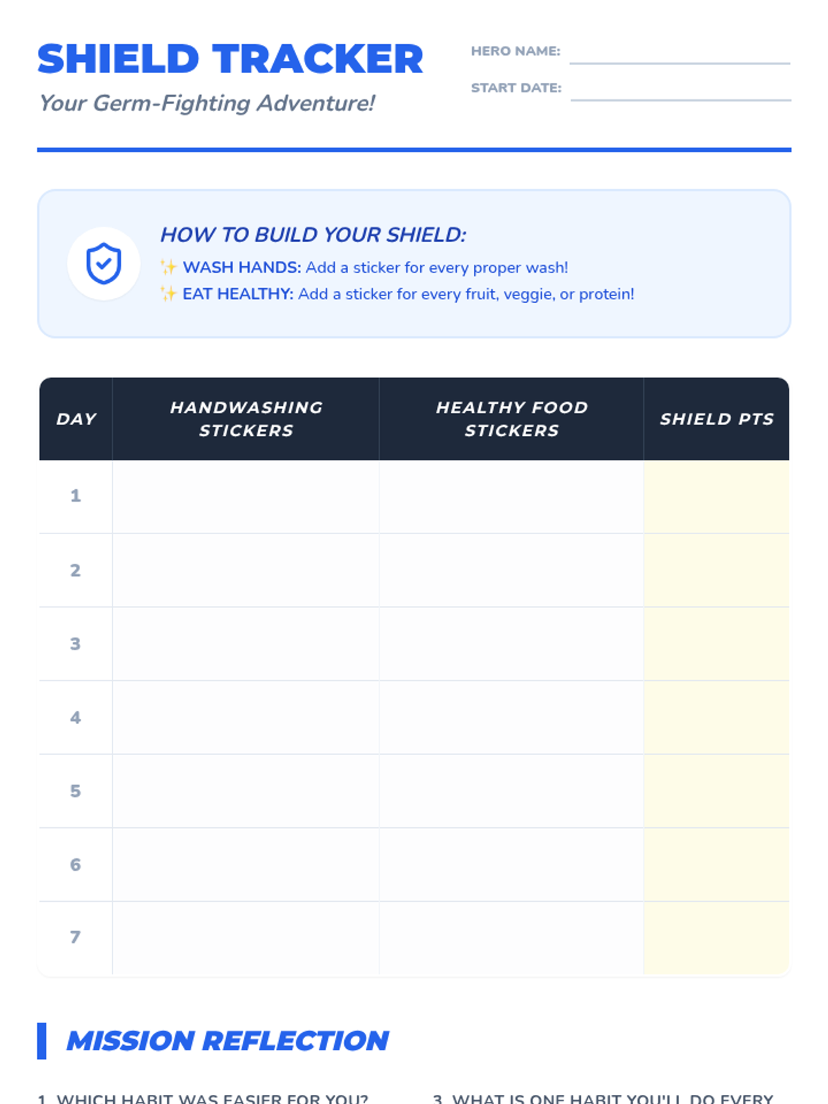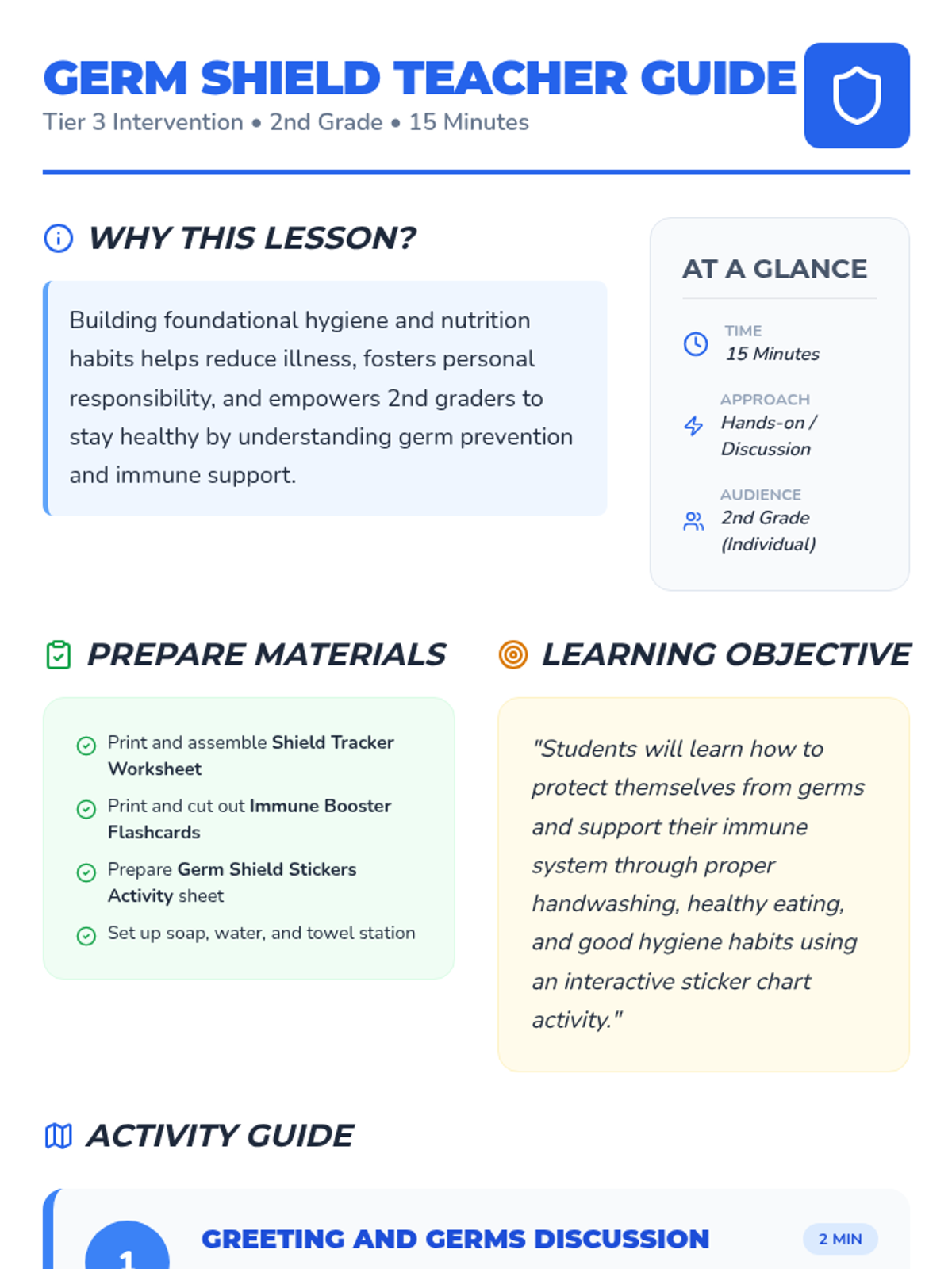 A 15-minute individual Tier 3 lesson for 2nd graders to learn hygiene and nutrition habits through a heroic germ-fighting adventure.