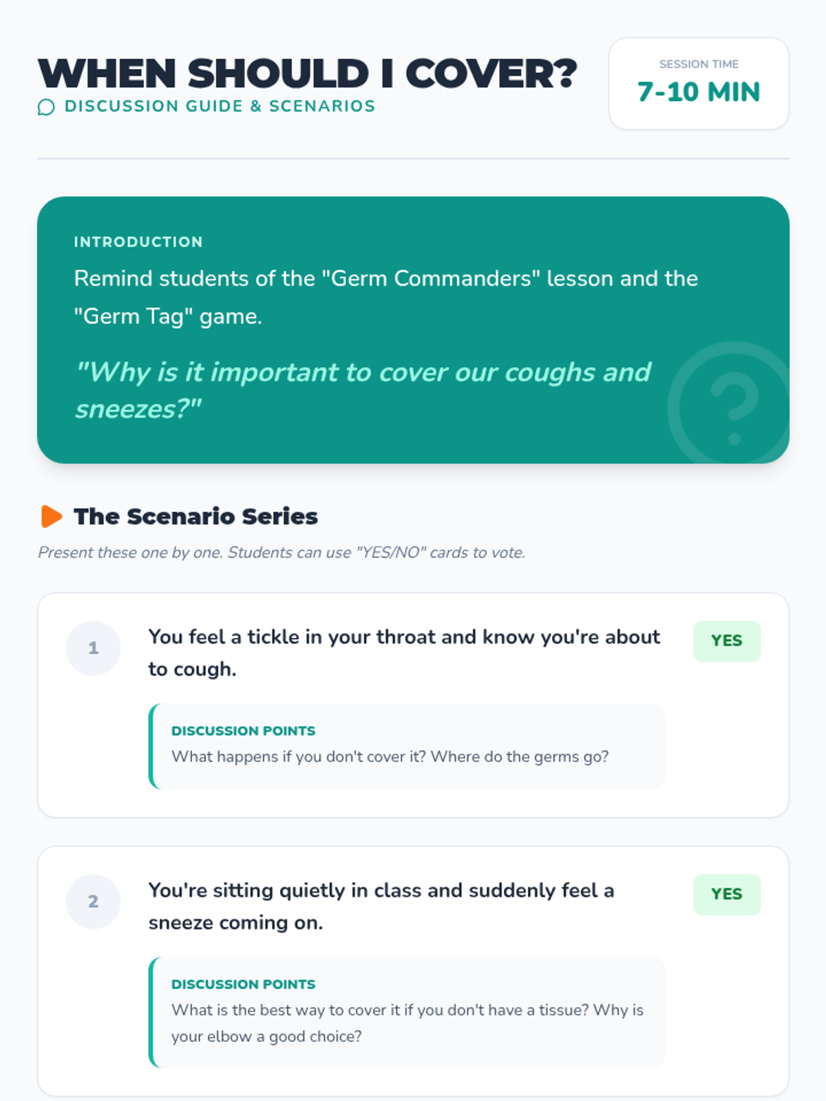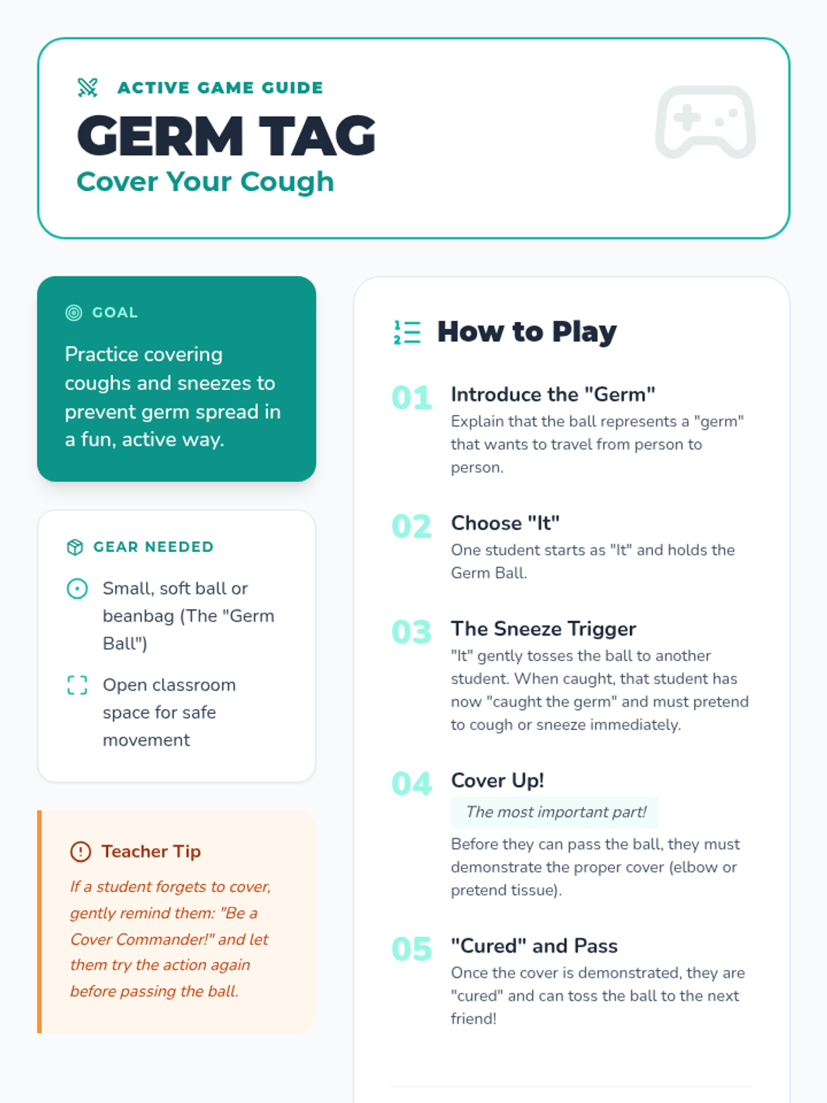 A fun, interactive session using games to reinforce hygiene practices like covering coughs and sneezes. This small group activity makes learning about germ etiquette engaging and memorable.