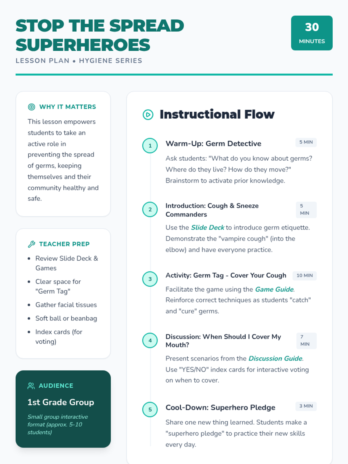 A high-energy lesson for 1st graders on the importance of cleanliness, focusing on germ prevention in shared spaces and organized toy management. Students learn to identify 'germ hotspots' and master the 'Tidy Hero' method for cleaning their rooms.