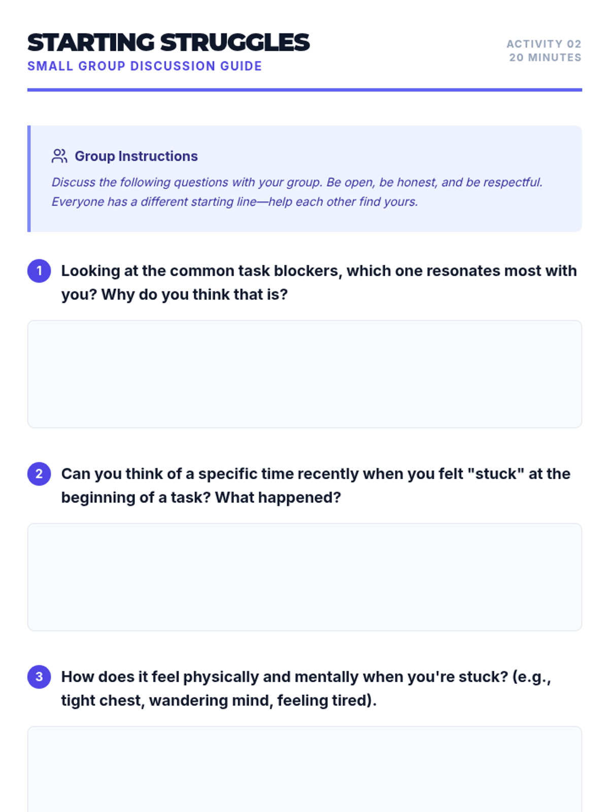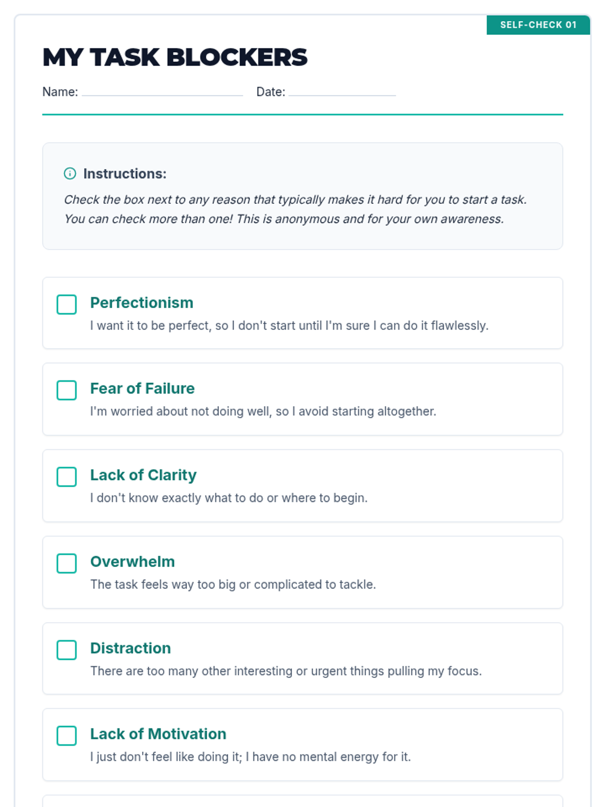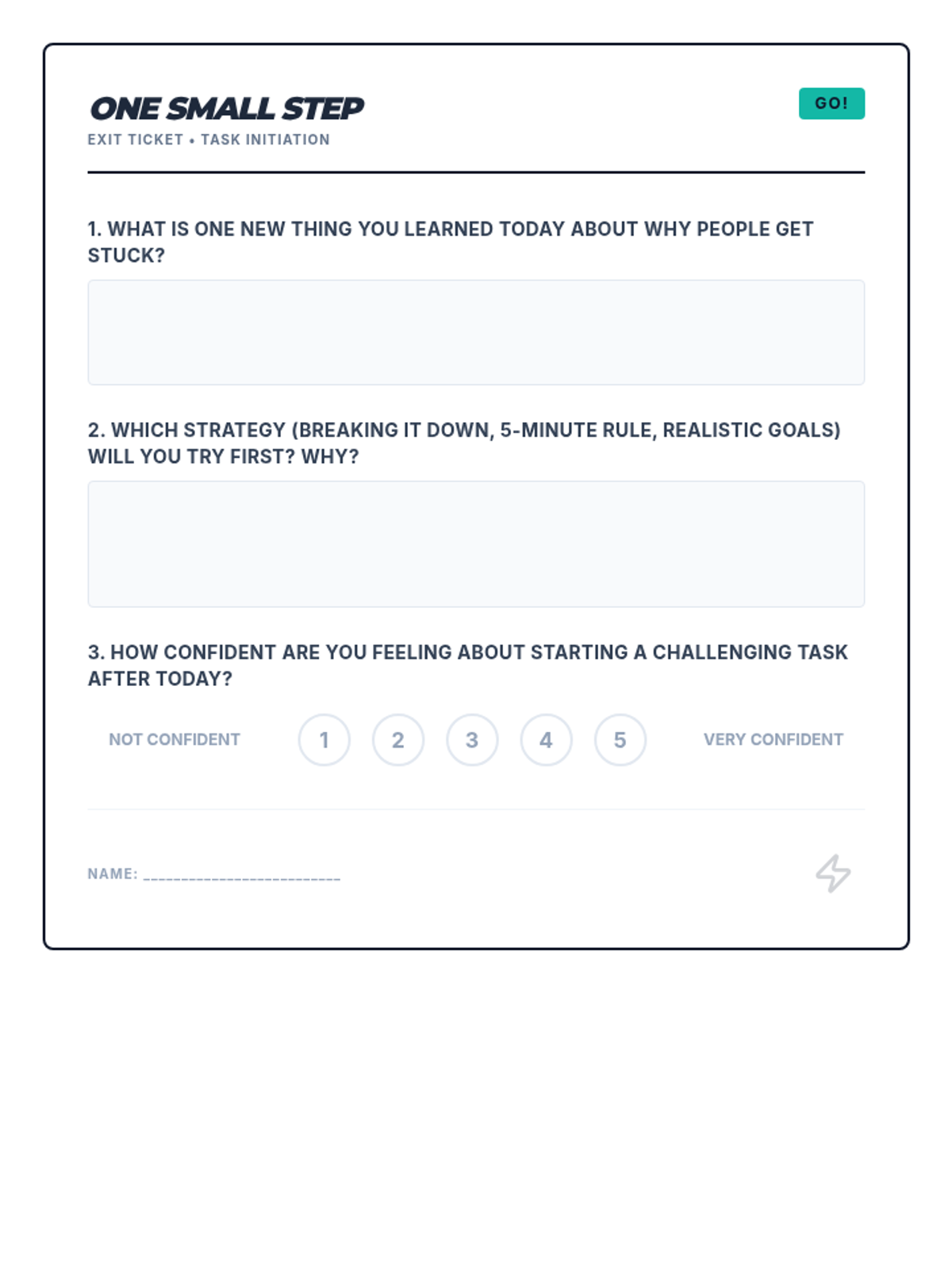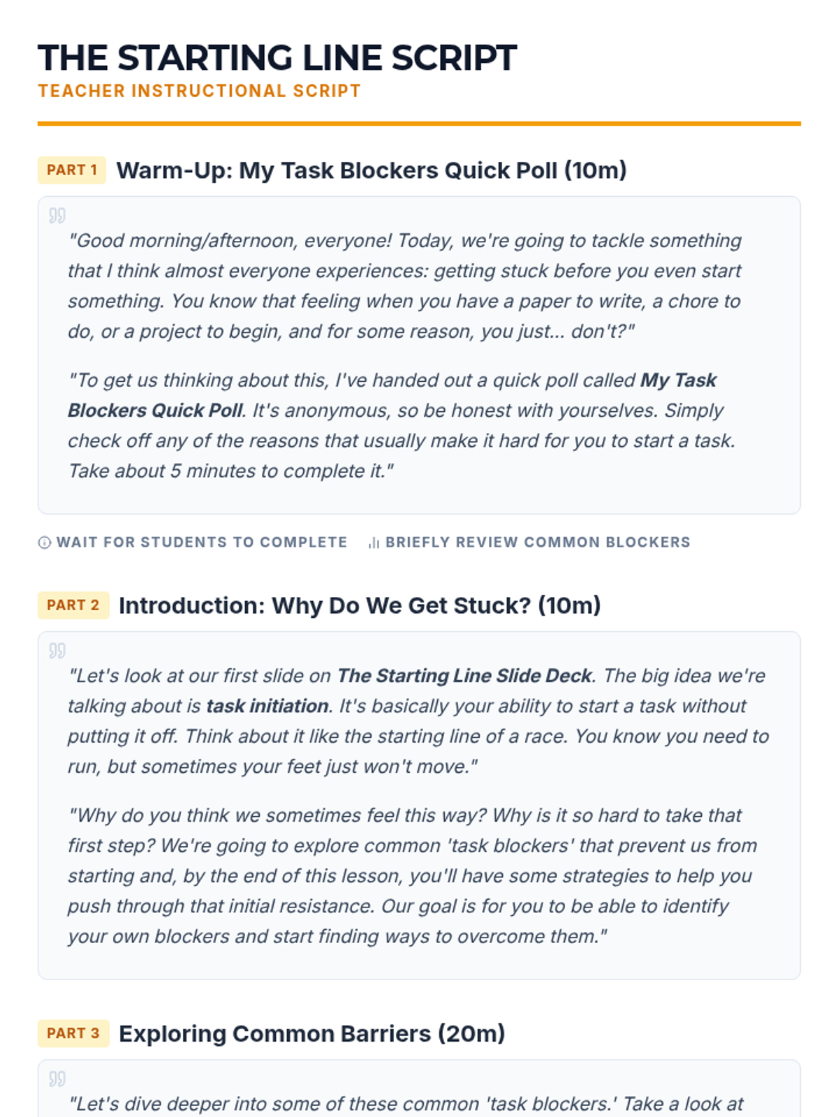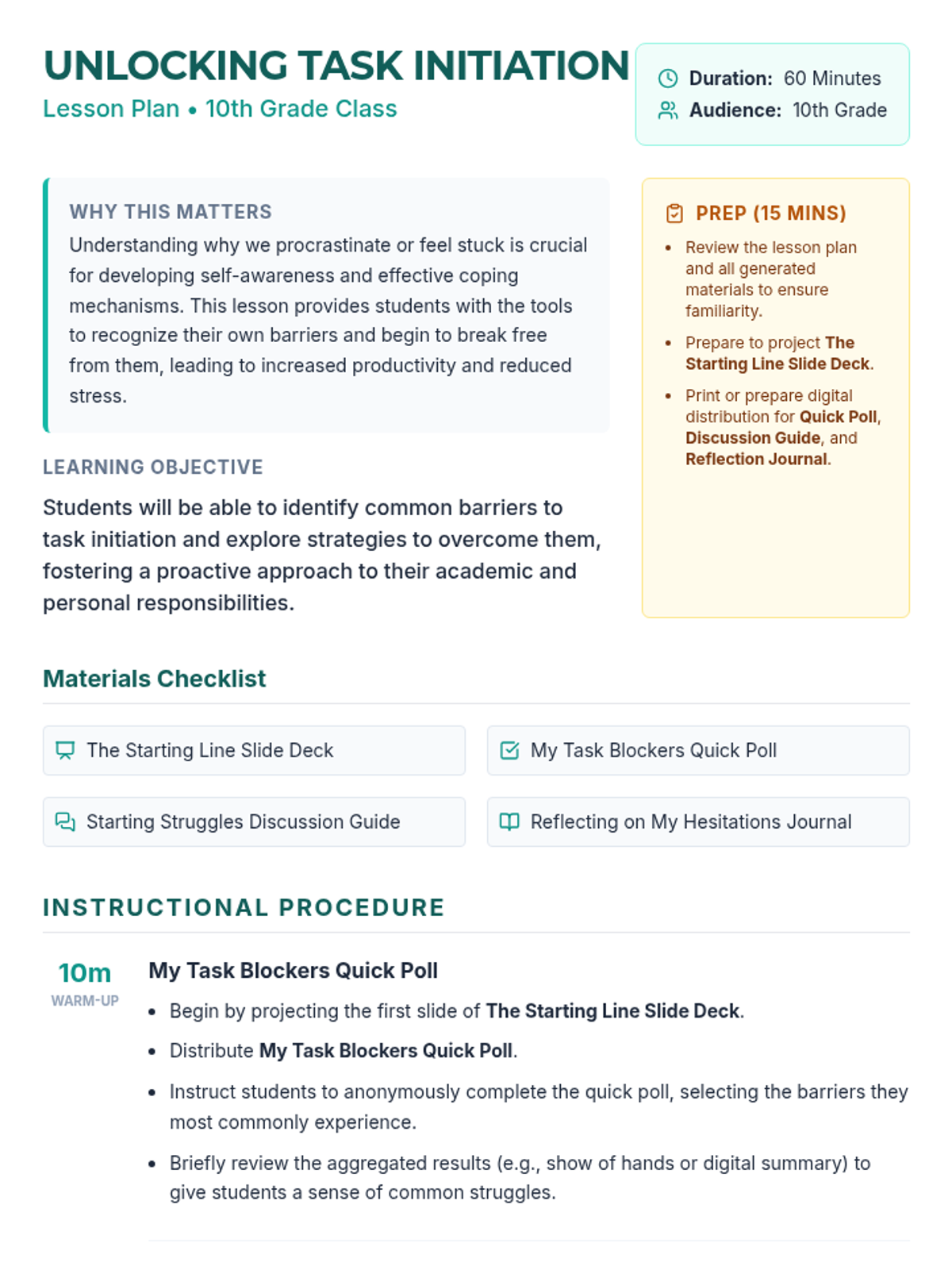 This lesson helps 10th-grade students identify common barriers to task initiation, such as perfectionism and overwhelm, and provides actionable strategies like the 5-minute rule to help them get started.