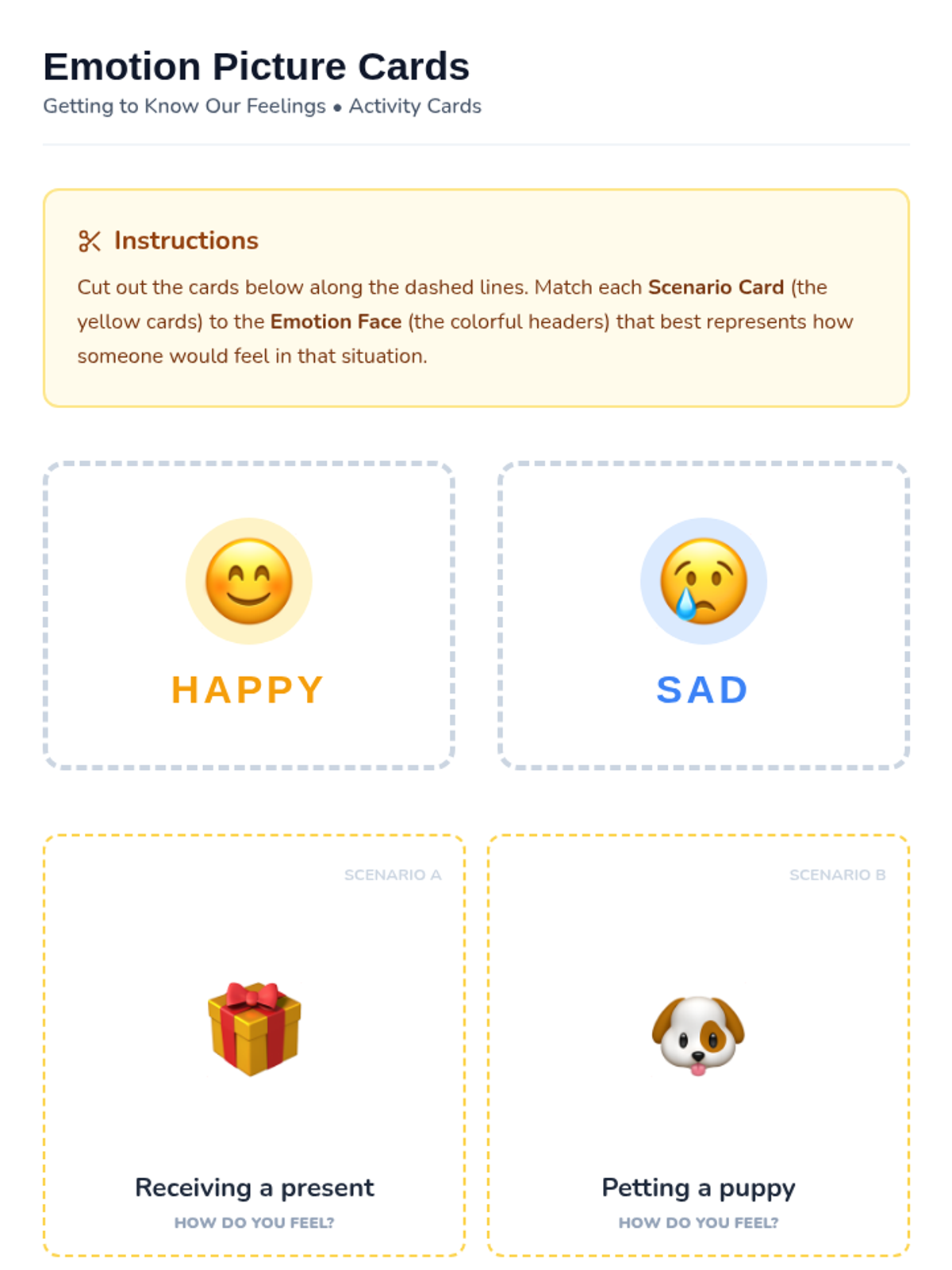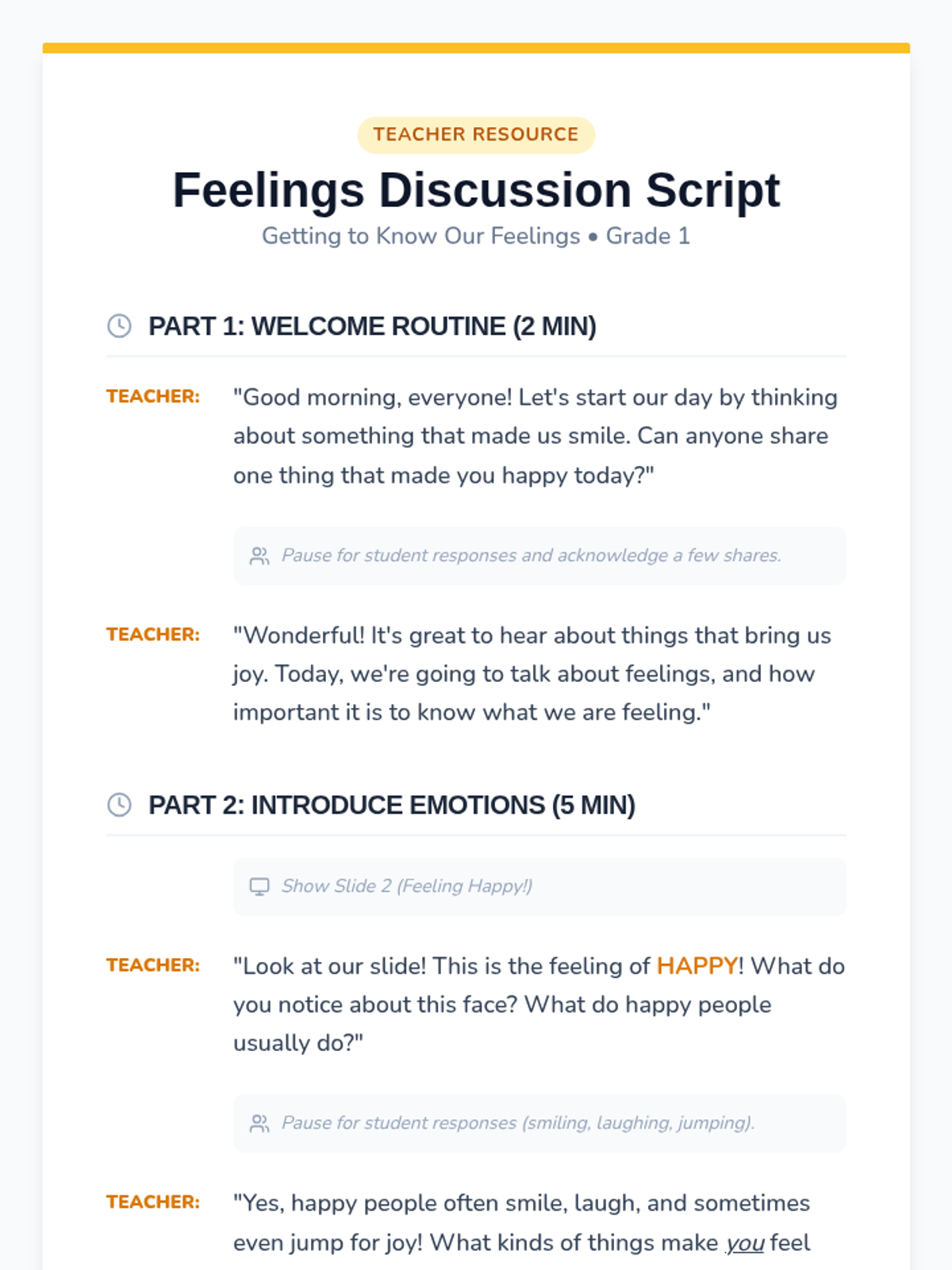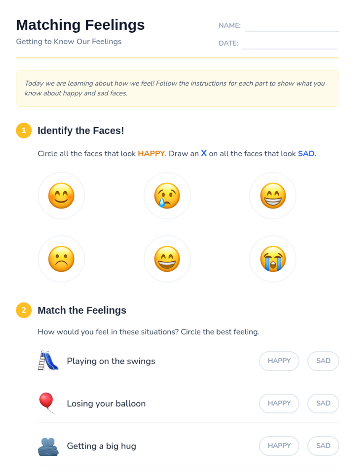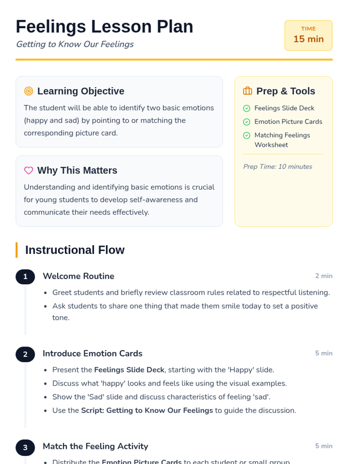 A 15-minute introductory lesson for 1st graders to identify and distinguish between happy and sad emotions through interactive visuals and matching activities.
