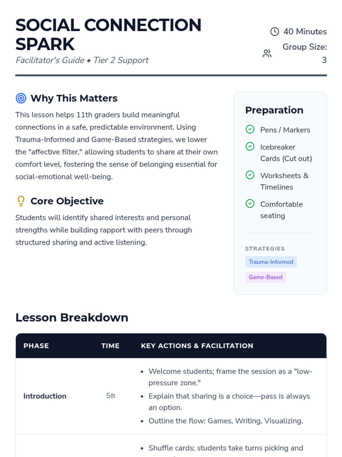 A Trauma-Informed, Game-Based lesson designed to foster connection and community among 11th-grade students through icebreakers, personal reflection, and shared timelines.