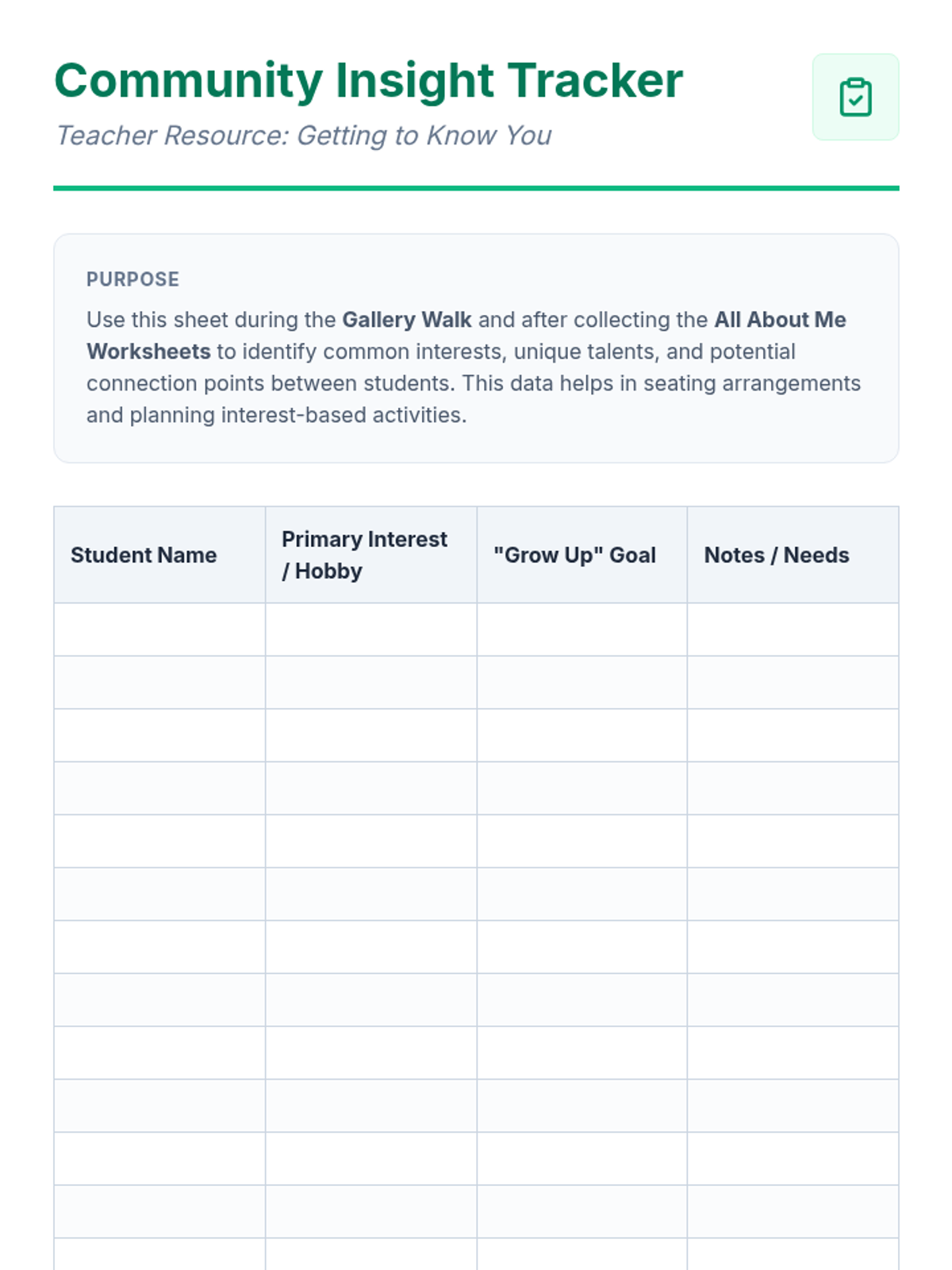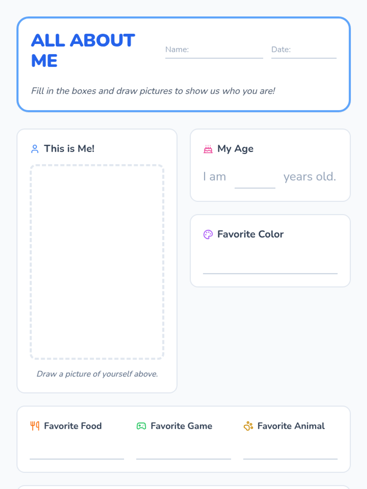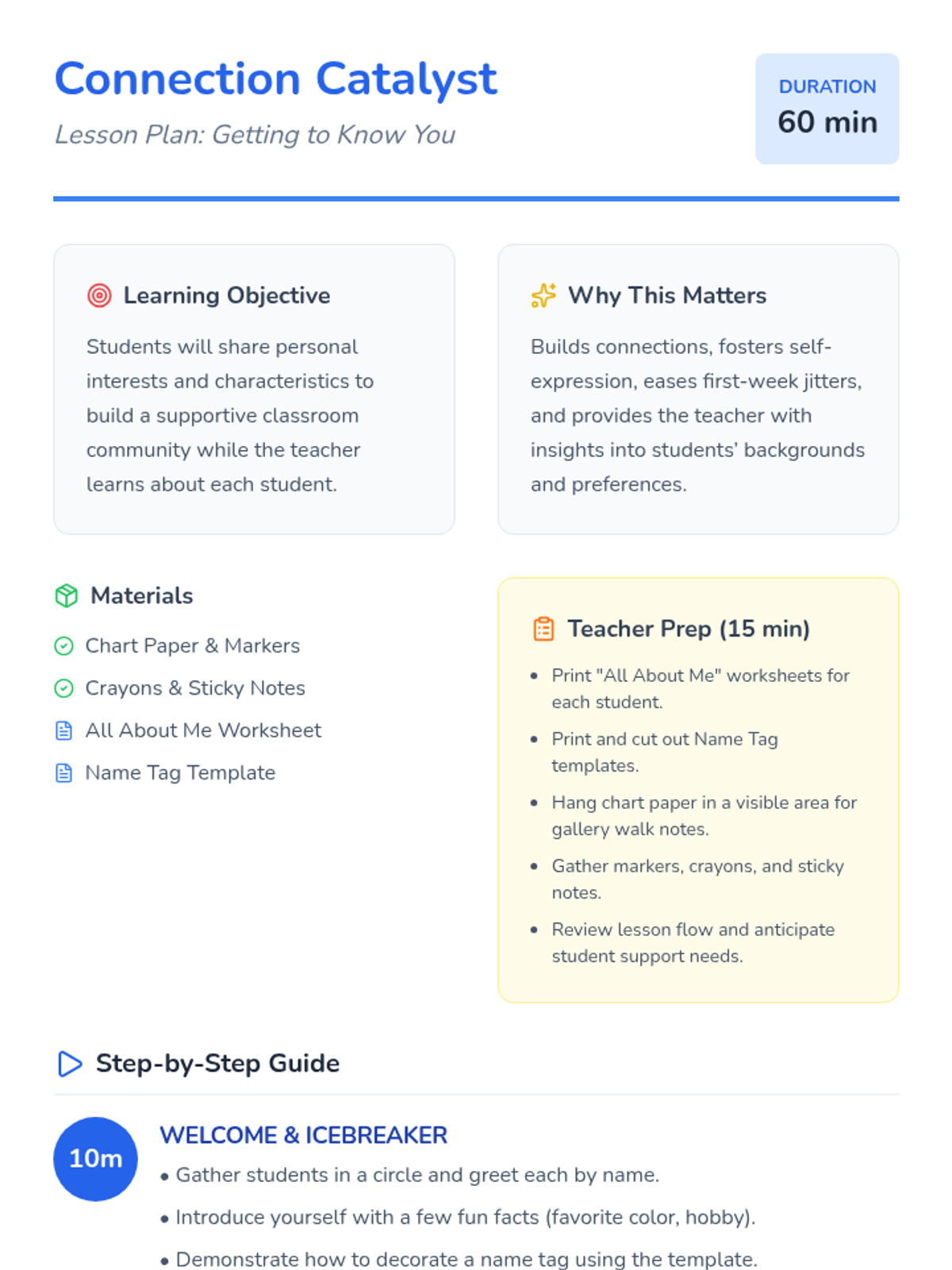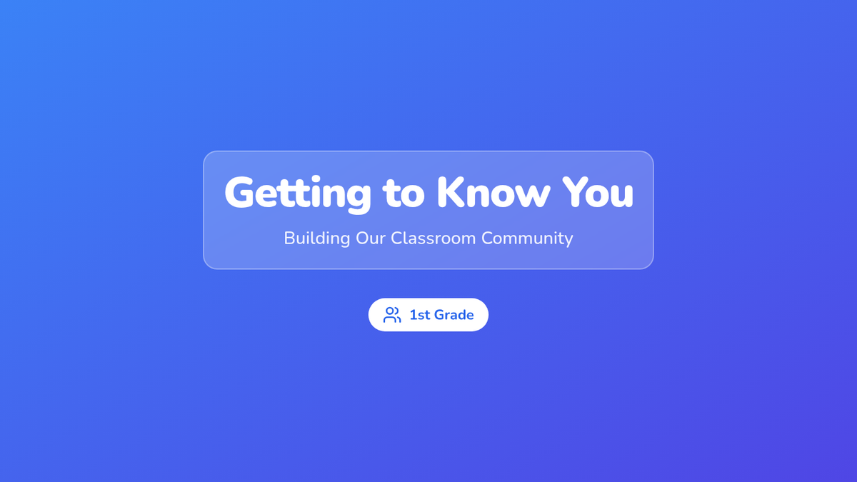 A 60-minute introductory lesson for 1st graders focused on building community, exploring identity, and sharing personal interests through interactive activities and creative expression.