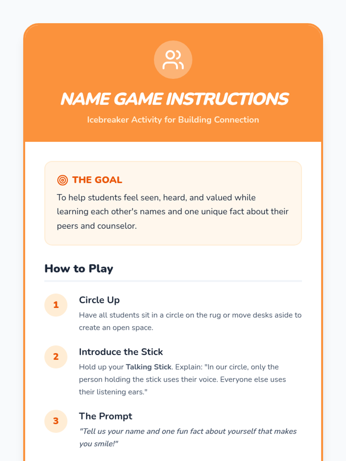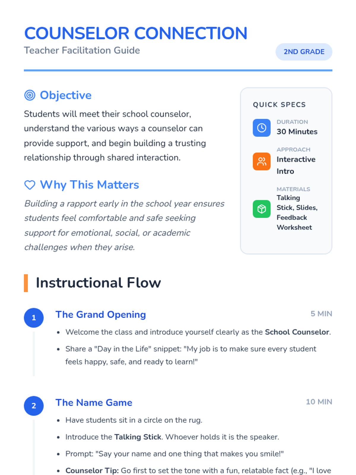 An introductory lesson for 2nd-grade students to meet their school counselor, understand the counselor's role in the school, and build initial rapport through interactive games and activities.