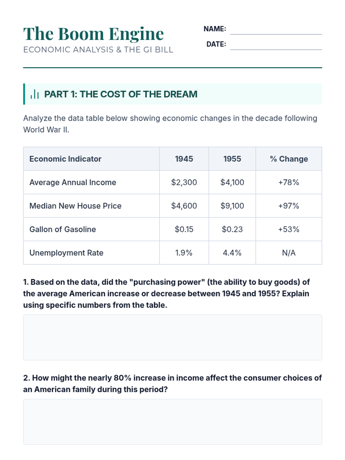 Students analyze economic data and the GI Bill to understand the drivers of post-war prosperity and the systemic inequalities in benefit distribution.