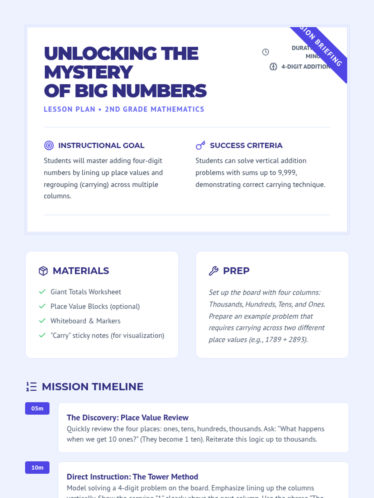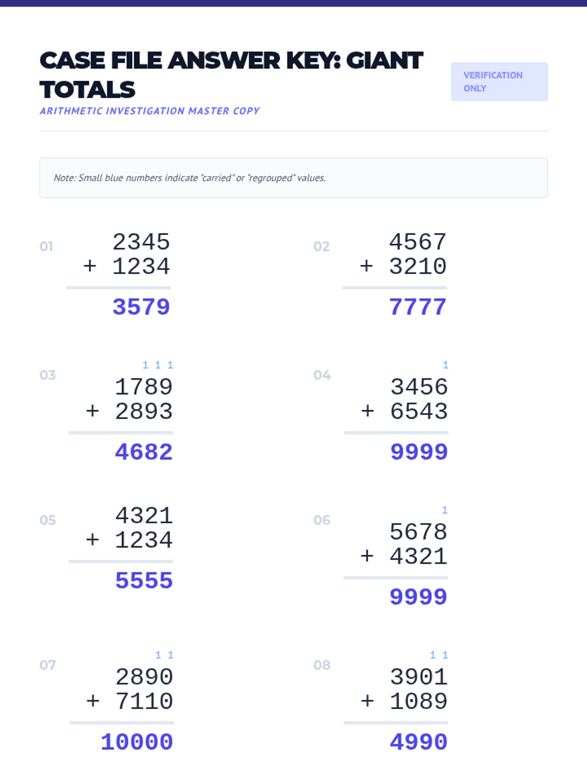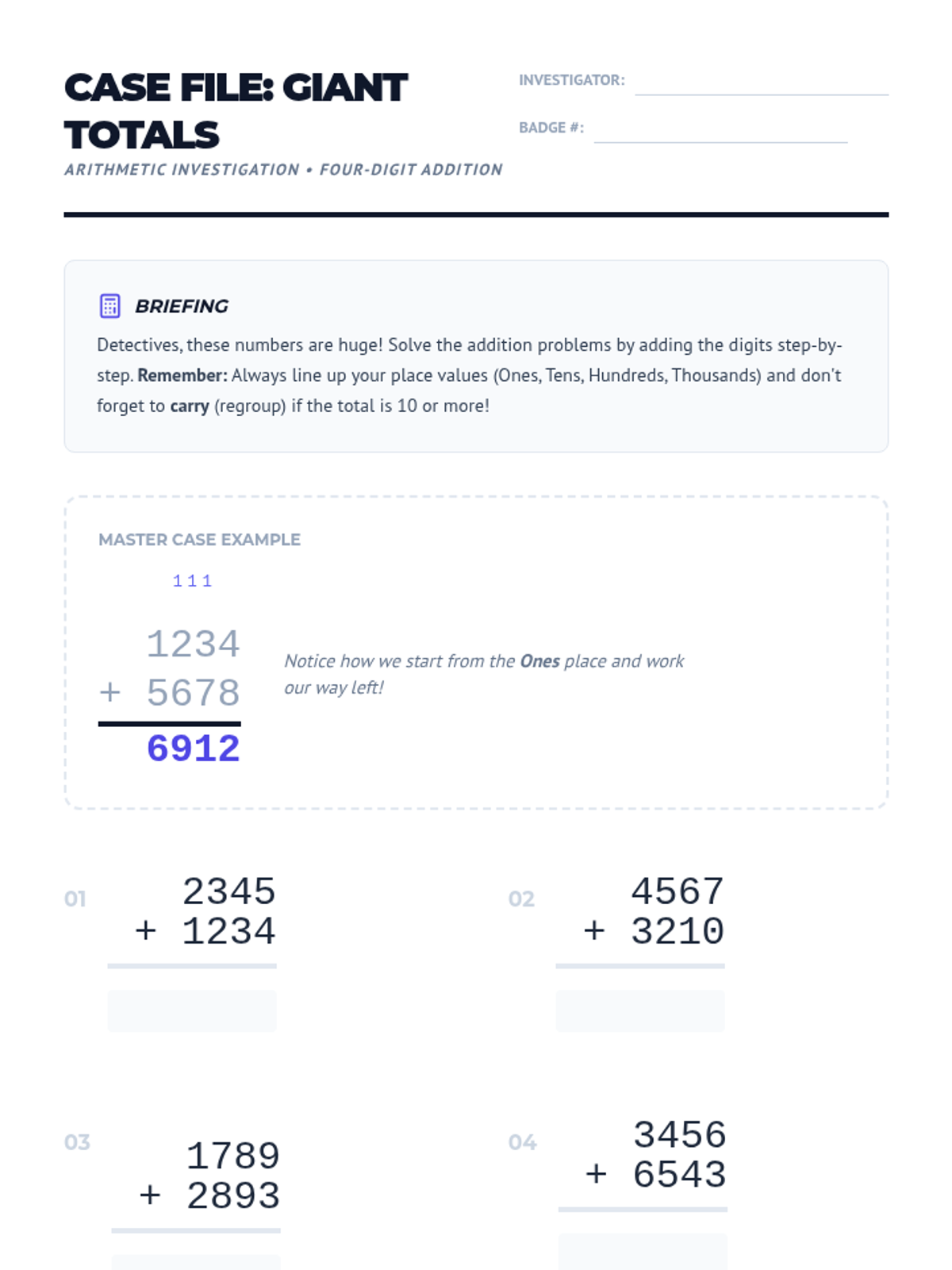 Students master adding four-digit numbers by lining up place values and carrying when necessary, unlocking the "mystery" of large sums.