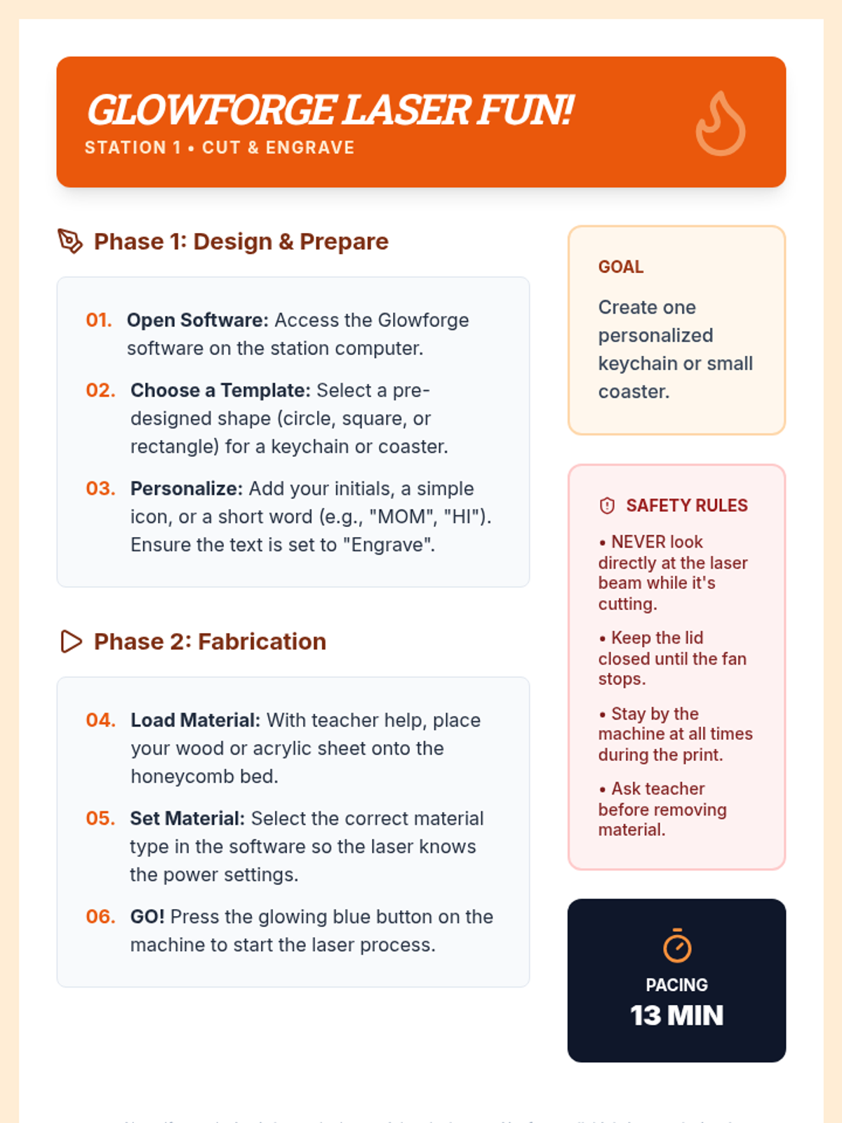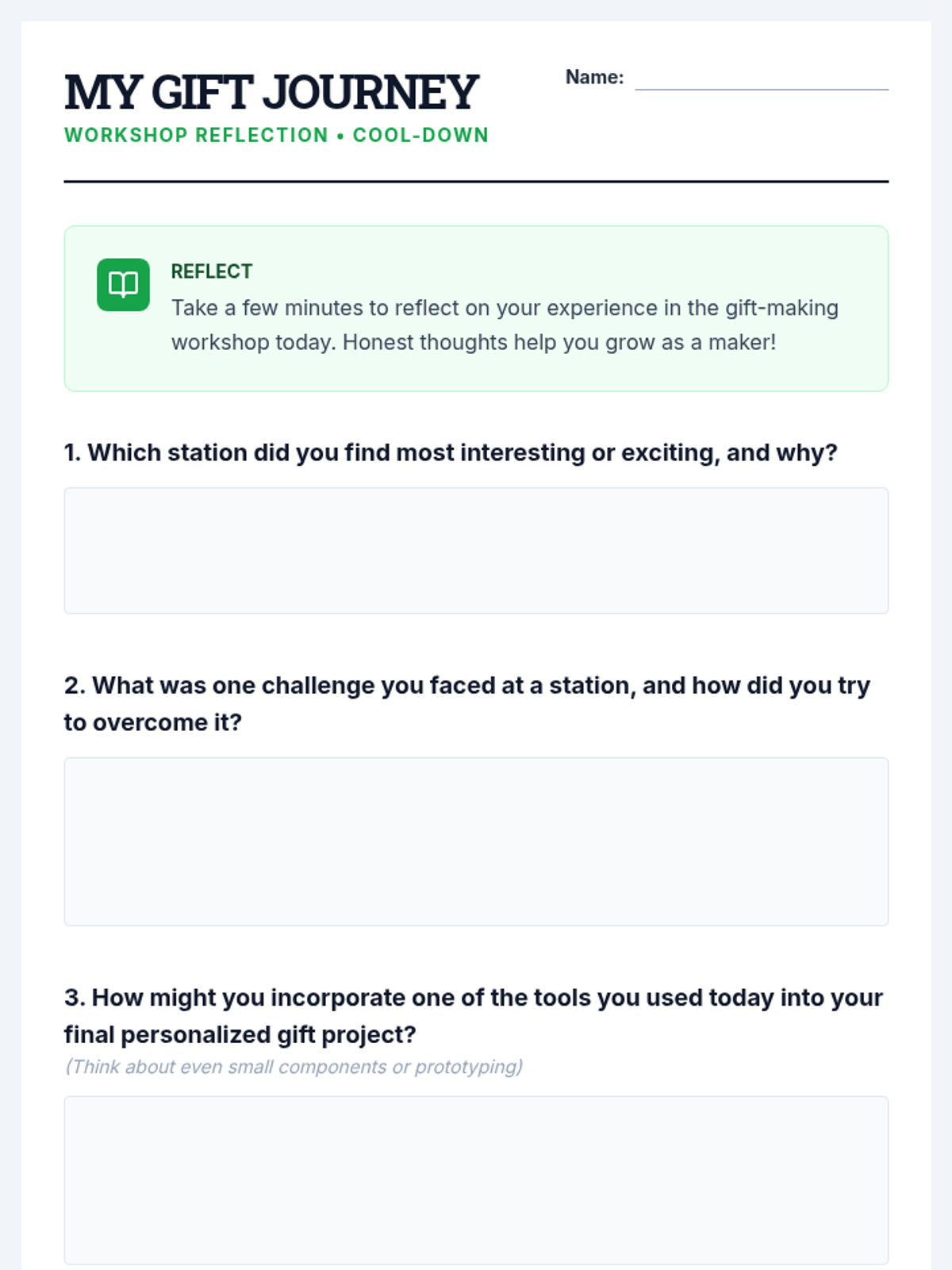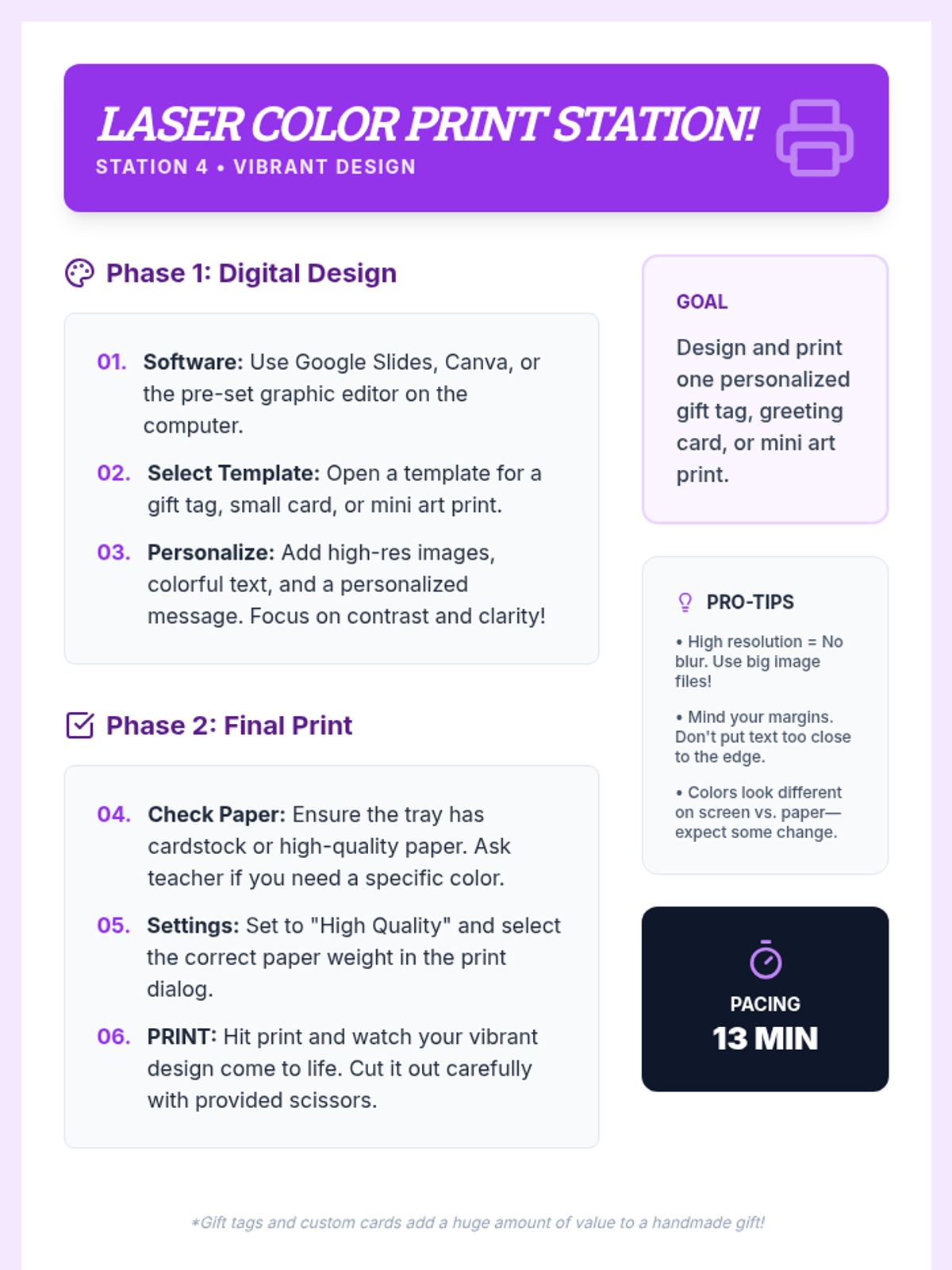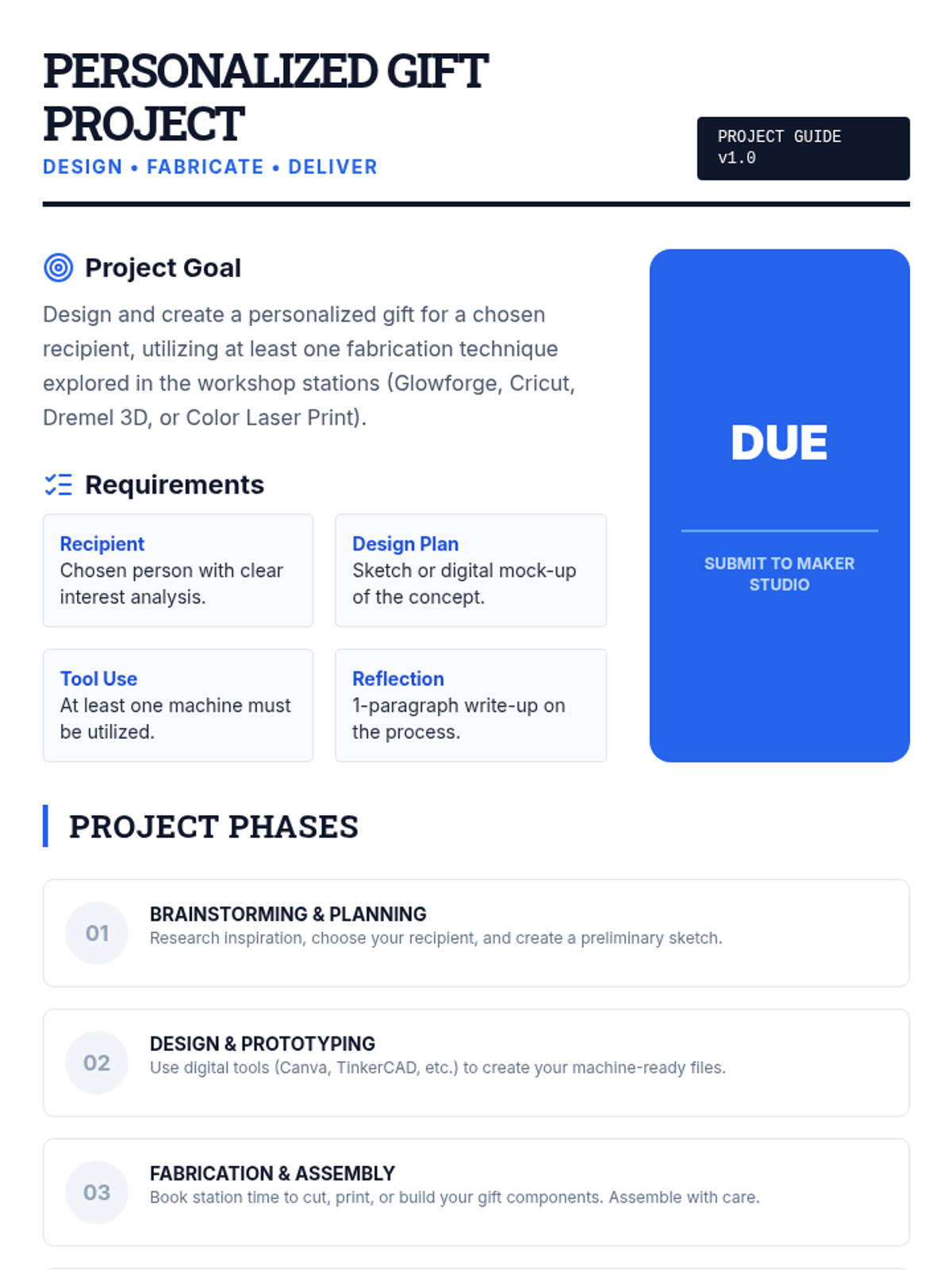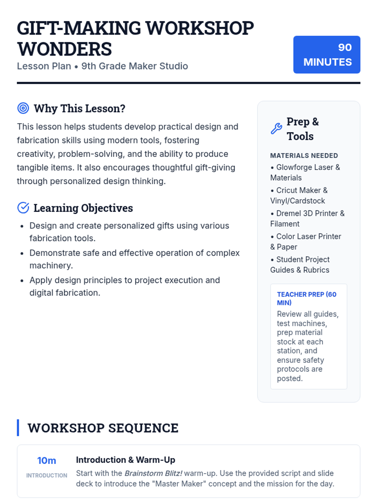 A 90-minute workshop where 9th-grade students rotate through stations to explore modern fabrication tools like laser cutters, 3D printers, and vinyl cutters to design and create personalized gifts.