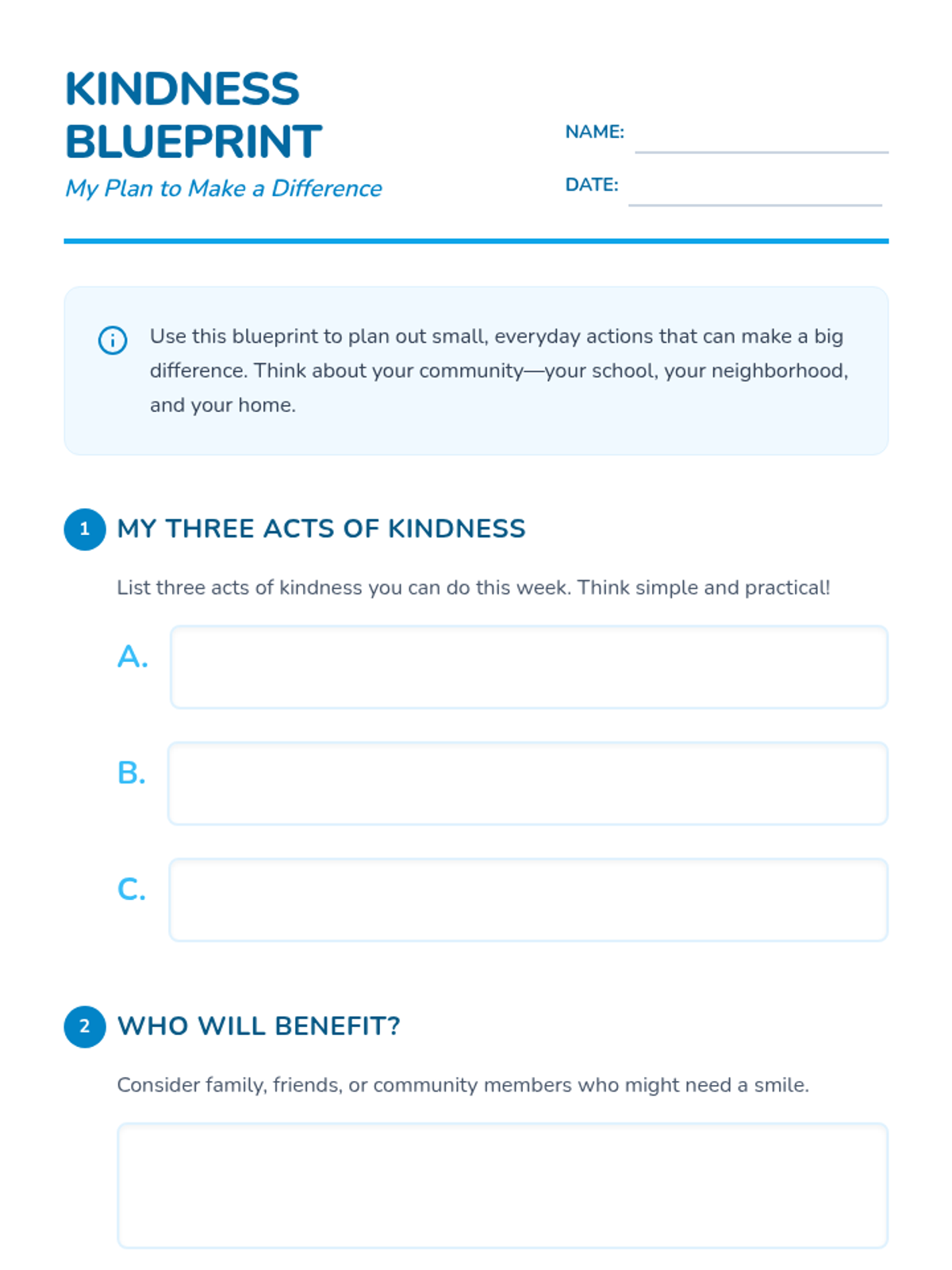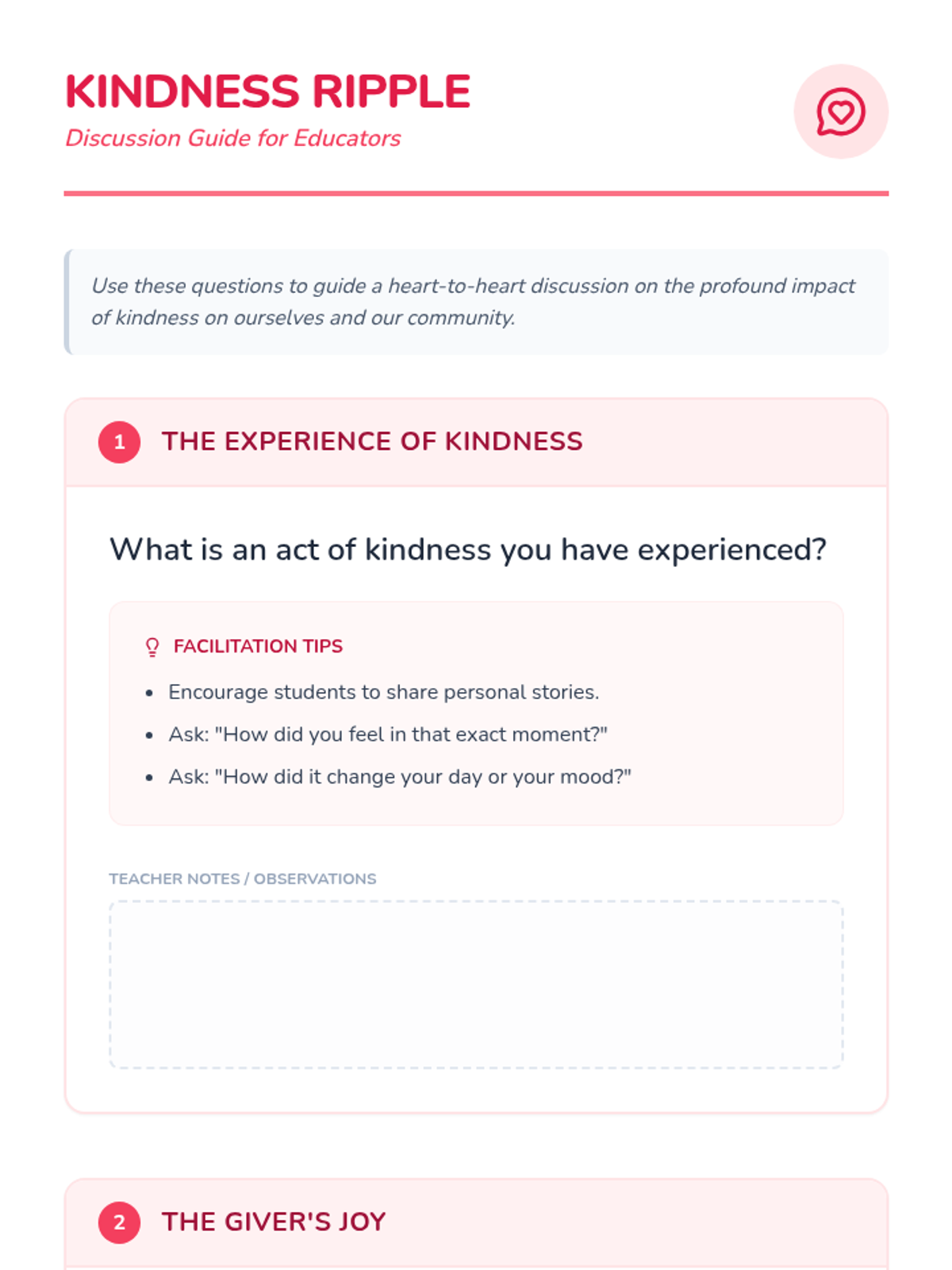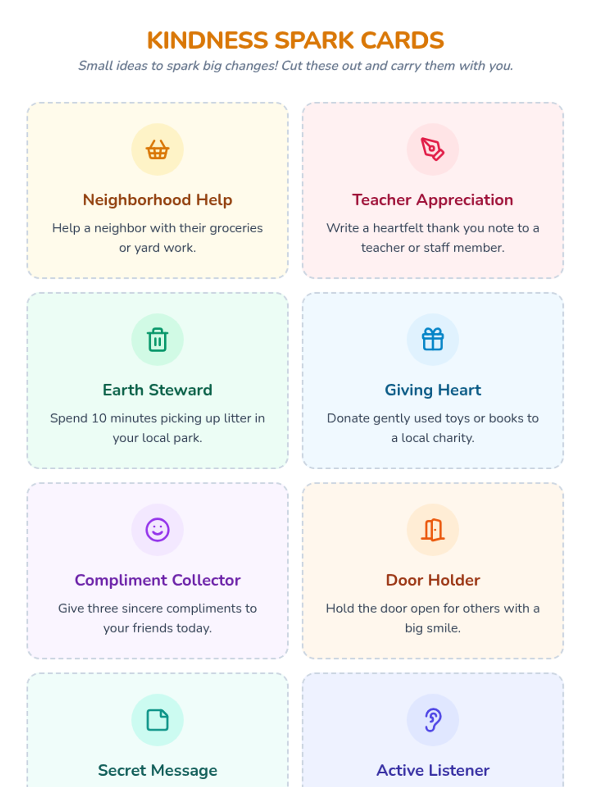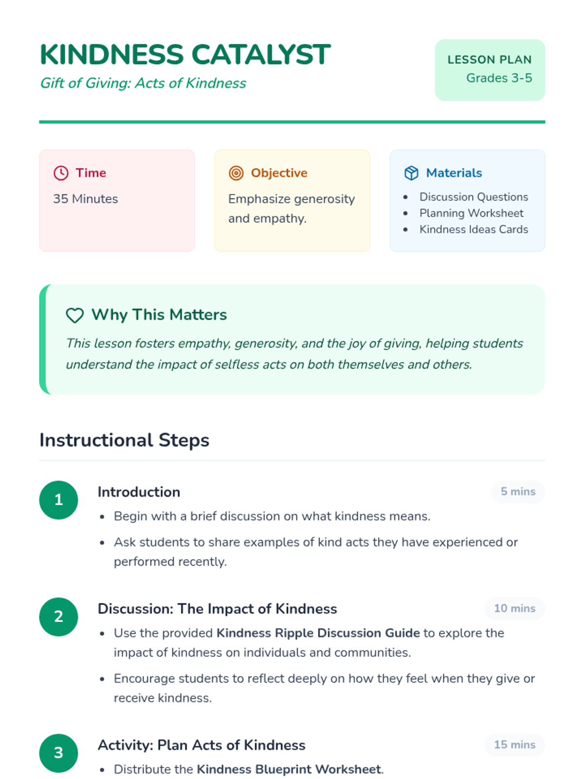 In this lesson, students will engage in a project focused on planning and executing small acts of kindness within their community. This lesson is important as it fosters empathy, generosity, and the joy of giving, helping students understand the impact of selfless acts on both themselves and others.