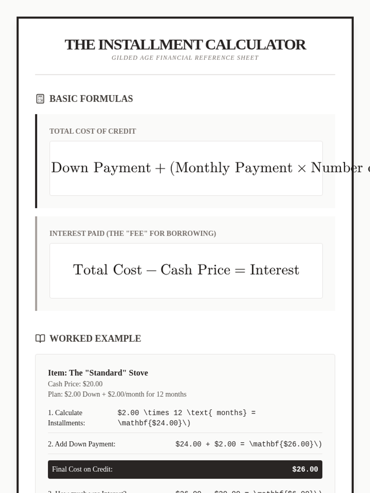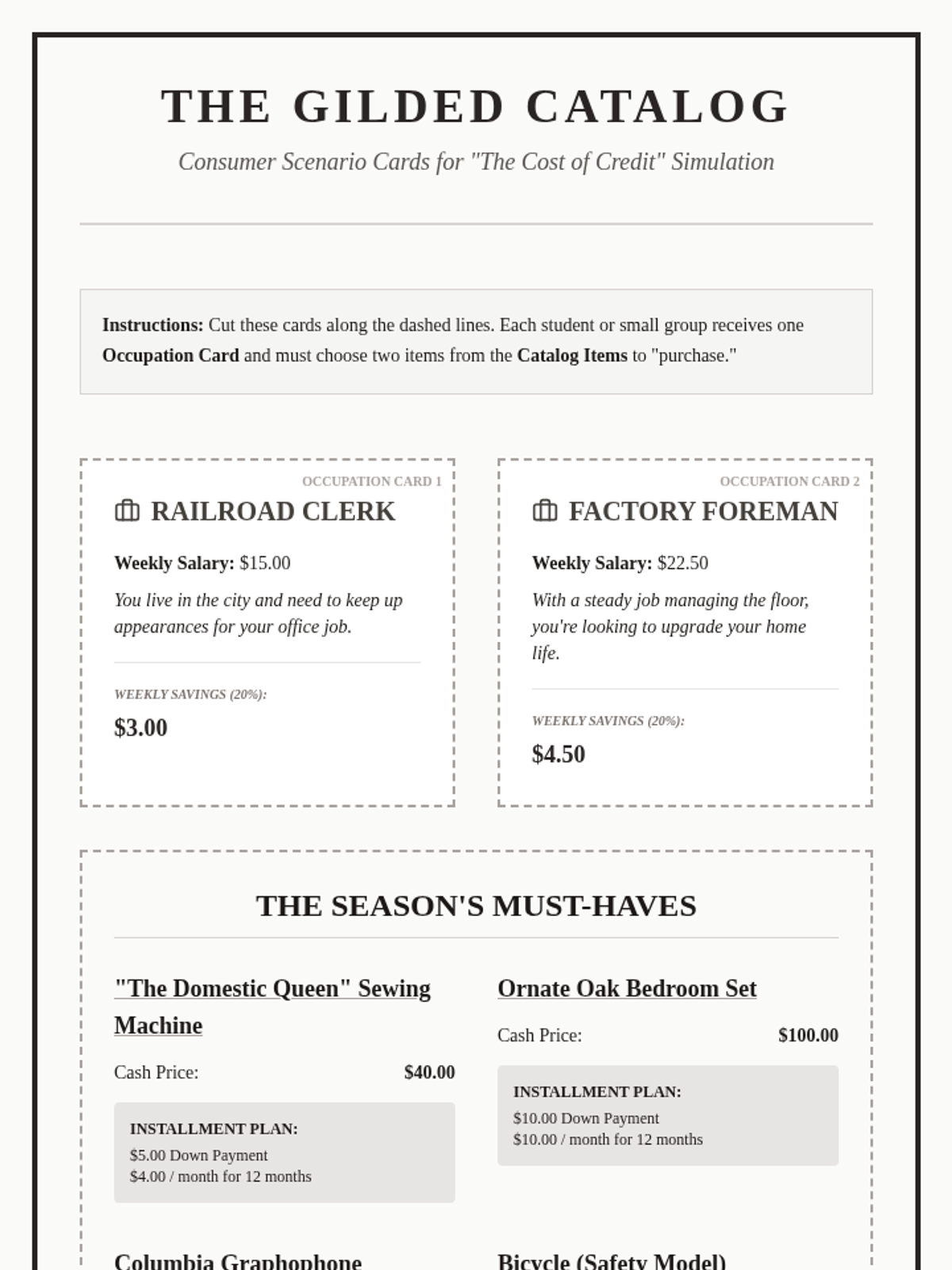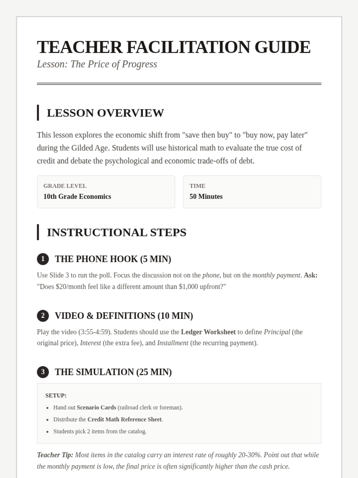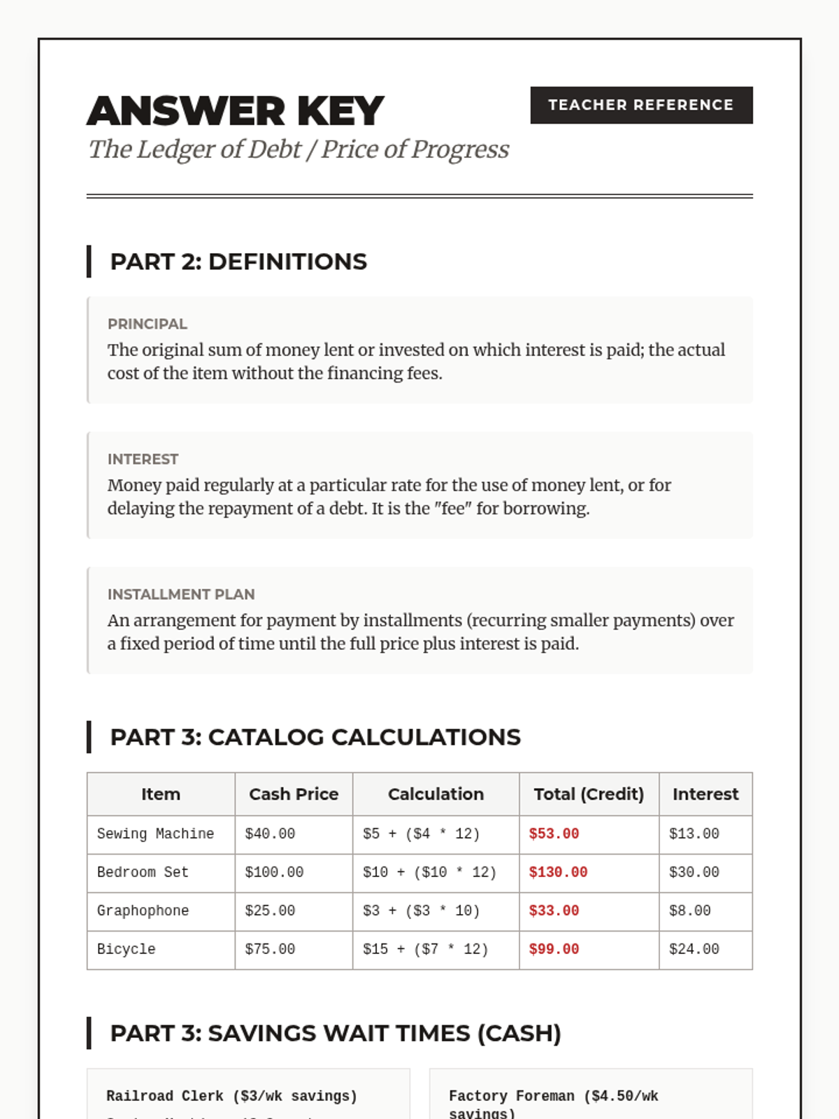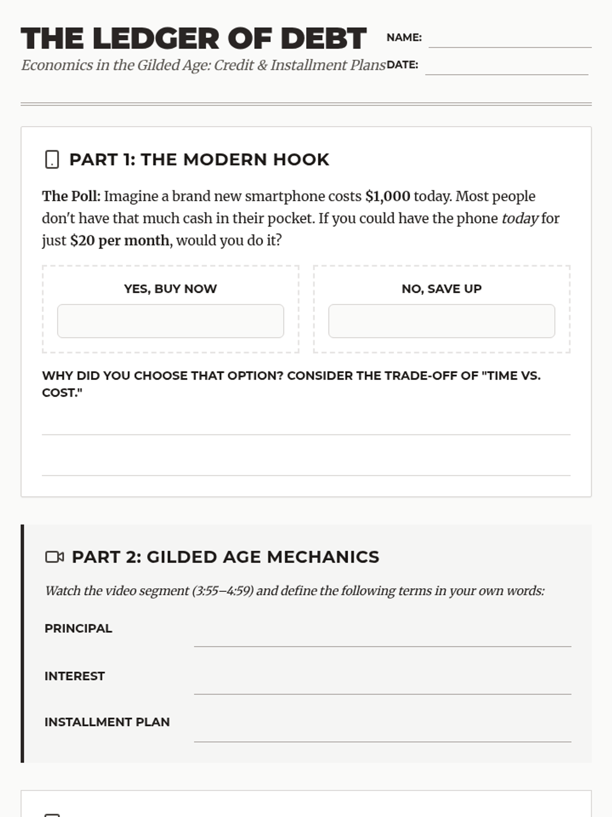 A 10th-grade economics lesson exploring the origins of consumer credit during the Gilded Age, focusing on the mechanics of installment plans and the trade-offs of debt.