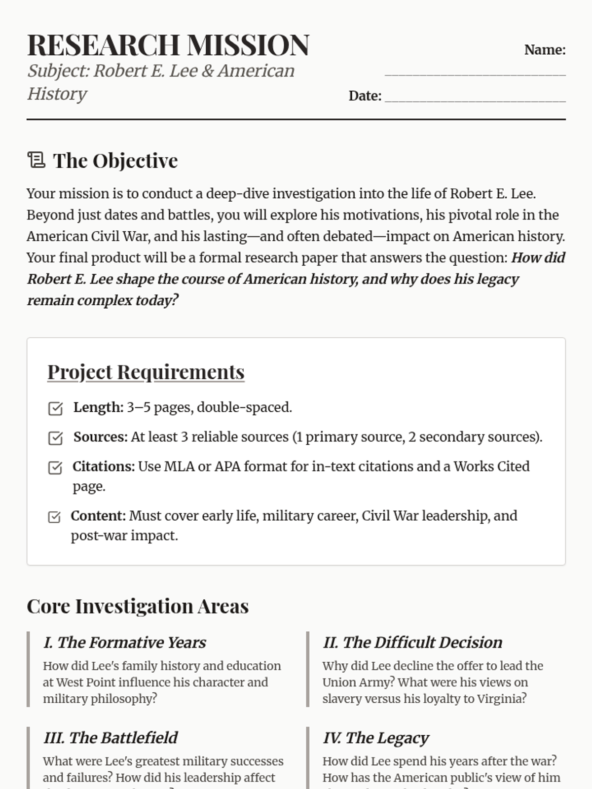 A comprehensive research project exploring the life, military career, and historical impact of Robert E. Lee, focusing on his complex legacy in American history.