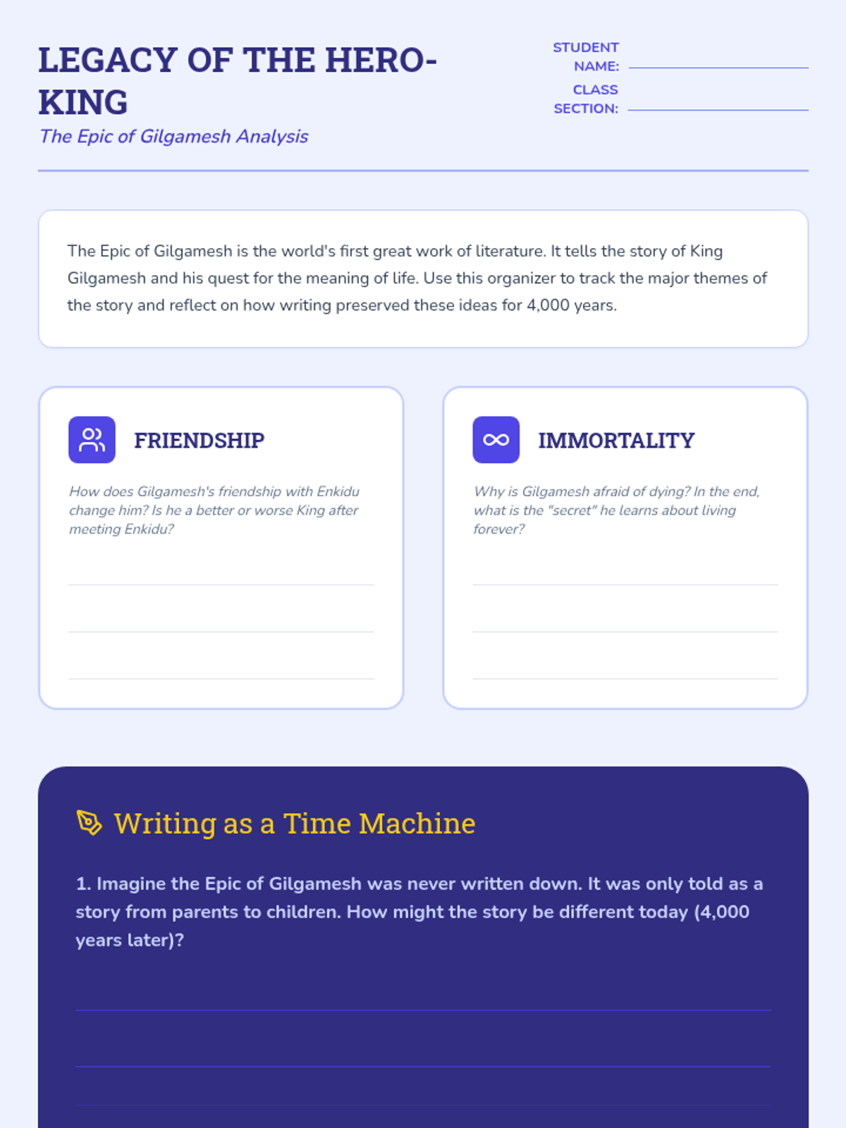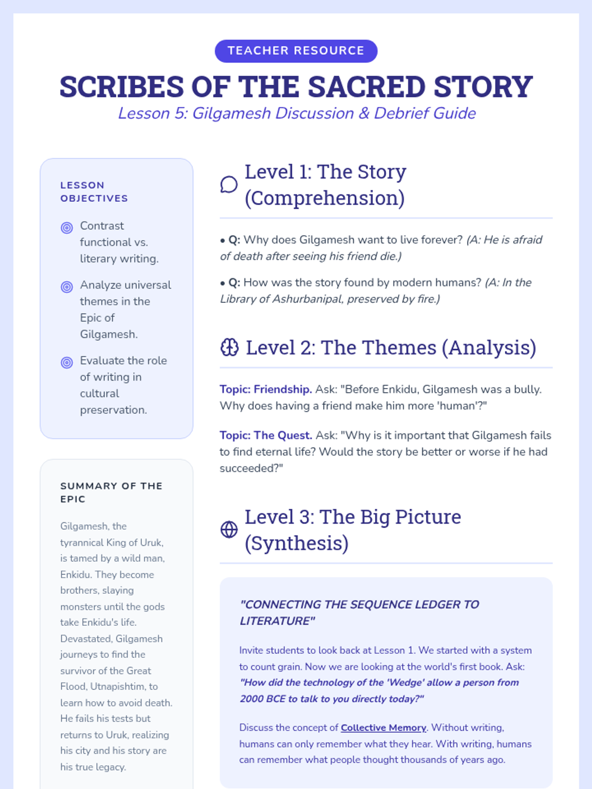 The sequence concludes with an exploration of the Epic of Gilgamesh. Students discuss how writing allowed humanity to preserve stories, explore universal themes, and seek a form of immortality through literature.