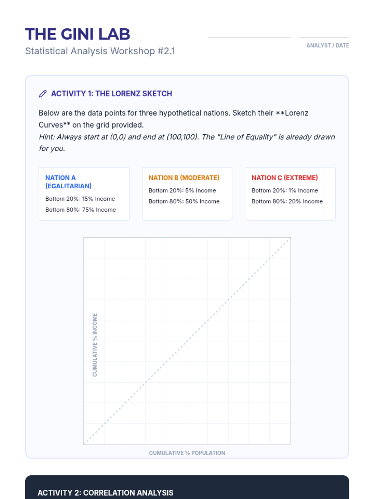 Focuses on the mathematical measurement of income inequality using the Lorenz curve and Gini coefficient. Students analyze how wealth is distributed within nations rather than just between them.