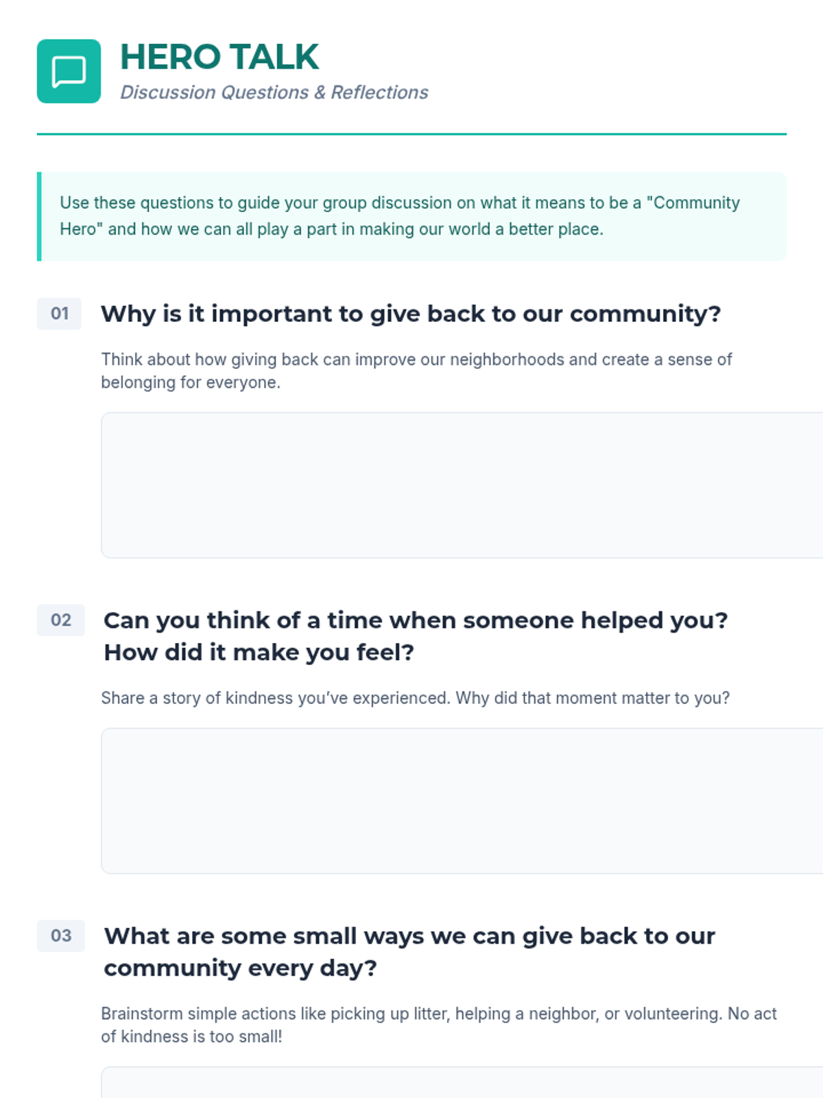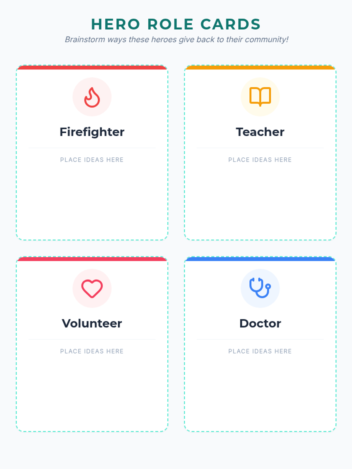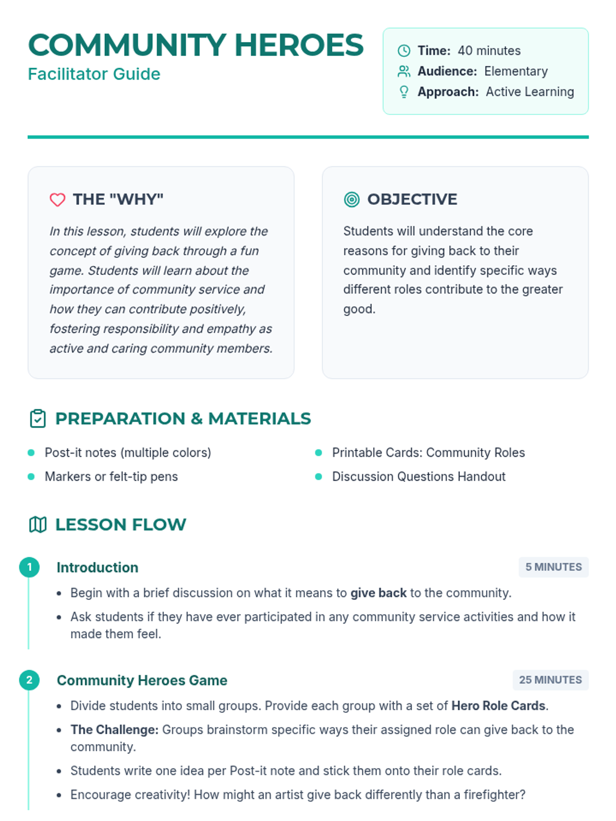 Students explore the concept of community service through a 'Hero Role' game, brainstorming creative ways to contribute positively to their surroundings and fostering empathy.