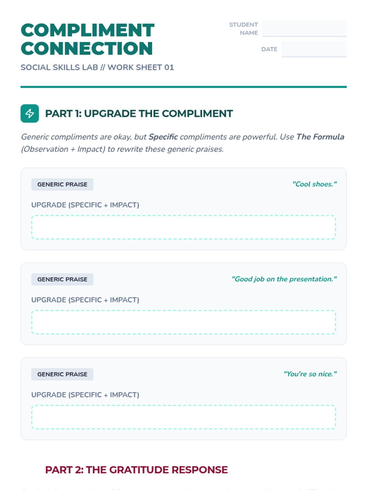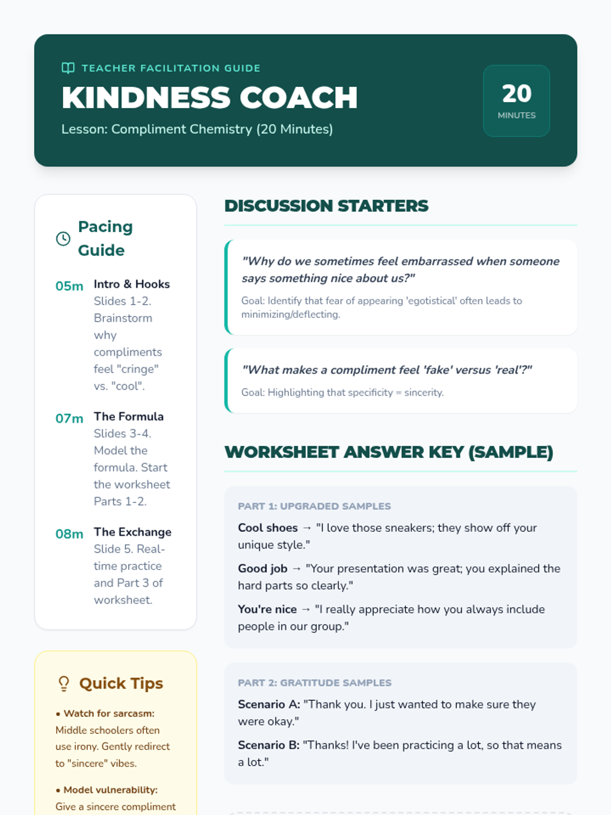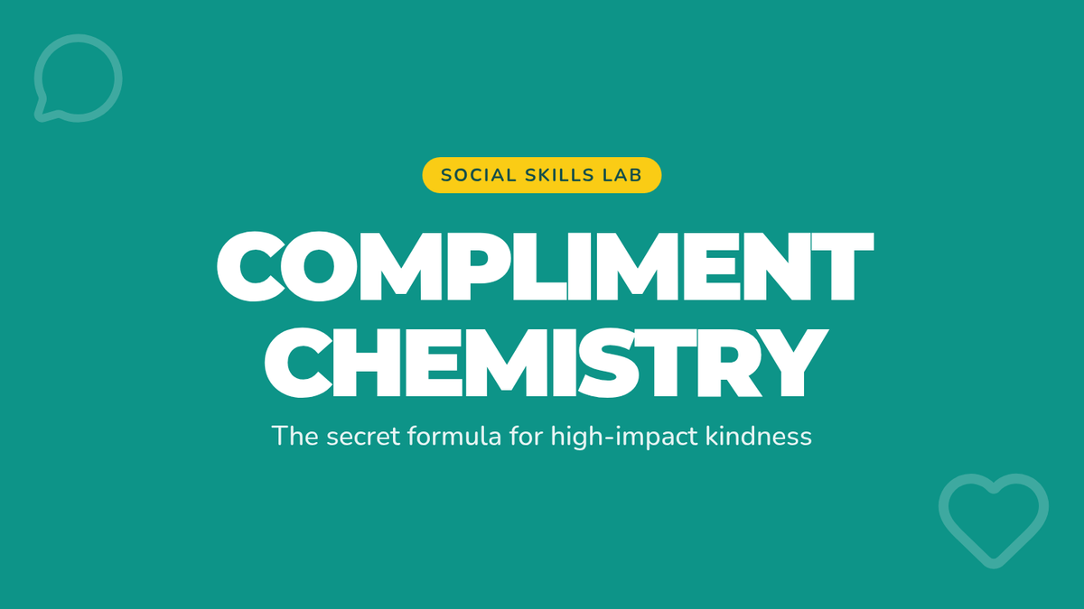 A 20-minute fast-paced lesson teaching students 'The Formula' for specific compliments and the art of receiving praise with gratitude.