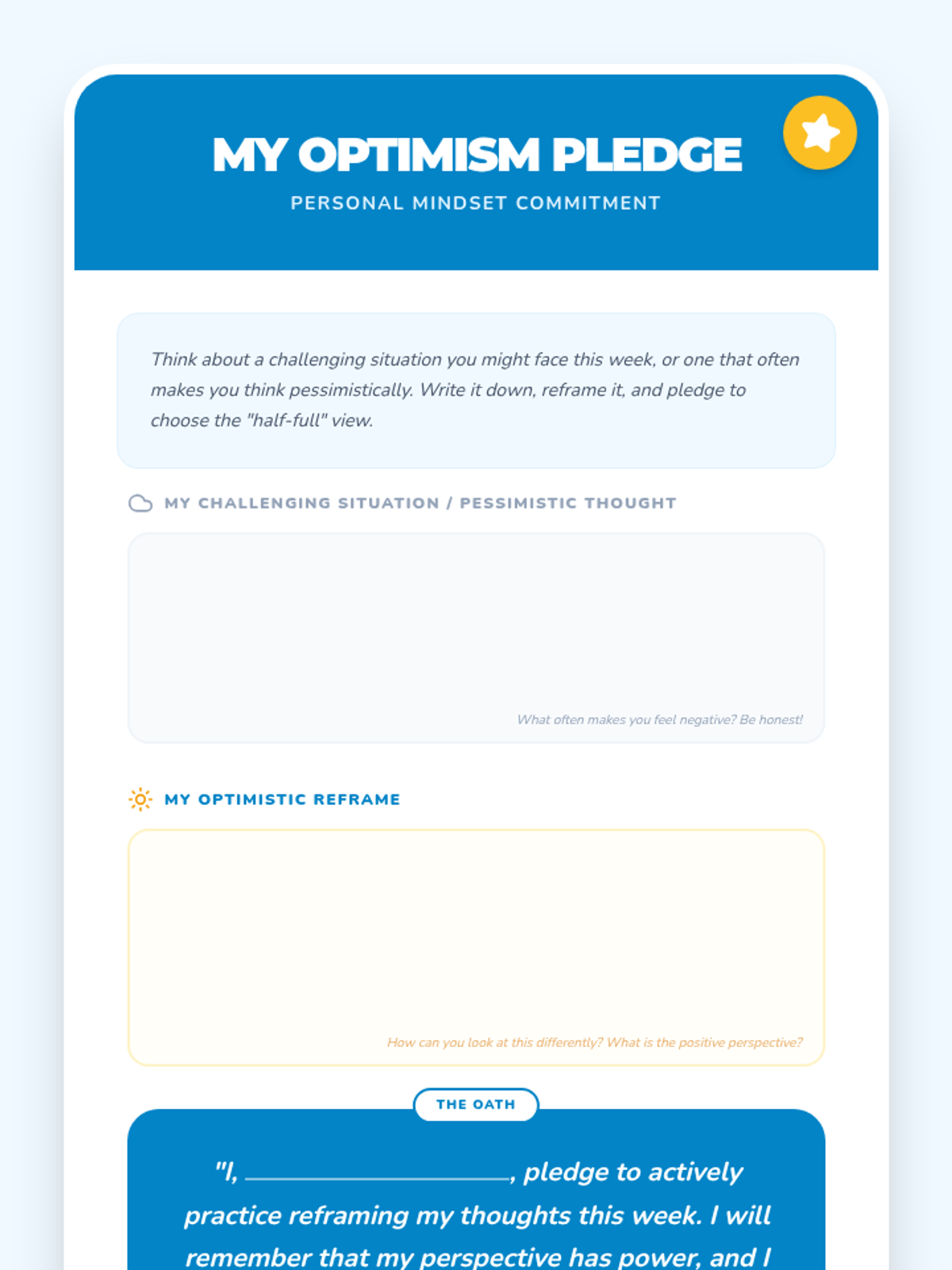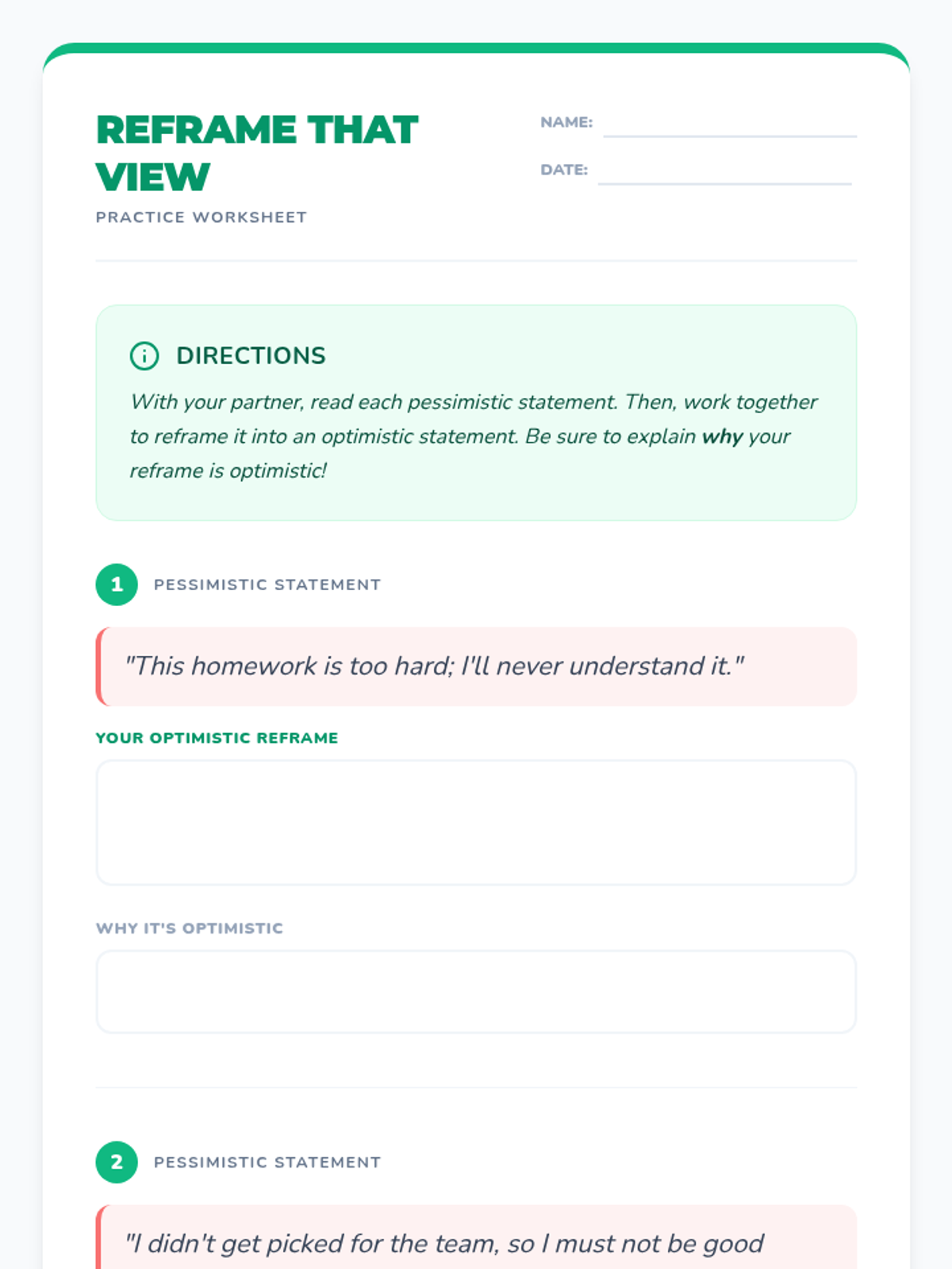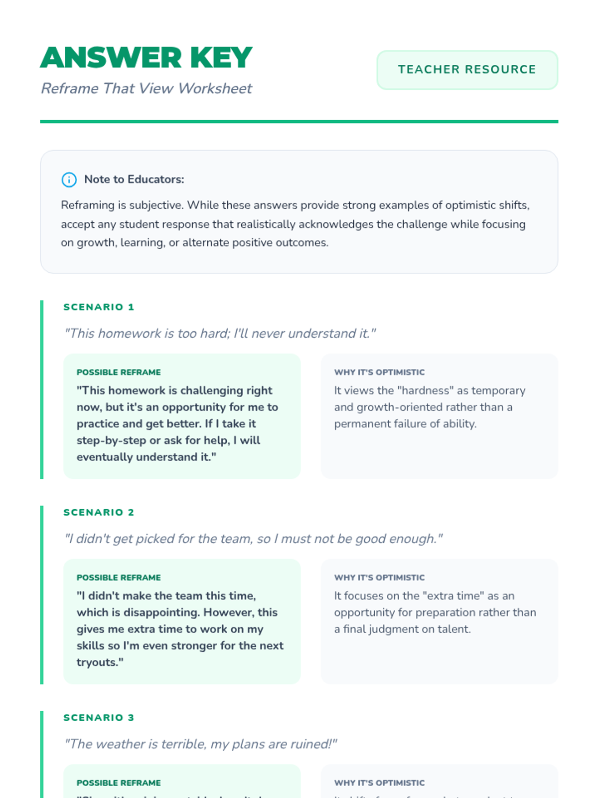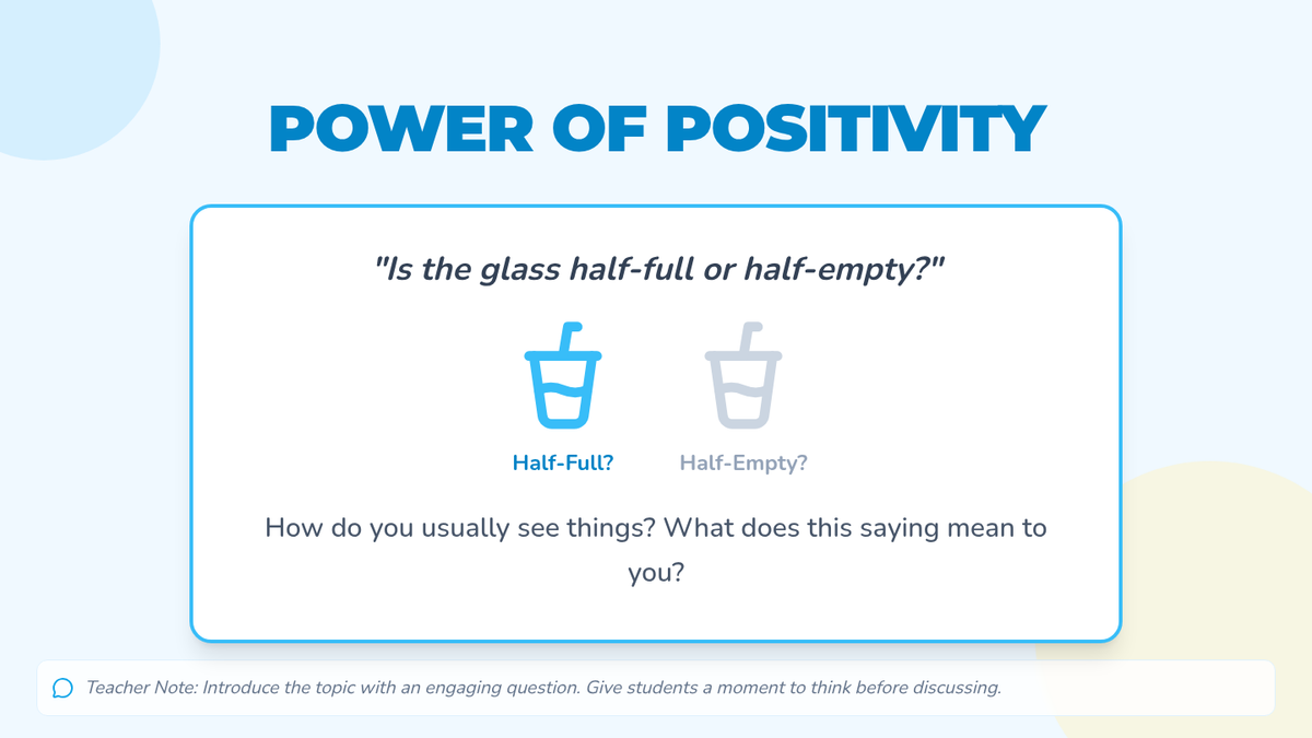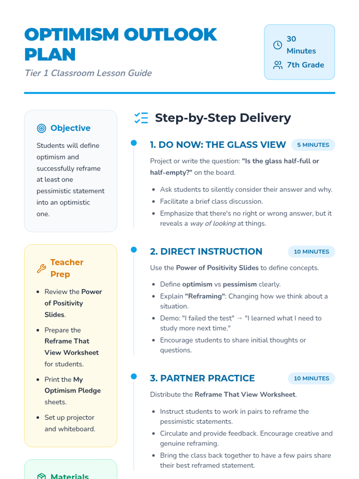 A 30-minute lesson for 7th-grade students that introduces optimism and practical reframing techniques to help cultivate a positive mindset.