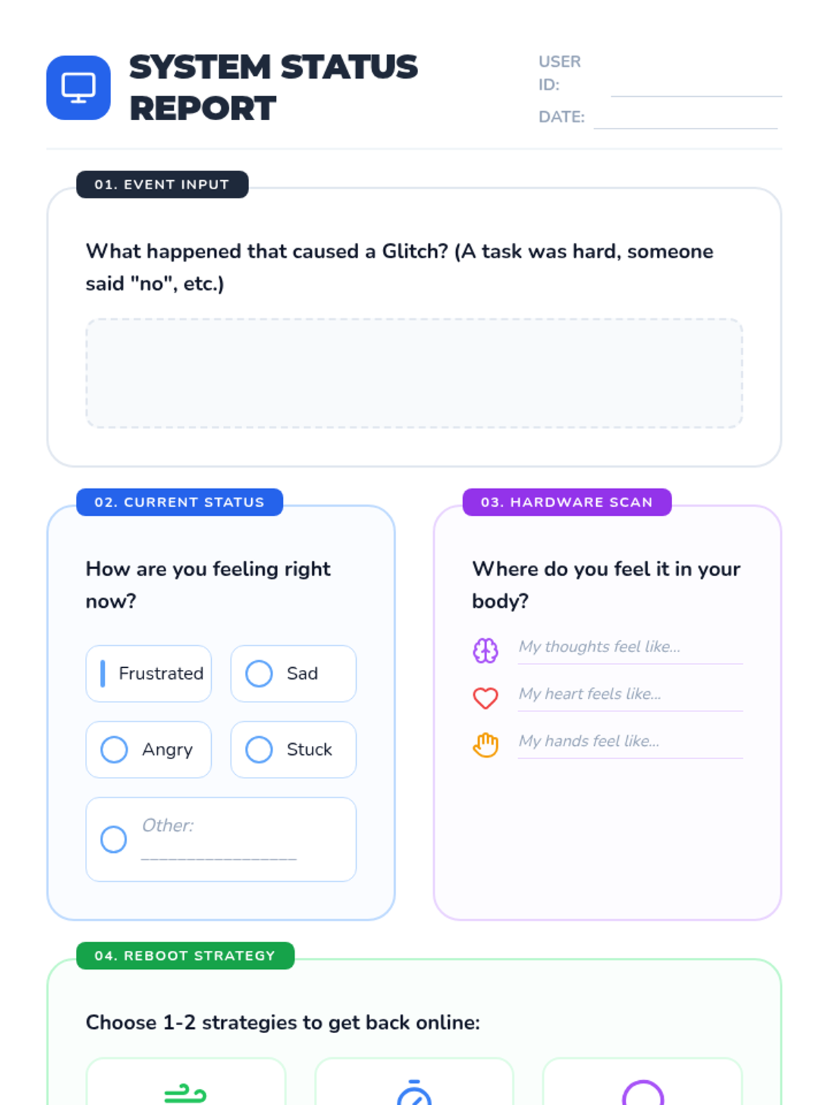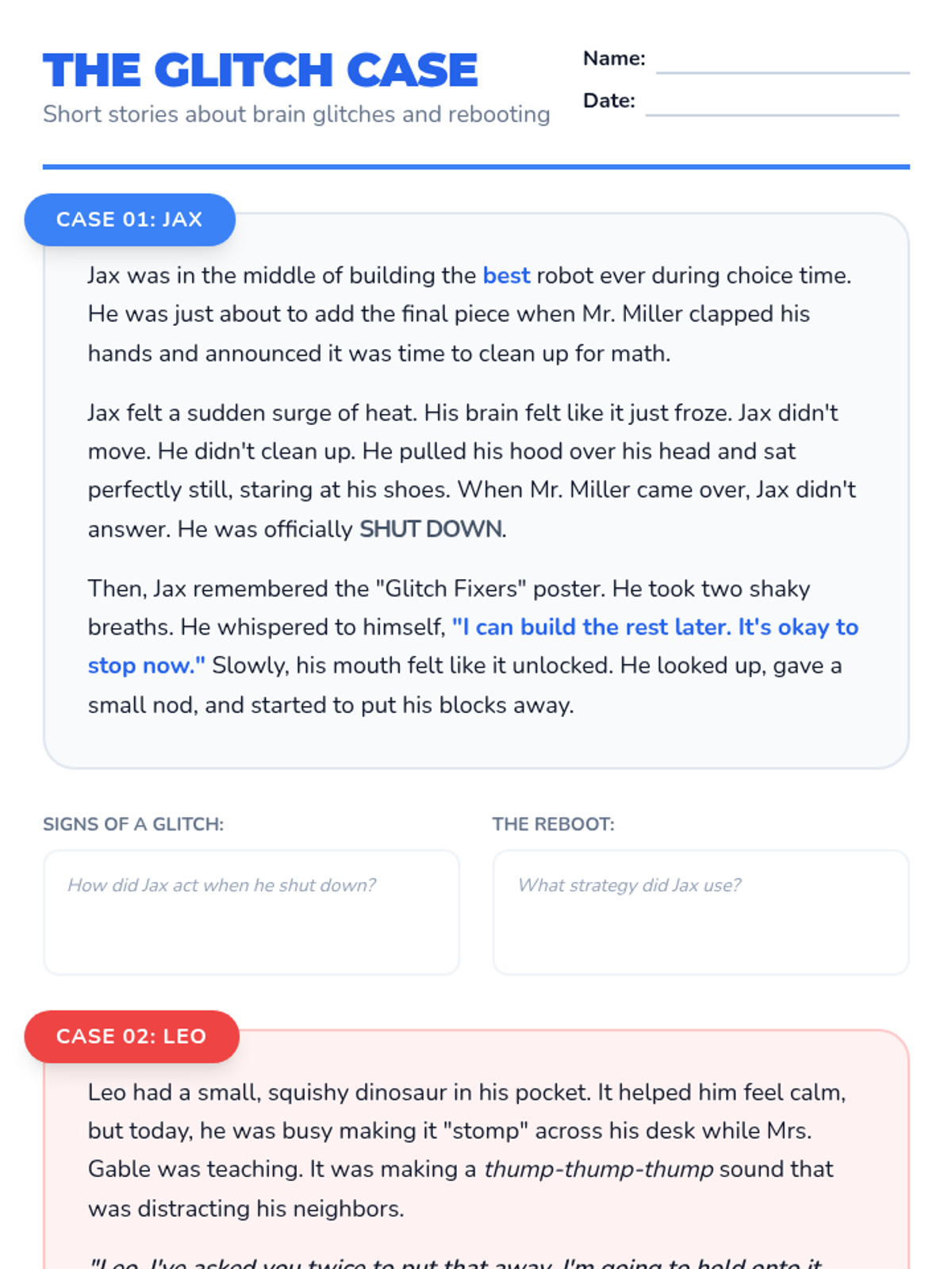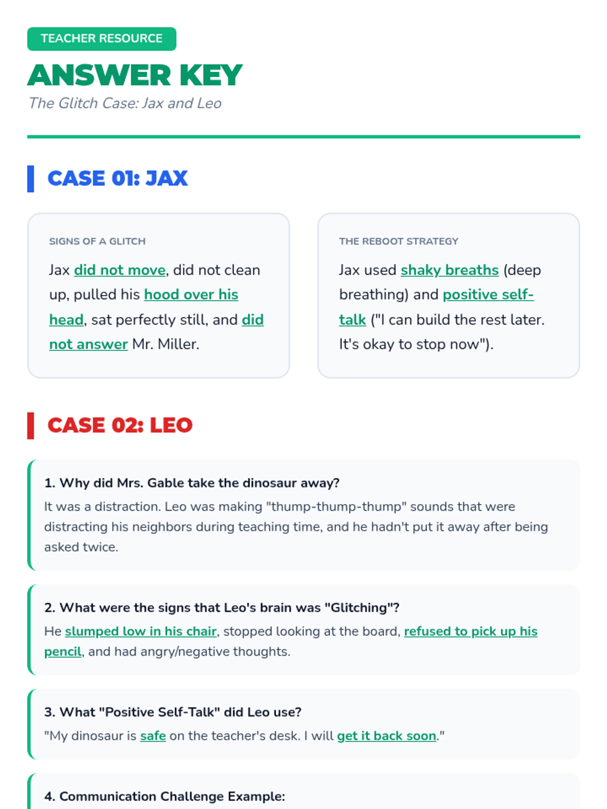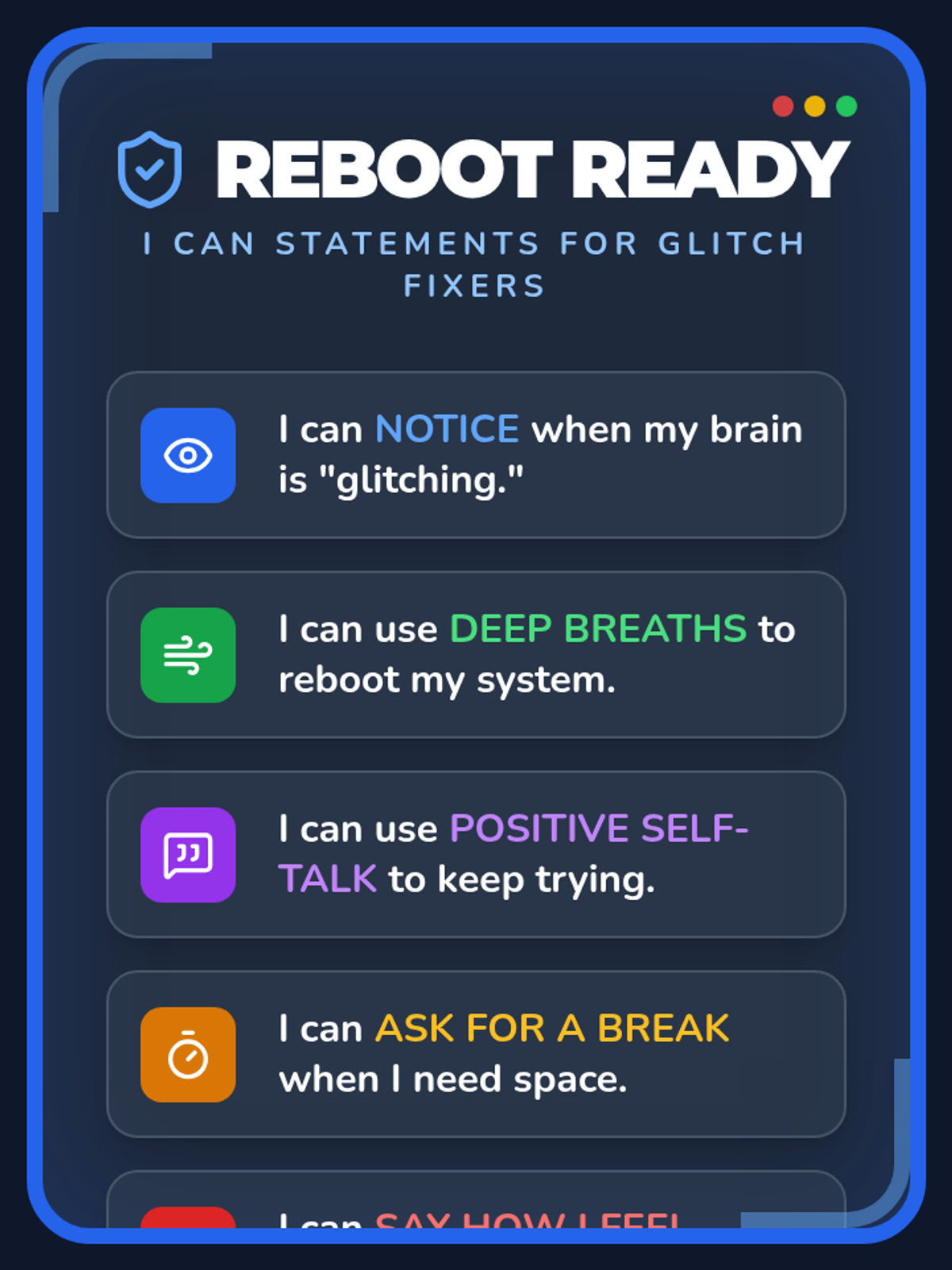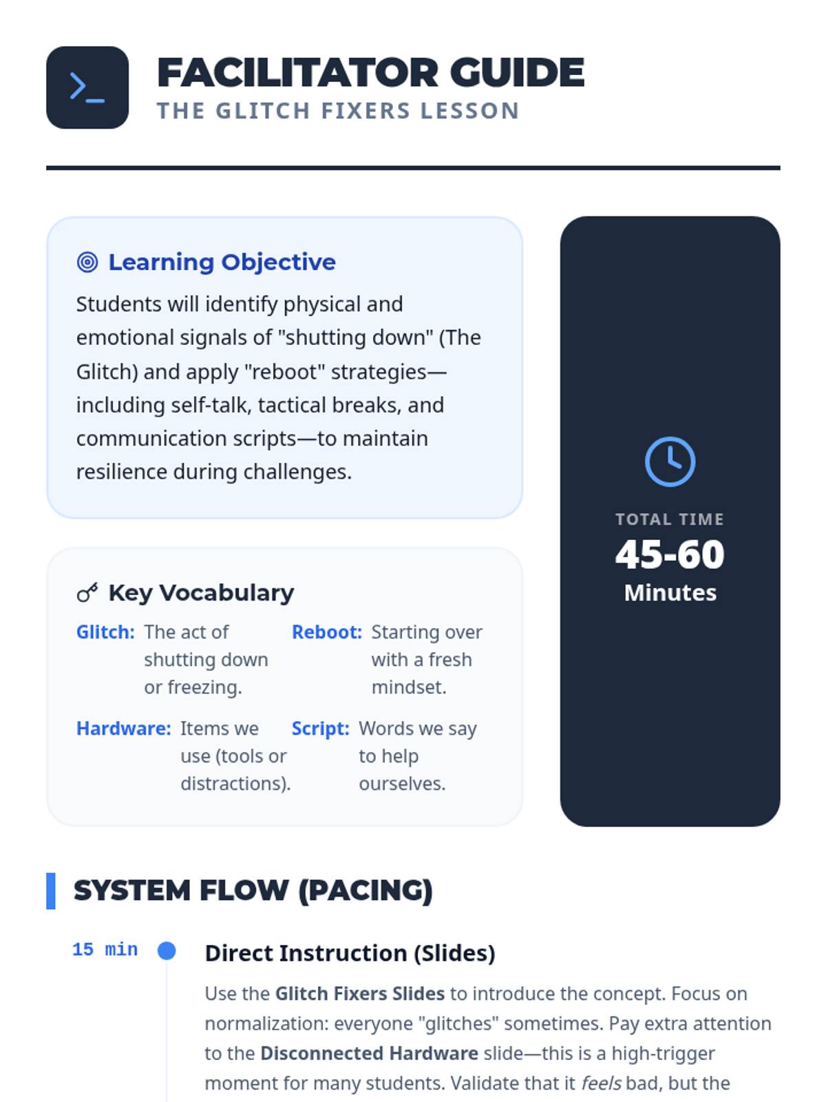 A lesson designed for 2nd-4th grade students to develop resilience and emotional regulation skills when facing challenges or hearing 'no'. The lesson uses a 'Glitch Fixers' theme to normalize frustration and provide concrete 'reboot' strategies like self-talk and communication tools.