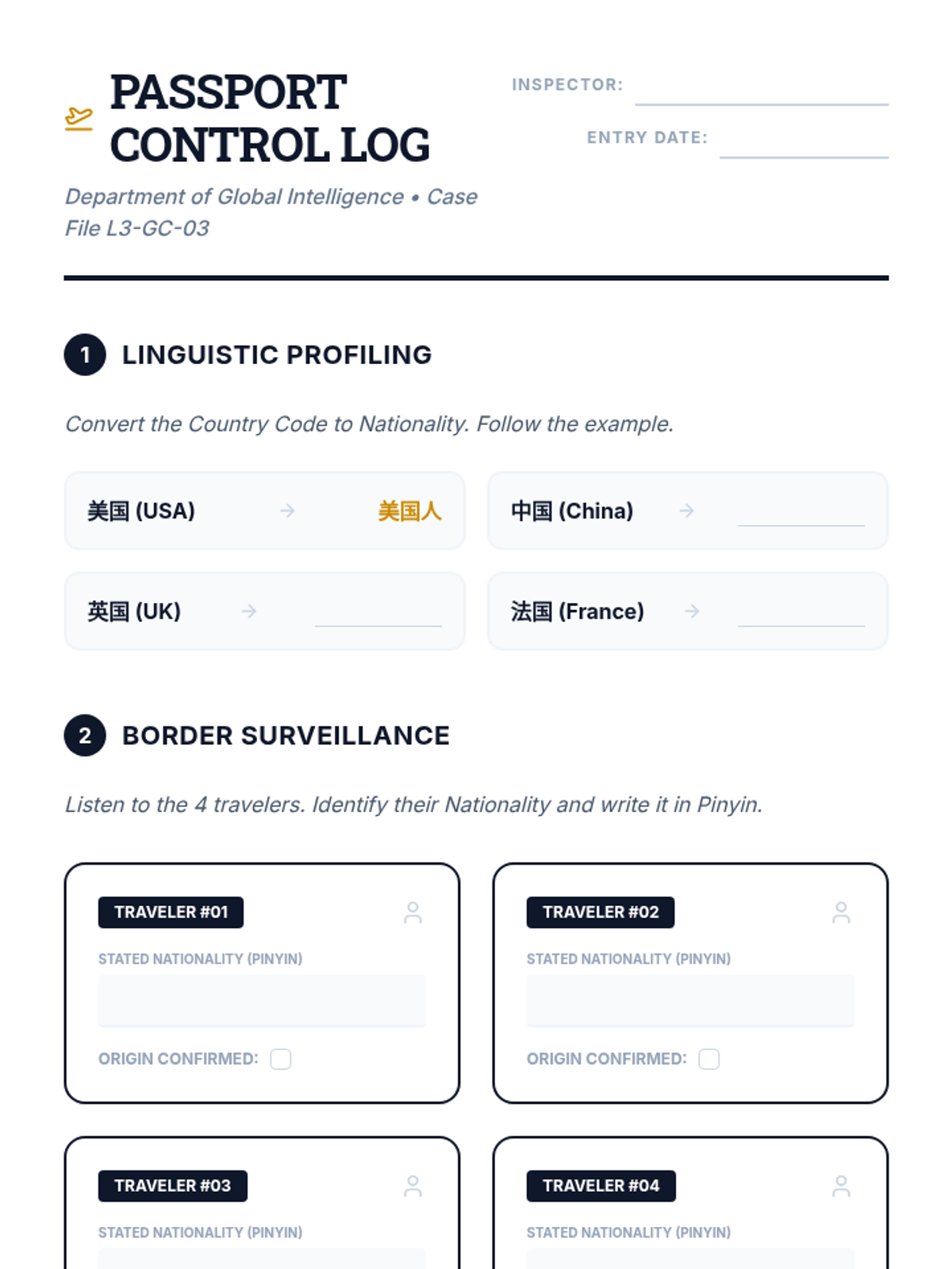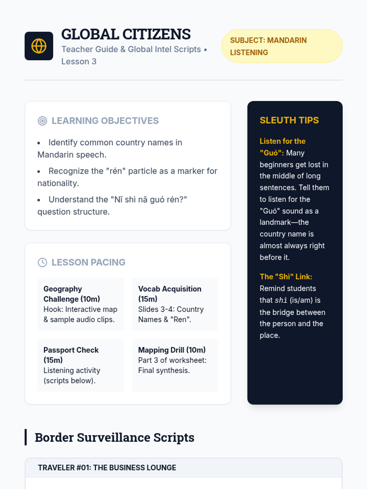 Students identify nationalities and origins by listening for country names and the 'rén' particle in Mandarin conversations.