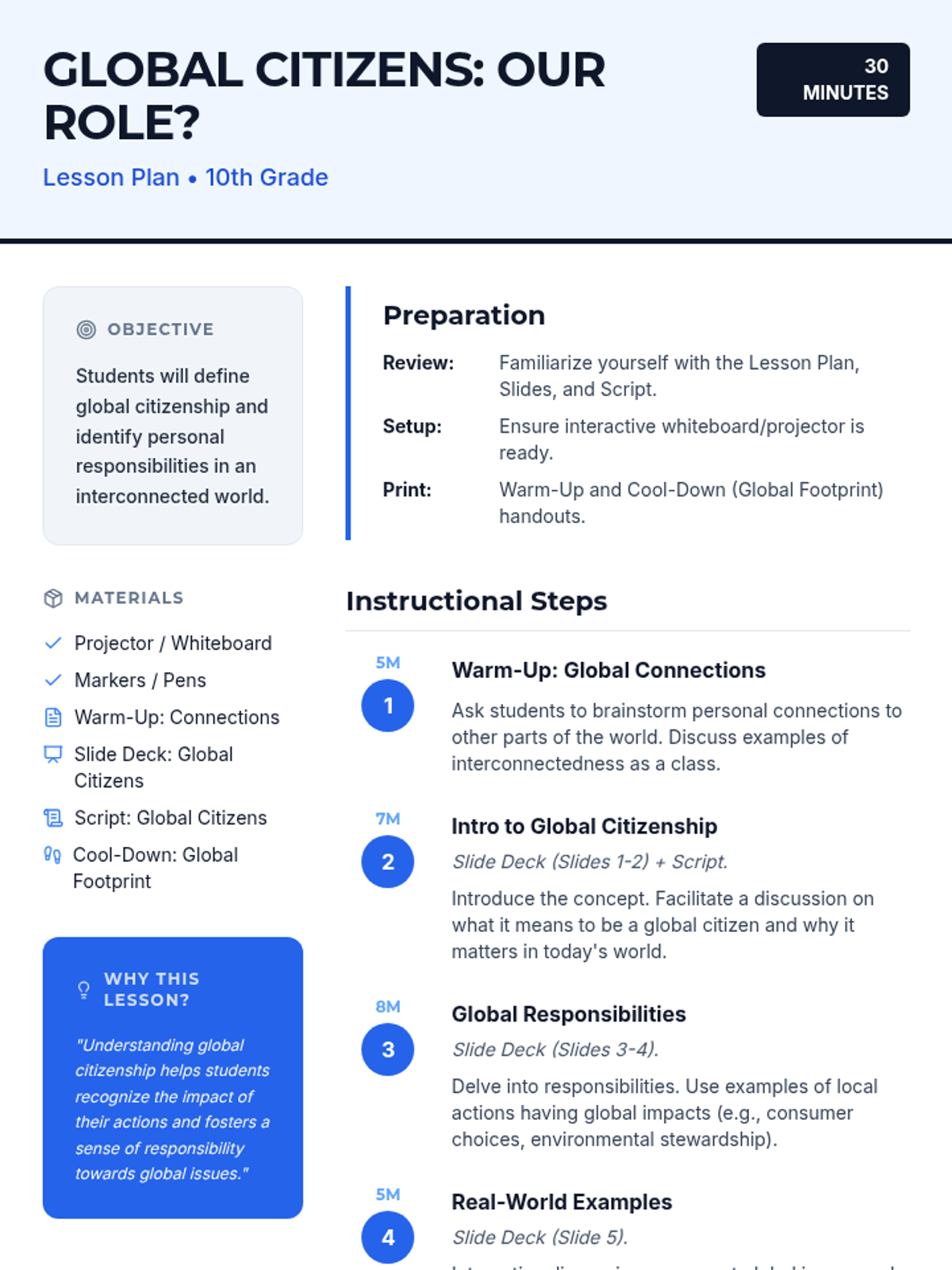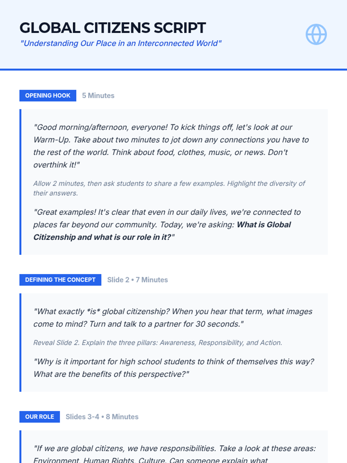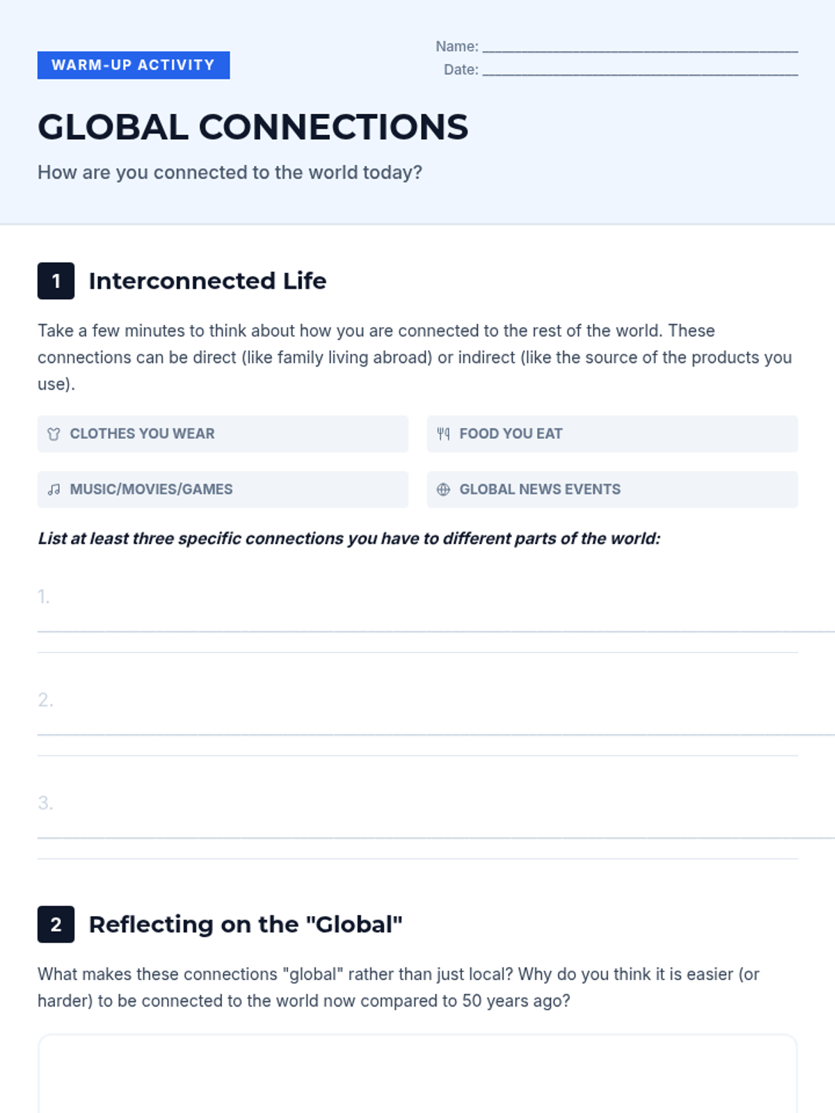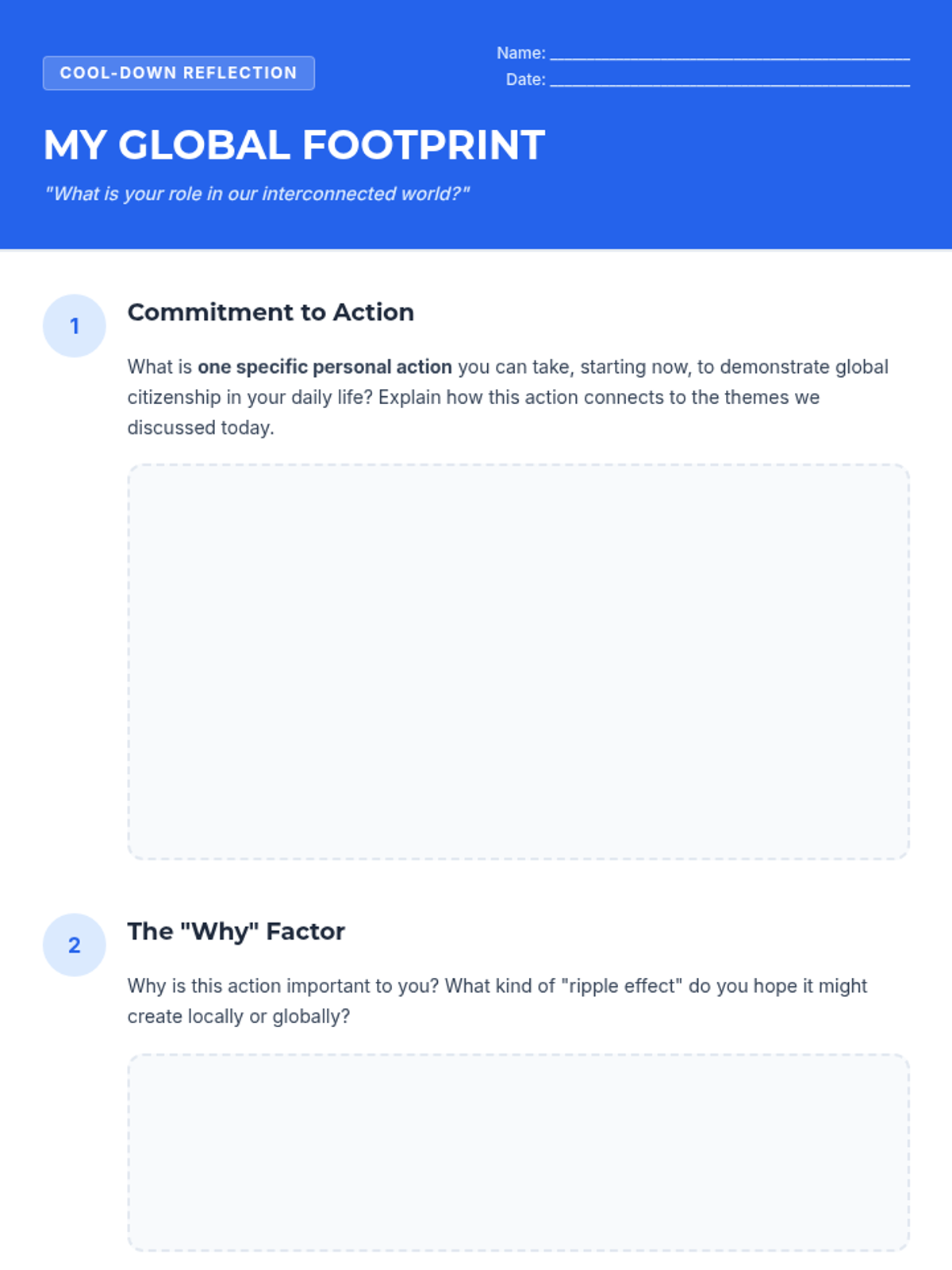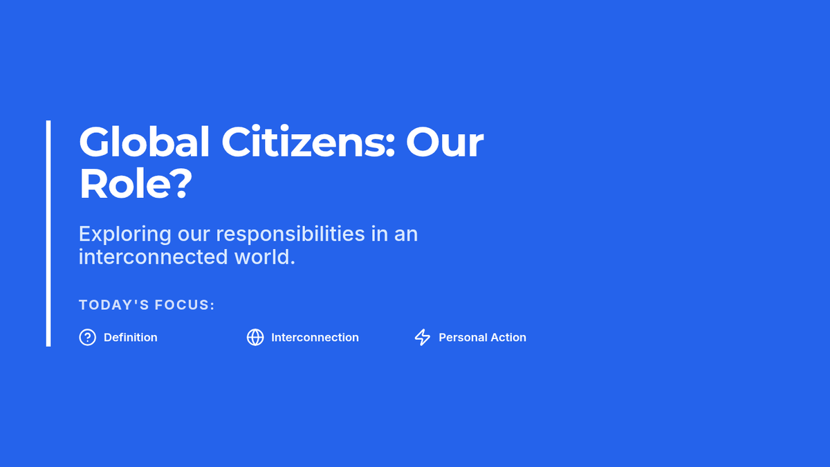 Students define global citizenship and identify personal responsibilities within an interconnected world through discussion and reflection.