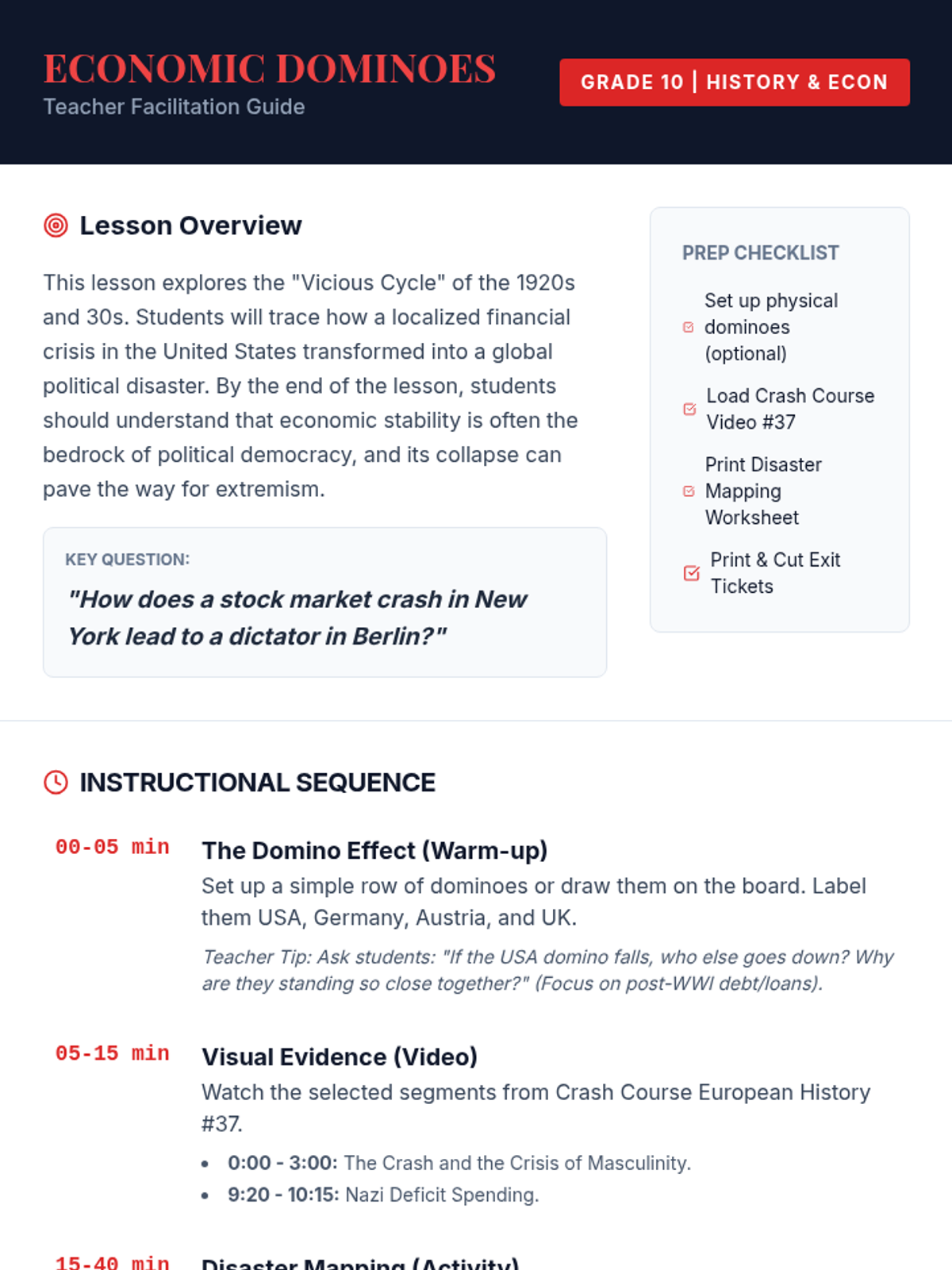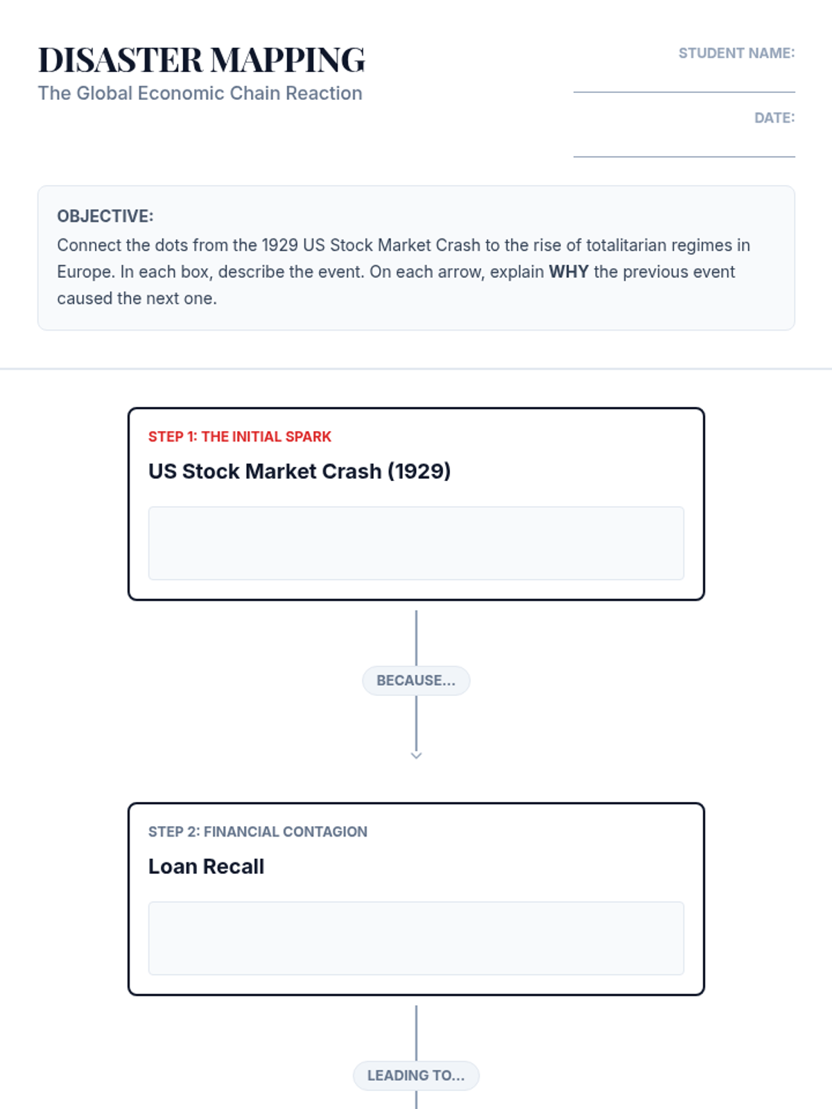 A lesson exploring the global chain reaction of the Great Depression, focusing on how economic interdependence led to the rise of totalitarian regimes in Europe. Students use flowcharting to map the transition from financial collapse to political extremism.