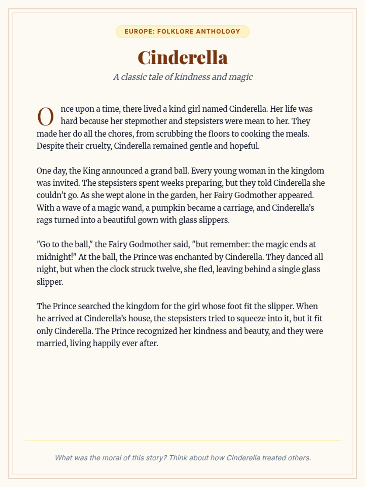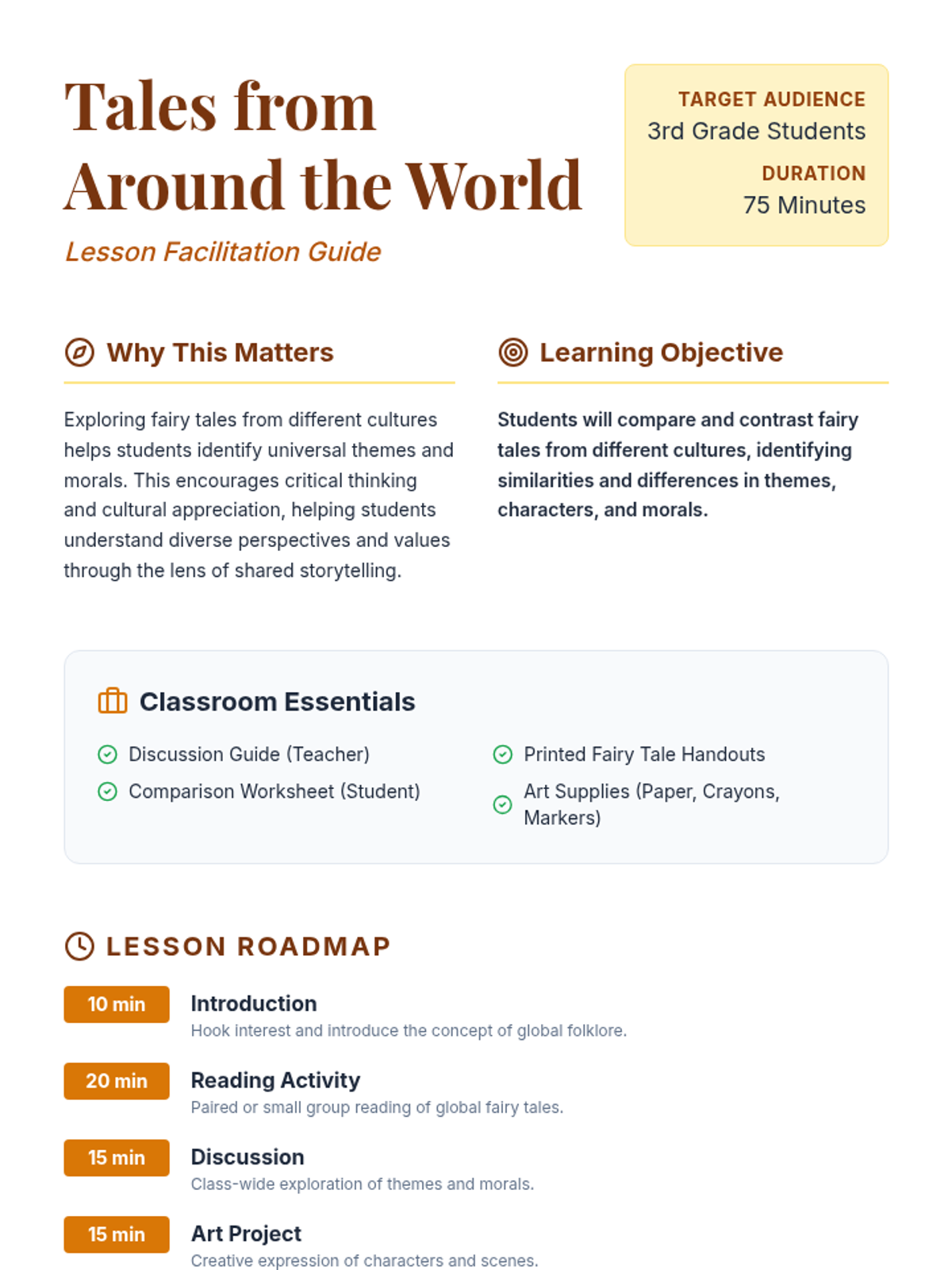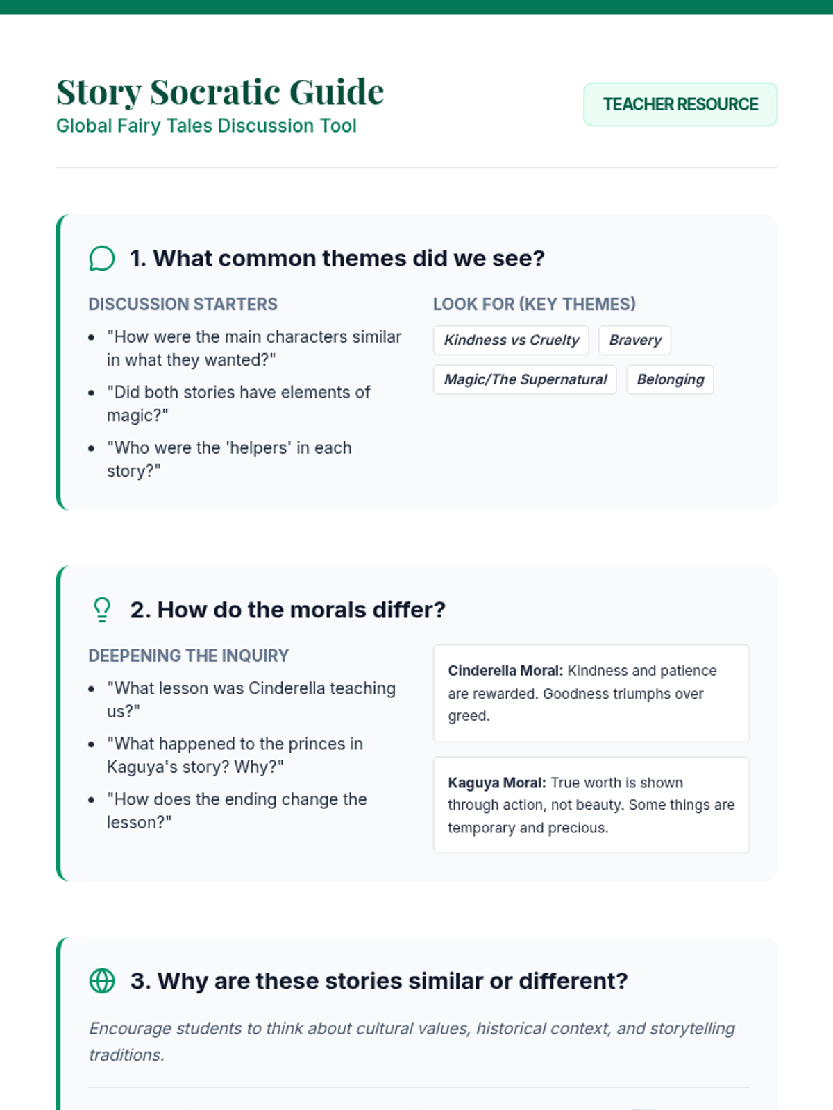 Students explore fairy tales from different cultures, focusing on identifying similarities and differences in themes and morals to encourage critical thinking and cultural appreciation.
