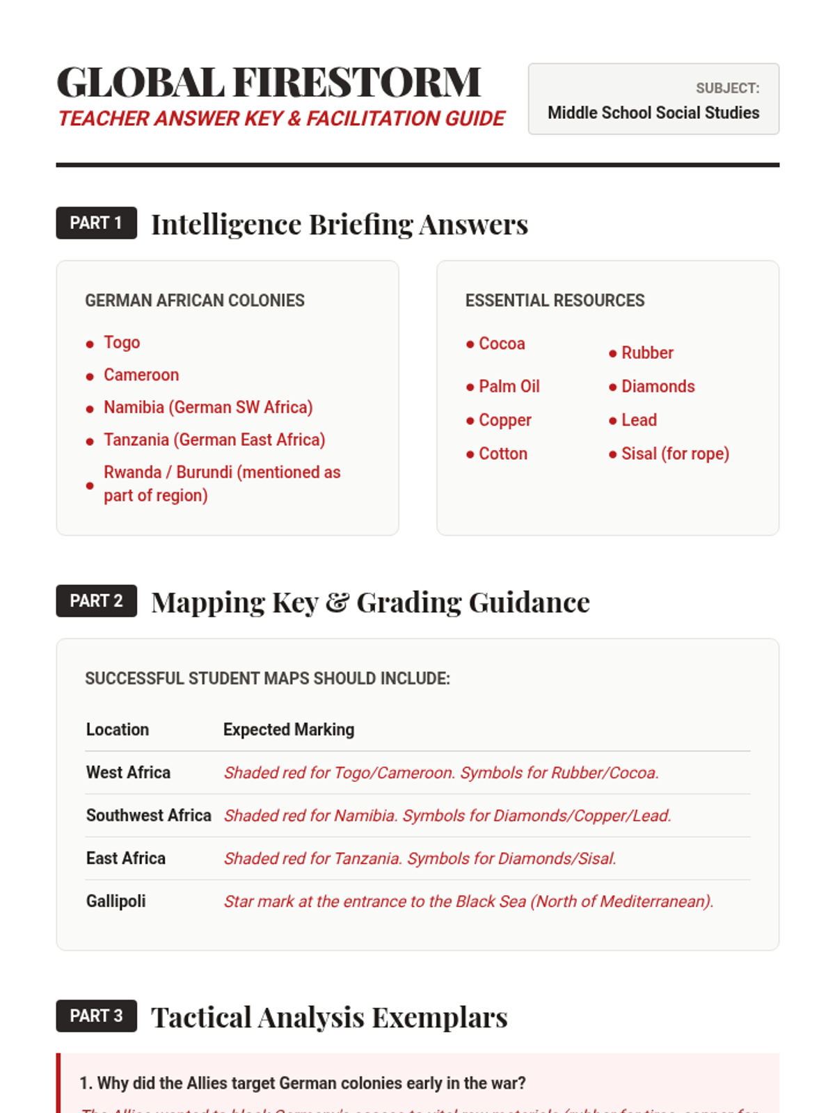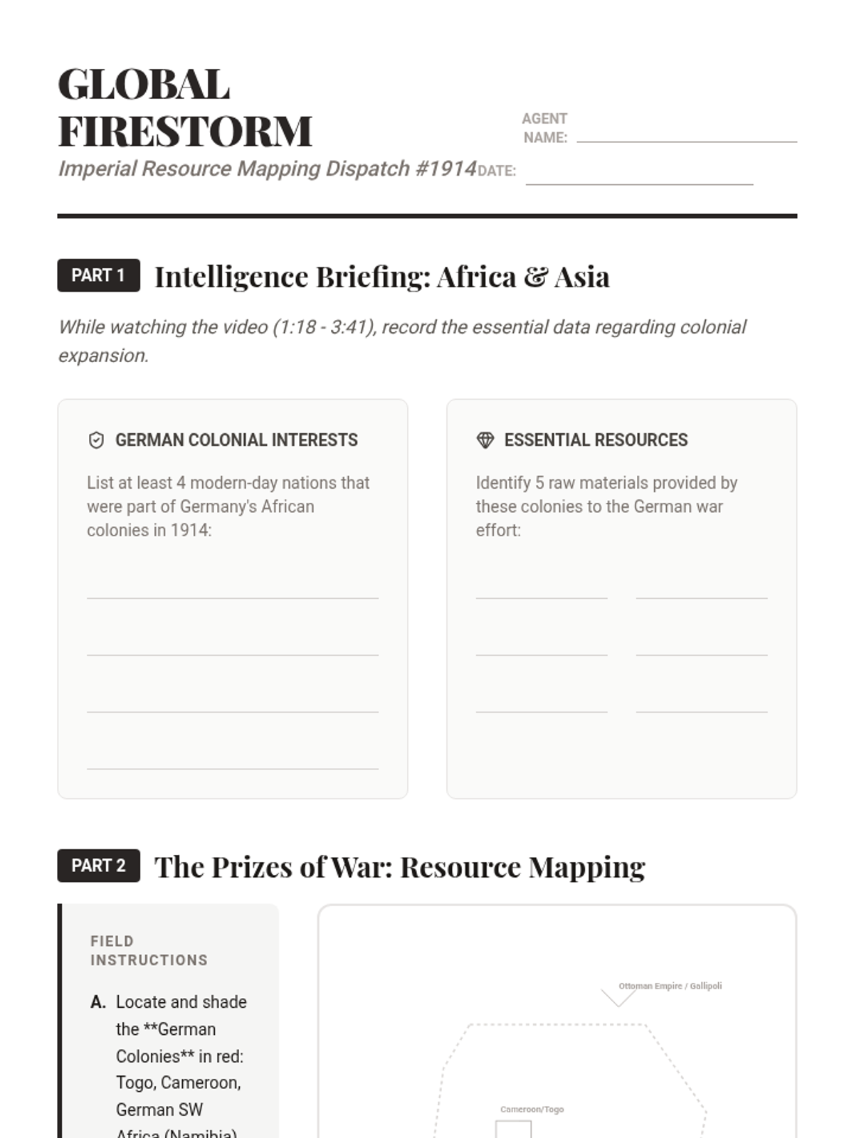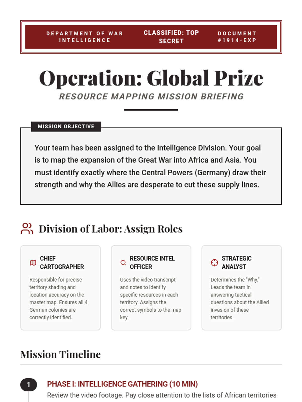 Students investigate how colonial interests and valuable resources like rubber and diamonds transformed a European conflict into a global war through mapping activities and video analysis.