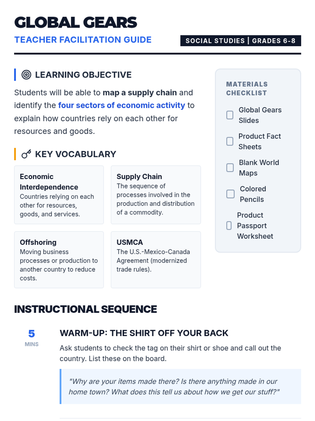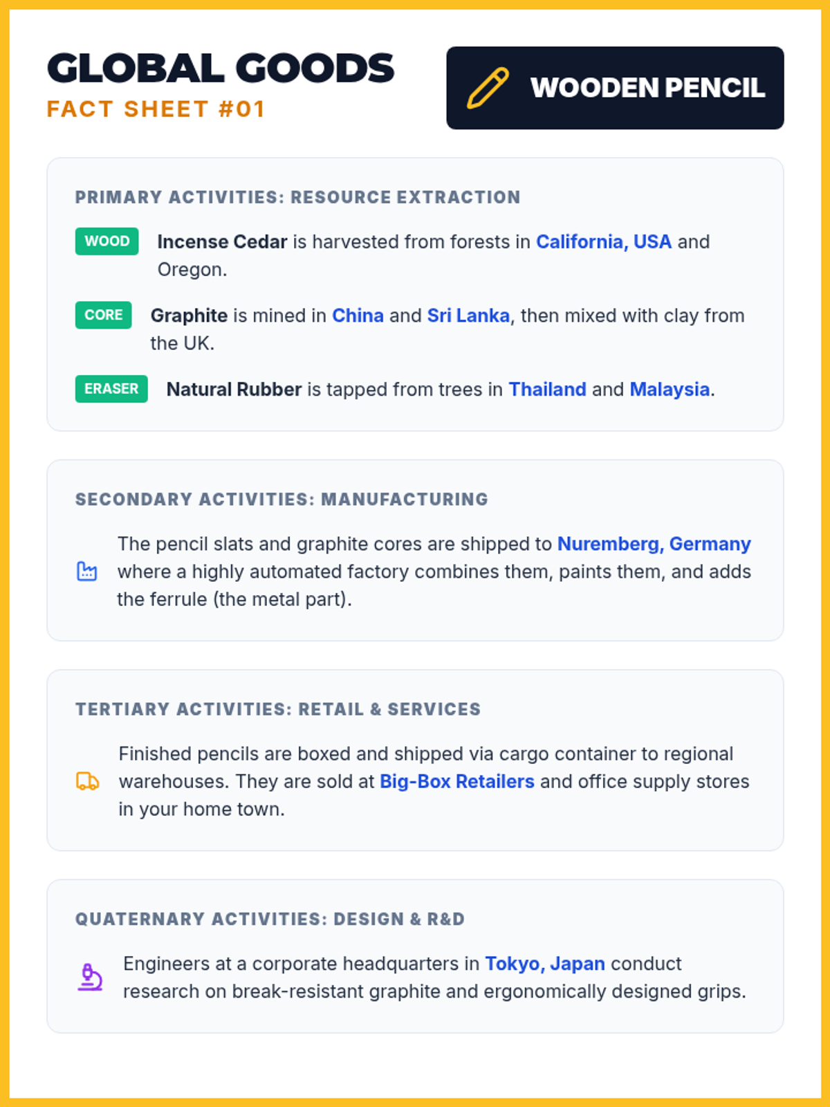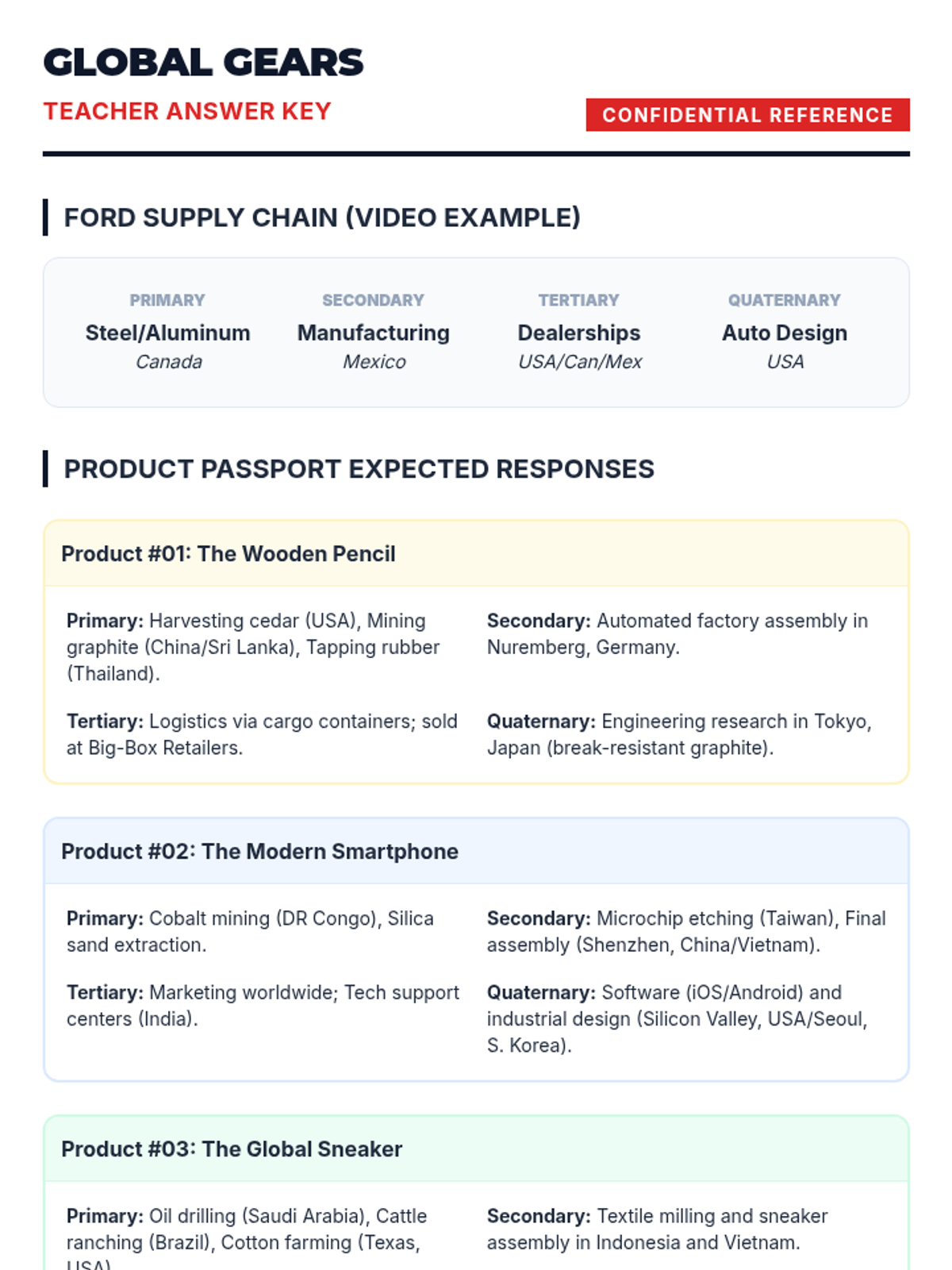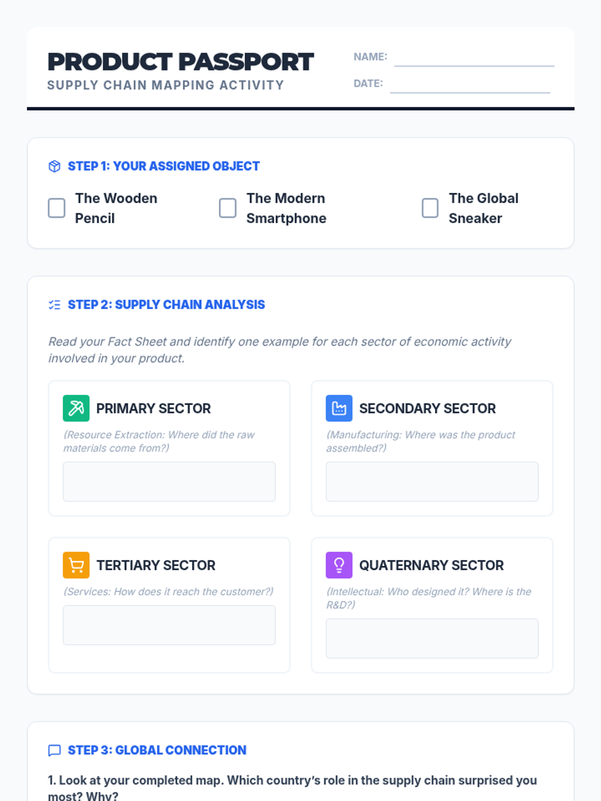 Students explore the four sectors of economic activity (Primary, Secondary, Tertiary, Quaternary) and map global supply chains to understand economic interdependence.