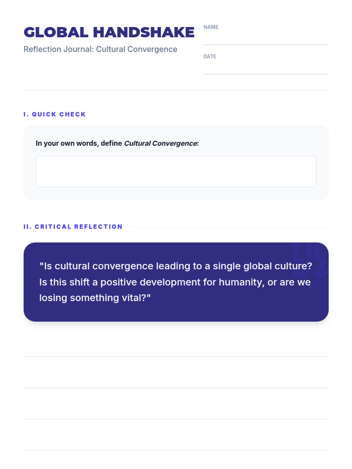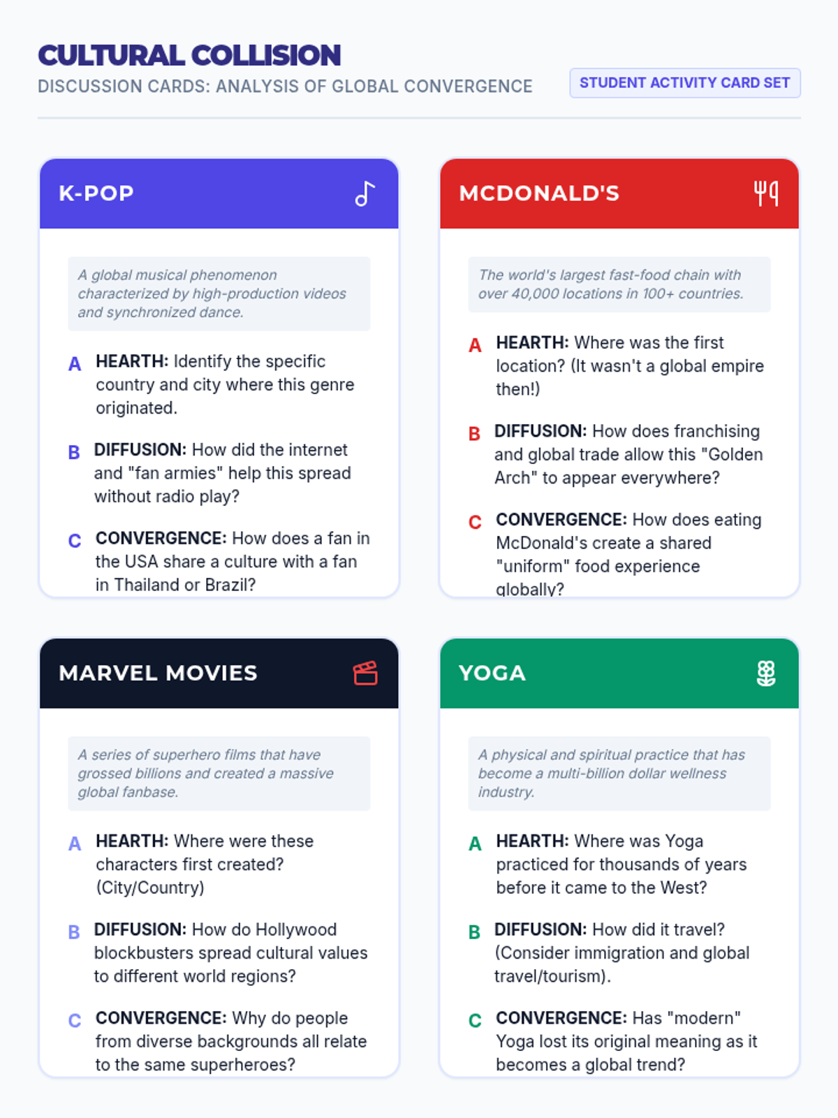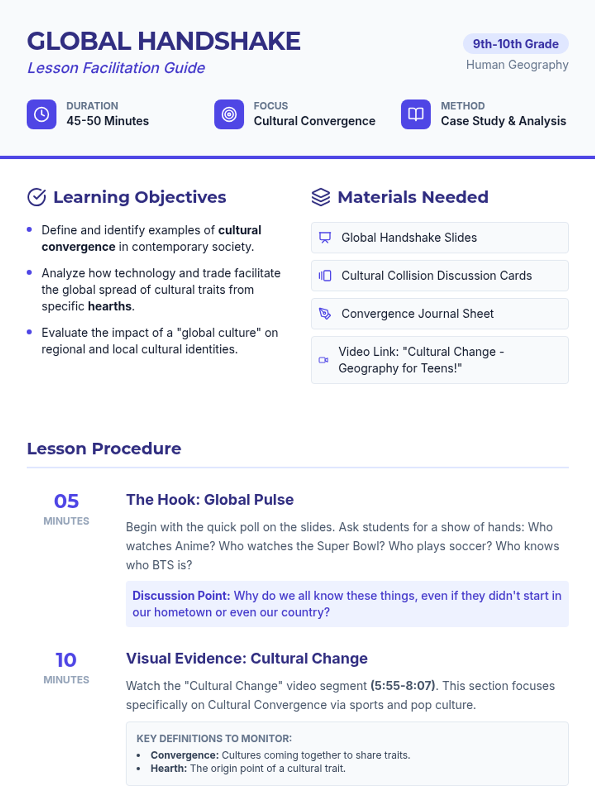 This lesson explores how globalization and technology lead to cultural convergence, using popular culture examples like sports and anime to illustrate how shared experiences create a unified global culture. Students analyze the origins and spread of global brands and reflect on the implications of cultural blending.