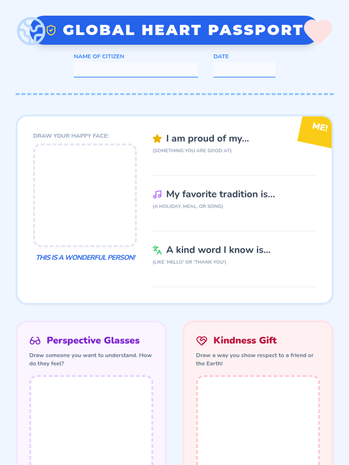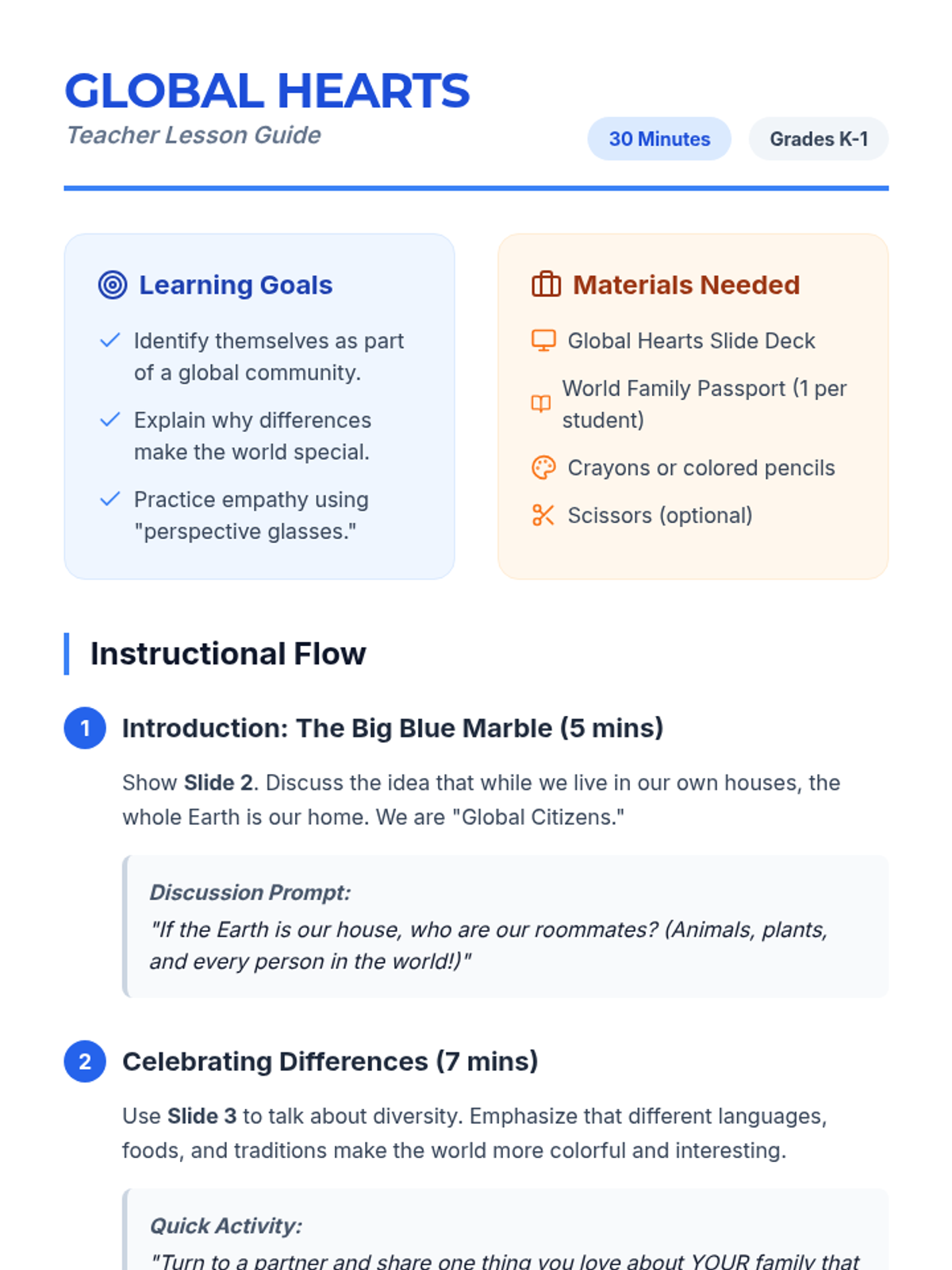 A 30-minute introductory lesson for Kindergarten and 1st-grade students focused on diversity, global citizenship, self-respect, and empathy. Students explore what it means to be part of a 'world family' through visual storytelling and hands-on activities.