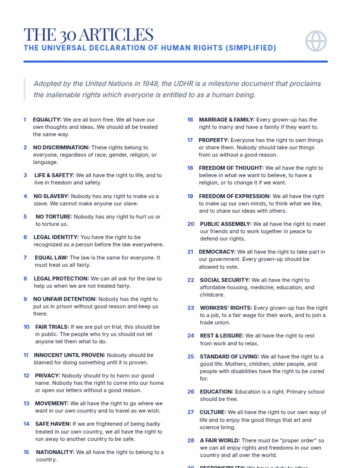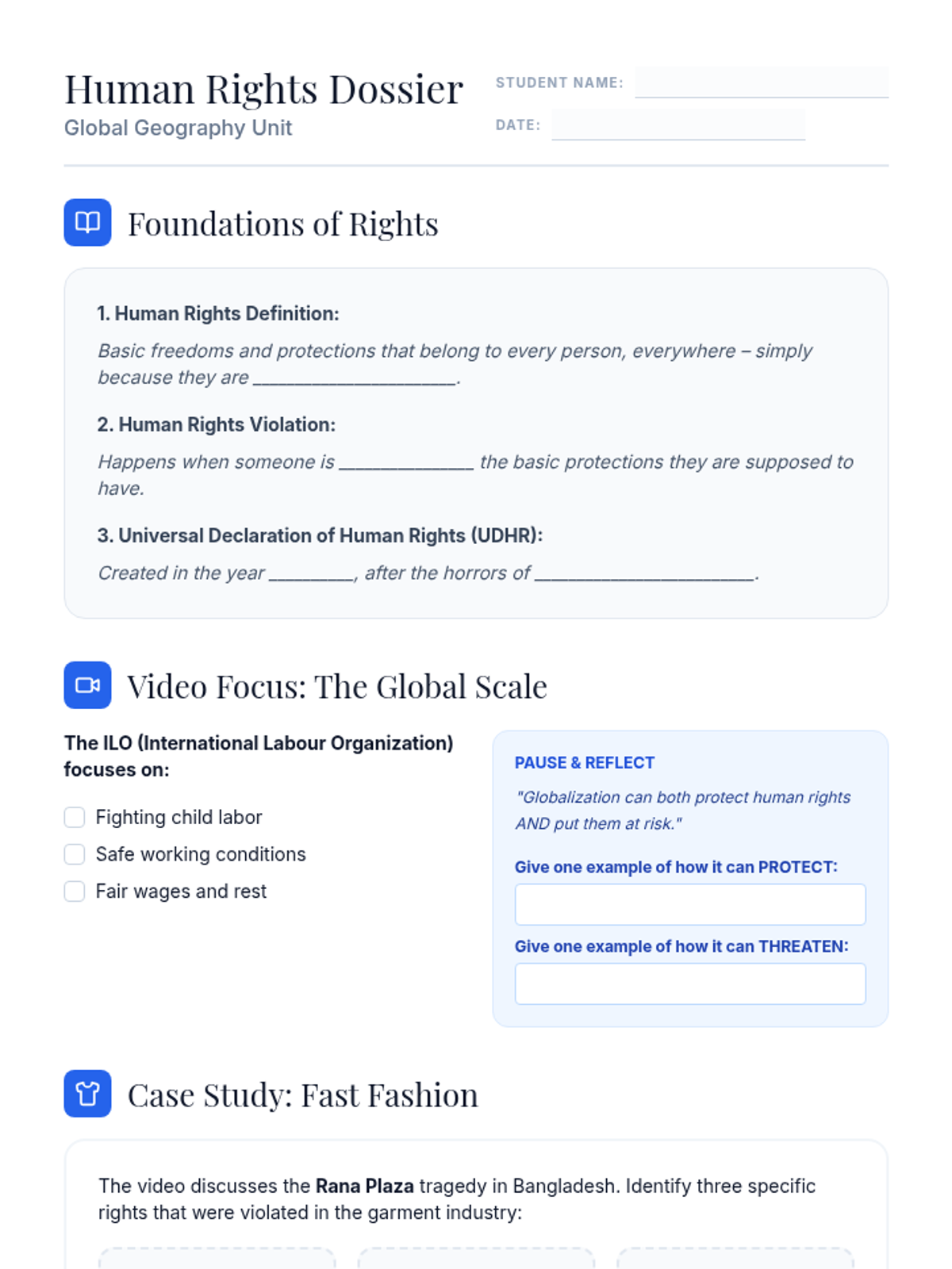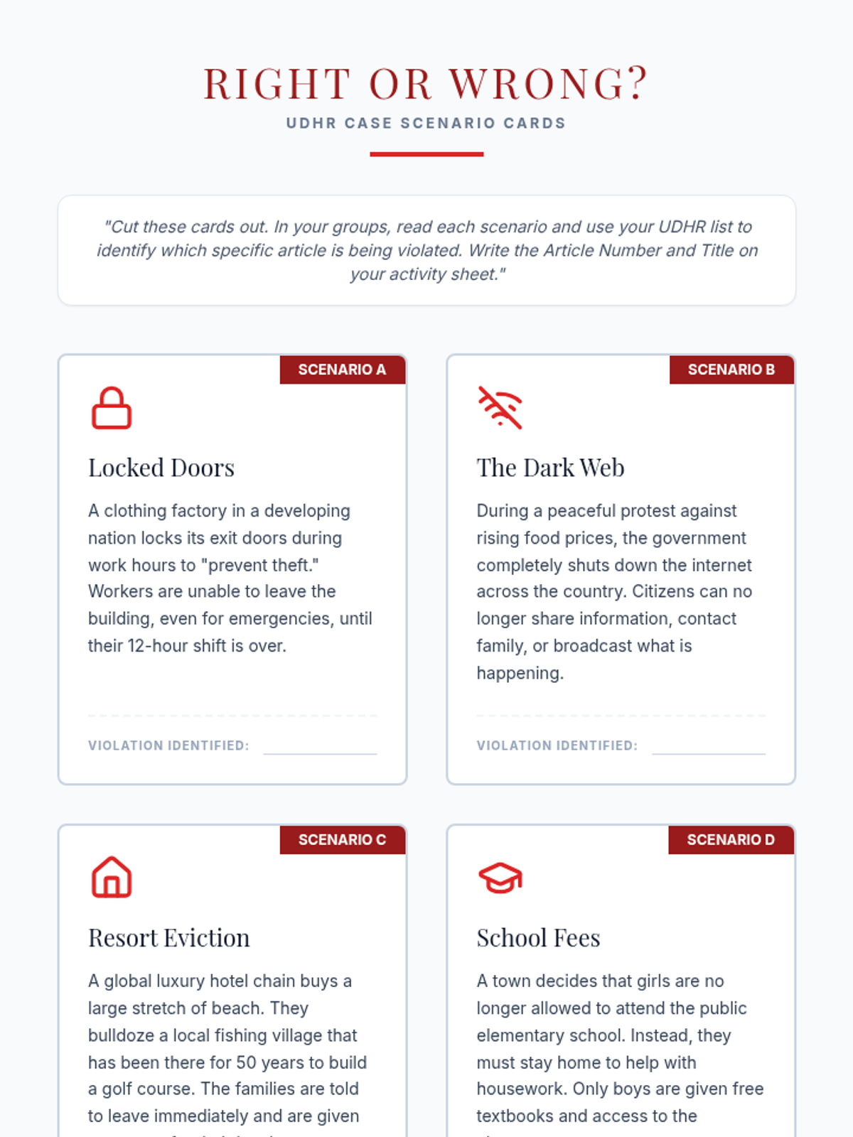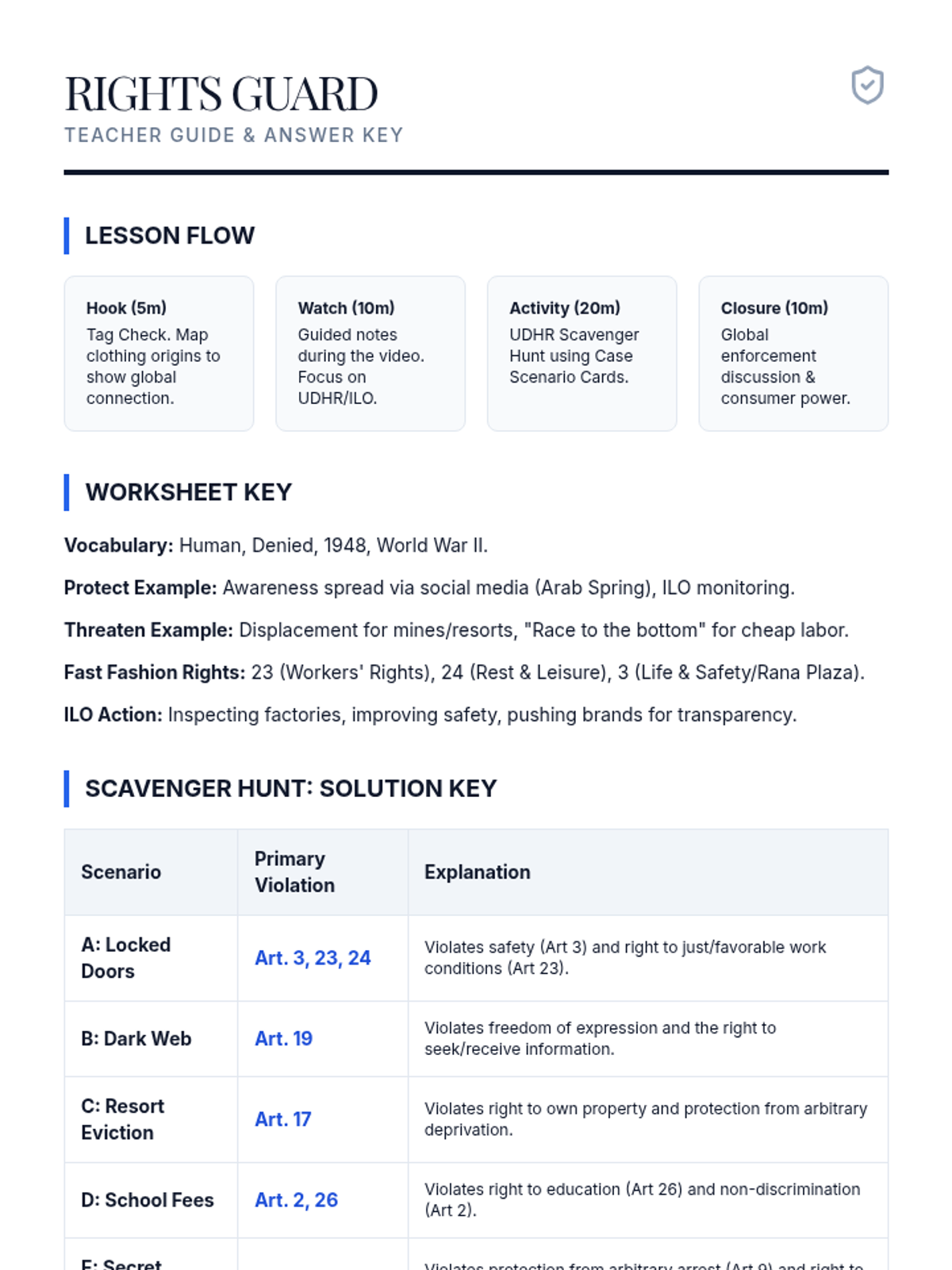 Students will explore the definition of human rights, the origins of the UDHR and ILO, and how globalization both protects and threatens these rights through a hands-on scavenger hunt and case study analysis.