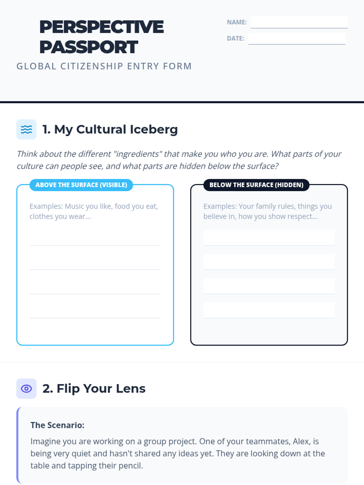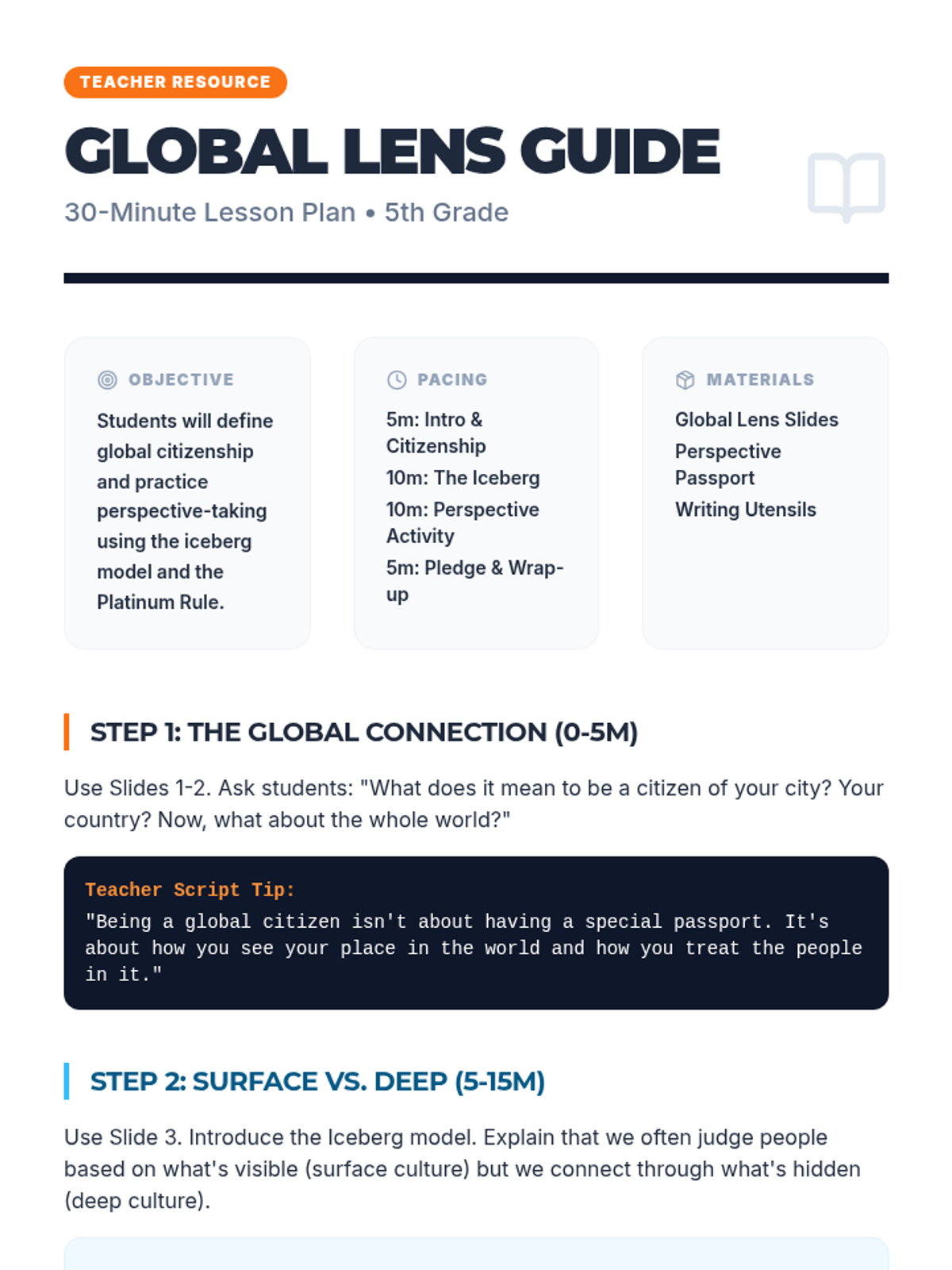 A fast-paced, 30-minute session where students explore what it means to be a global citizen, practice seeing the world through others' eyes, and celebrate the diverse 'ingredients' that make up our global community.