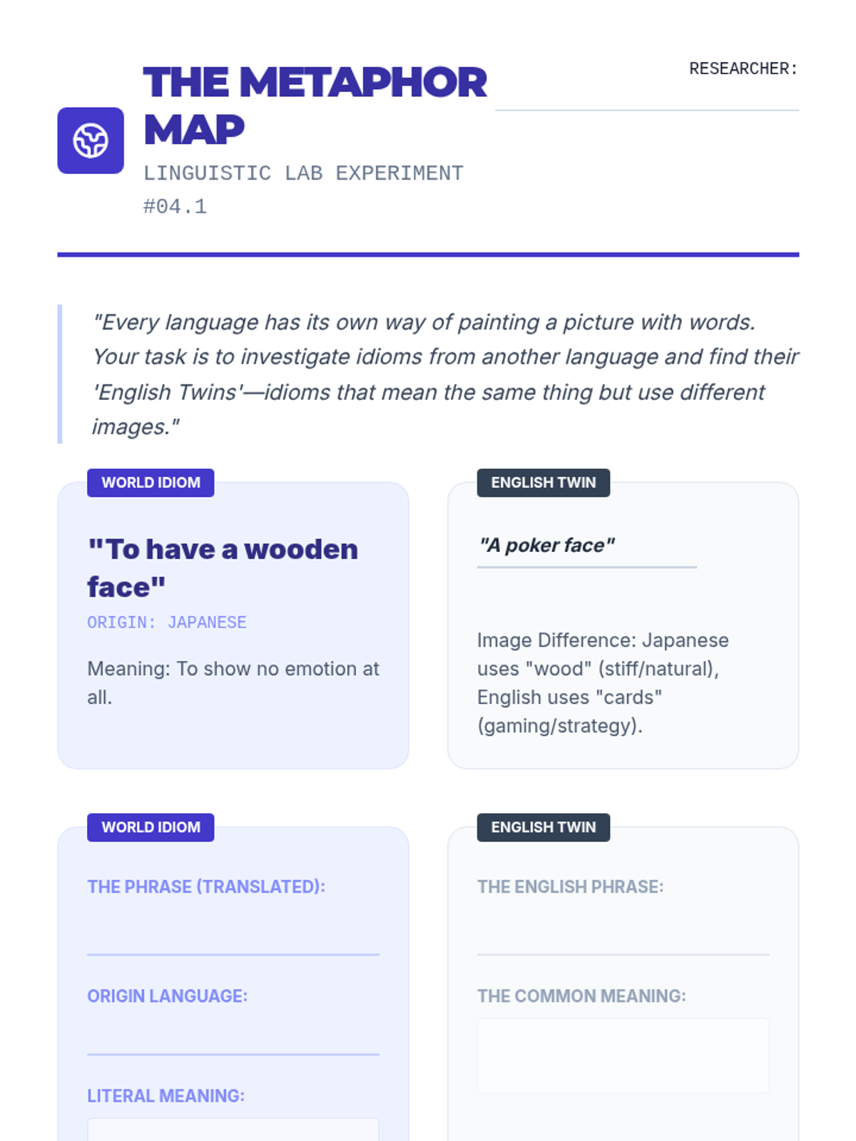 A cross-cultural exploration of metaphors. Students compare English idioms with those from other languages, discovering how different cultures use unique imagery to express universal human experiences.