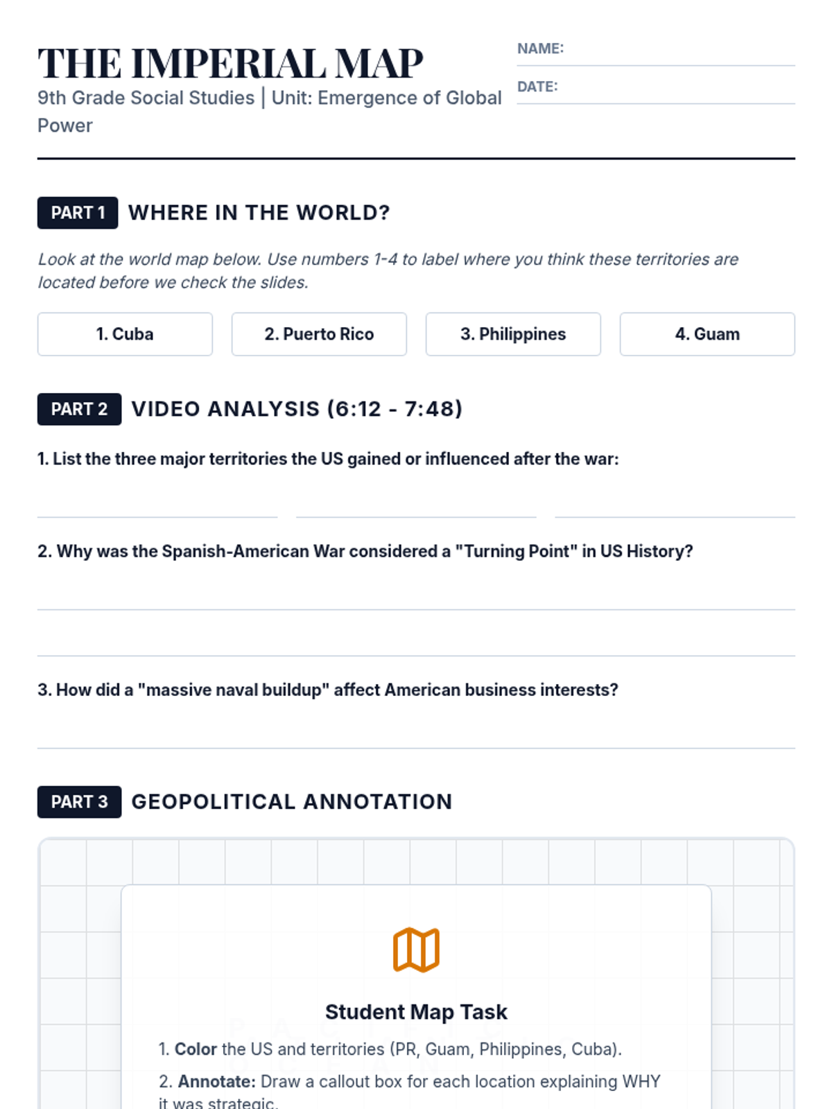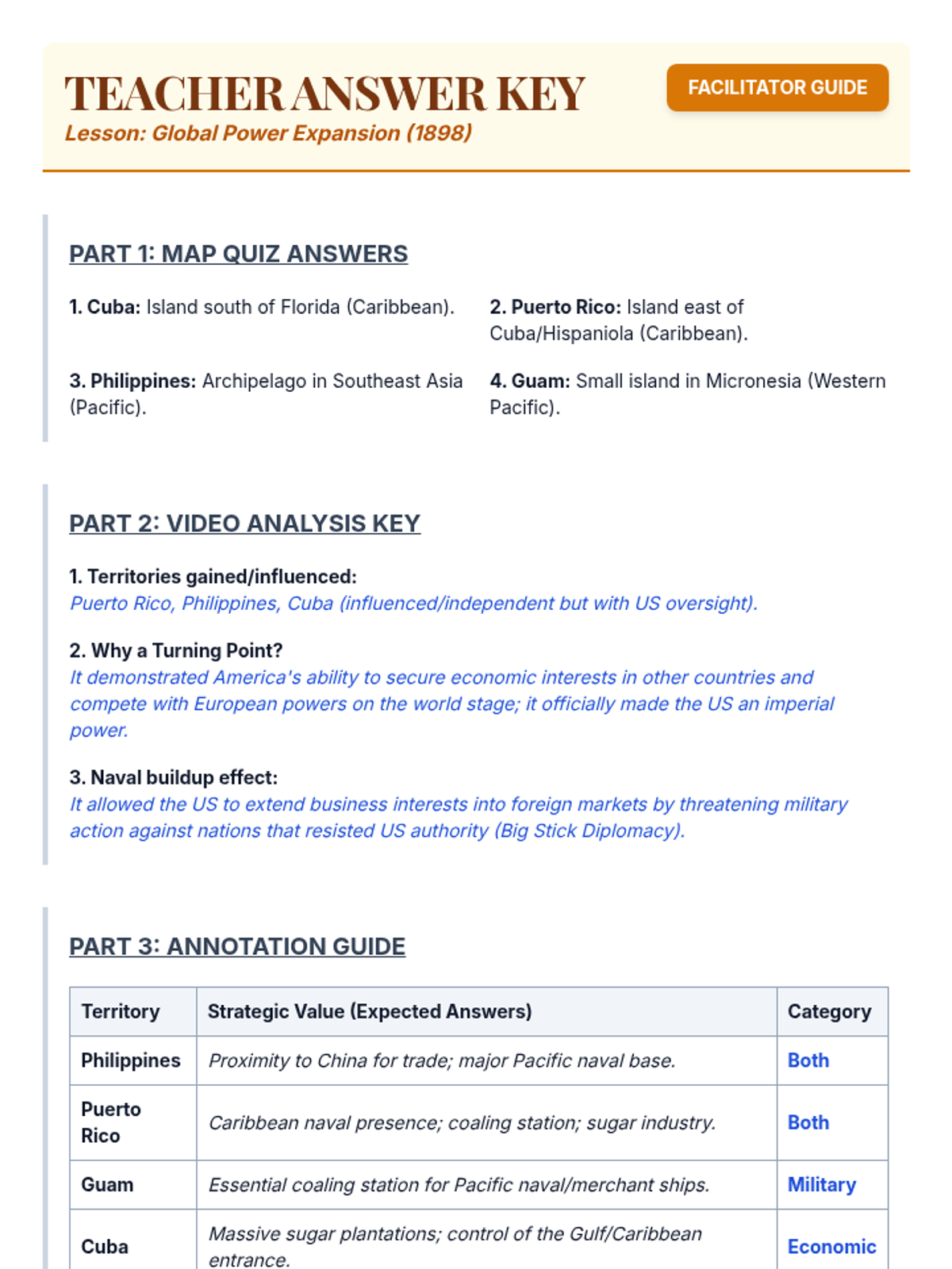Students will map and analyze the geopolitical shift of the United States from a continental nation to a global imperial power following the Spanish-American War of 1898. They will identify key territories acquired and evaluate the strategic economic and military motivations behind these acquisitions.