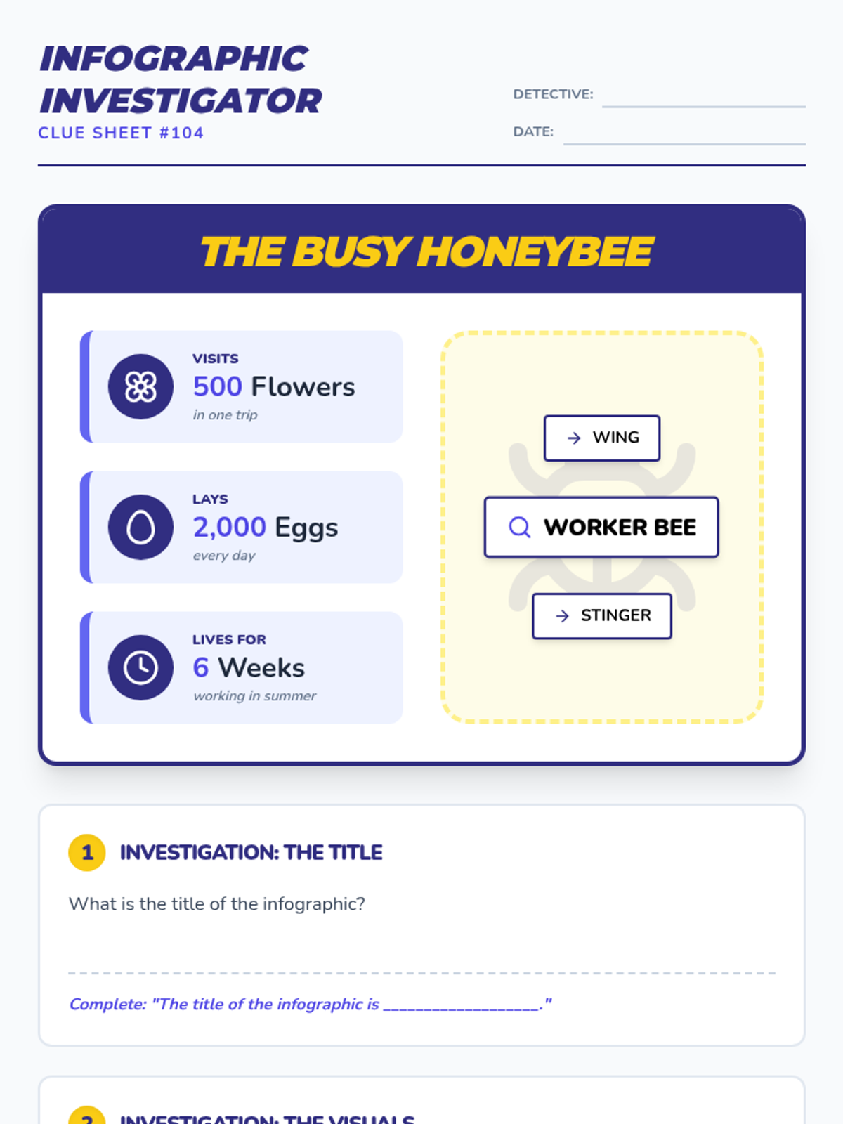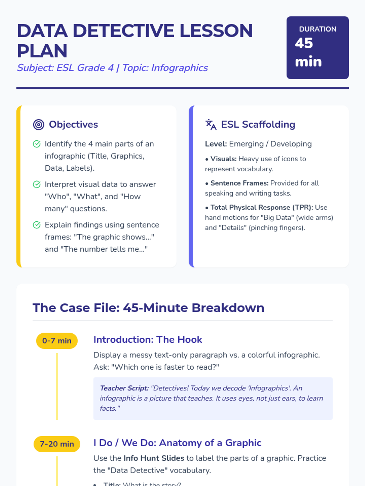A 45-minute ESL lesson for Grade 4 (Emerging/Developing proficiency) focused on interpreting and explaining information from infographics. Students act as 'Data Detectives' to decode visual information.