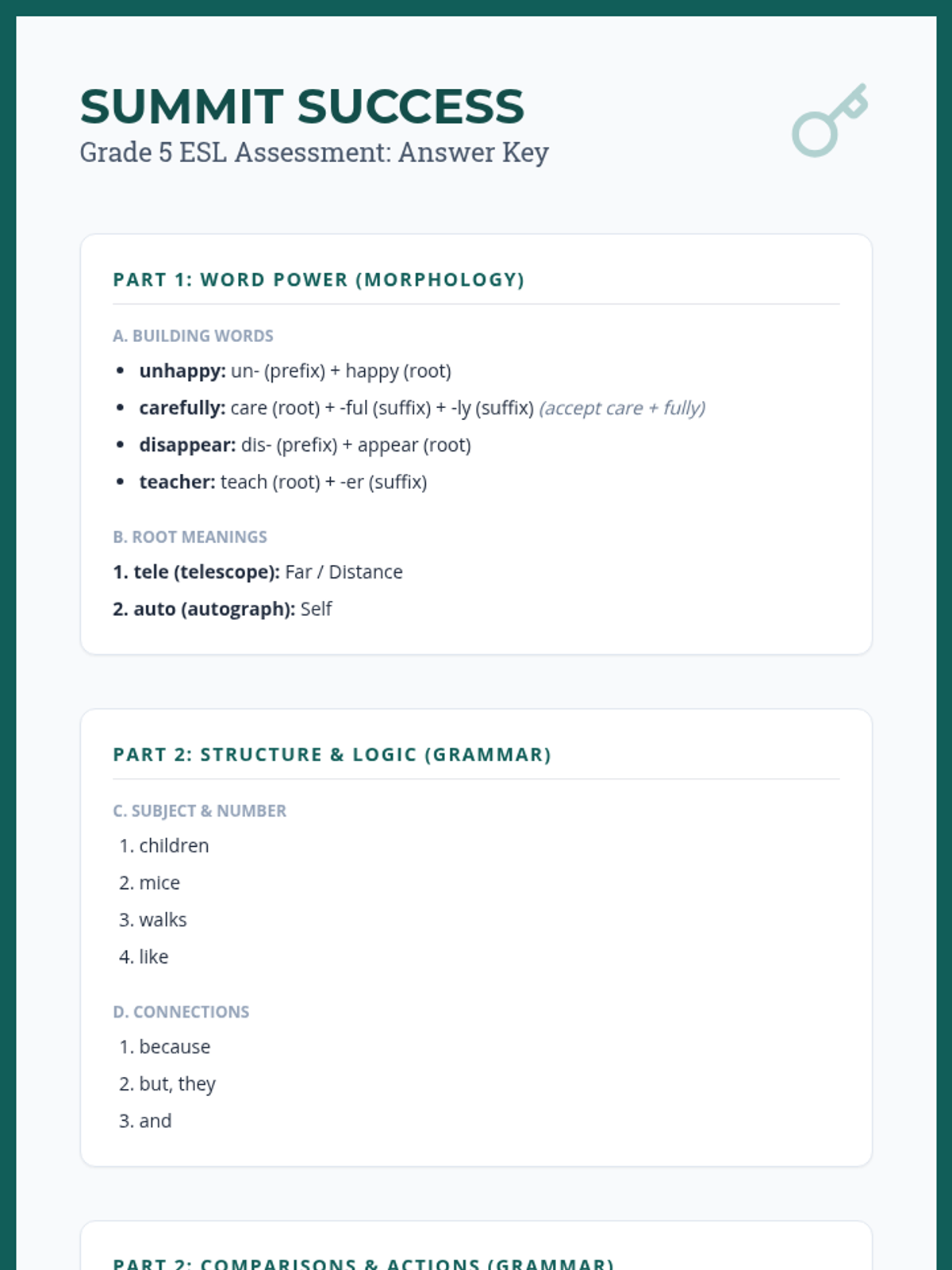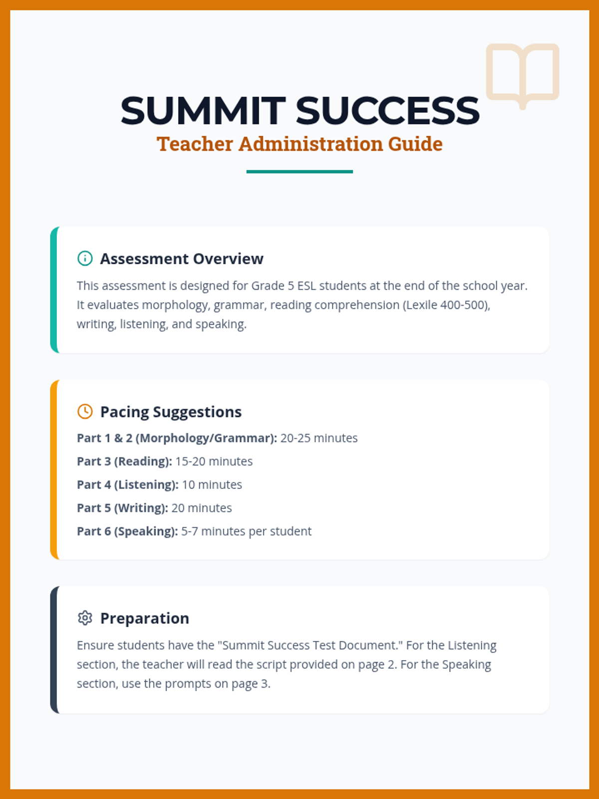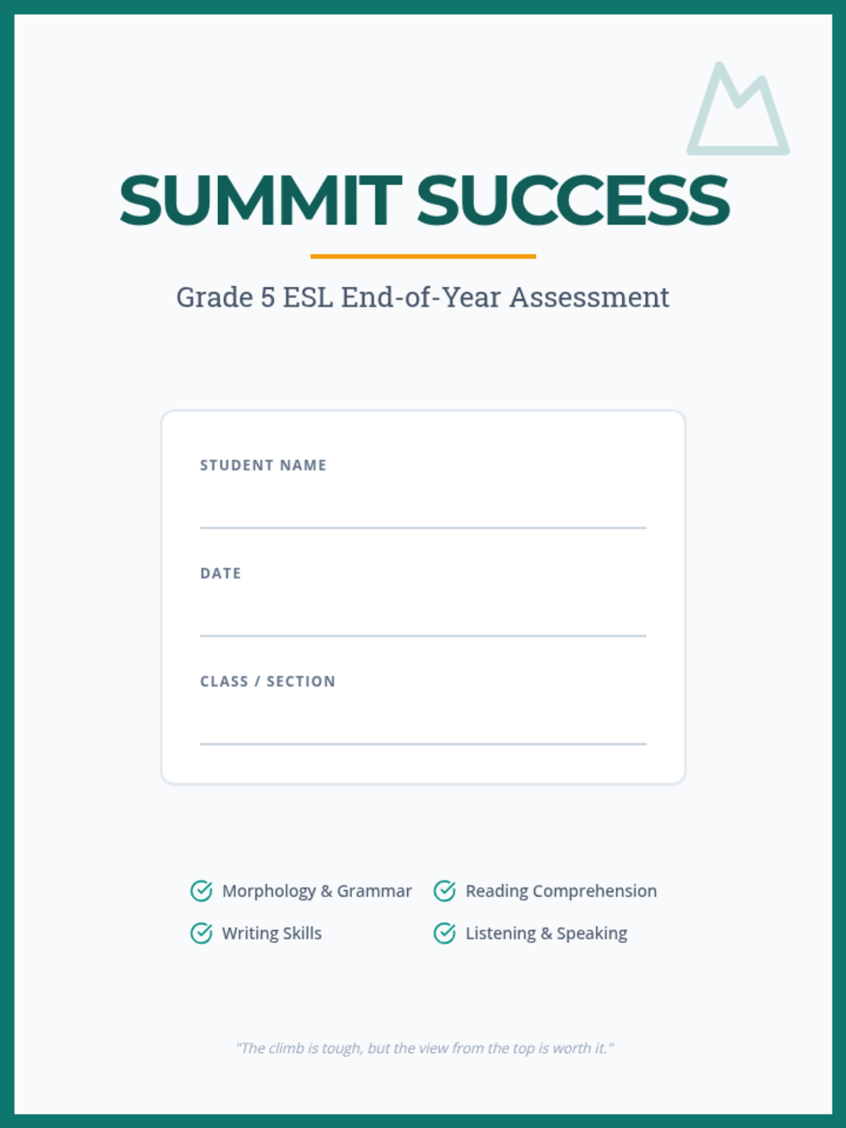 A comprehensive end-of-year assessment for Grade 5 ESL students covering morphology, grammar, reading, writing, listening, and speaking with a Lexile 400-500 nonfiction focus.
