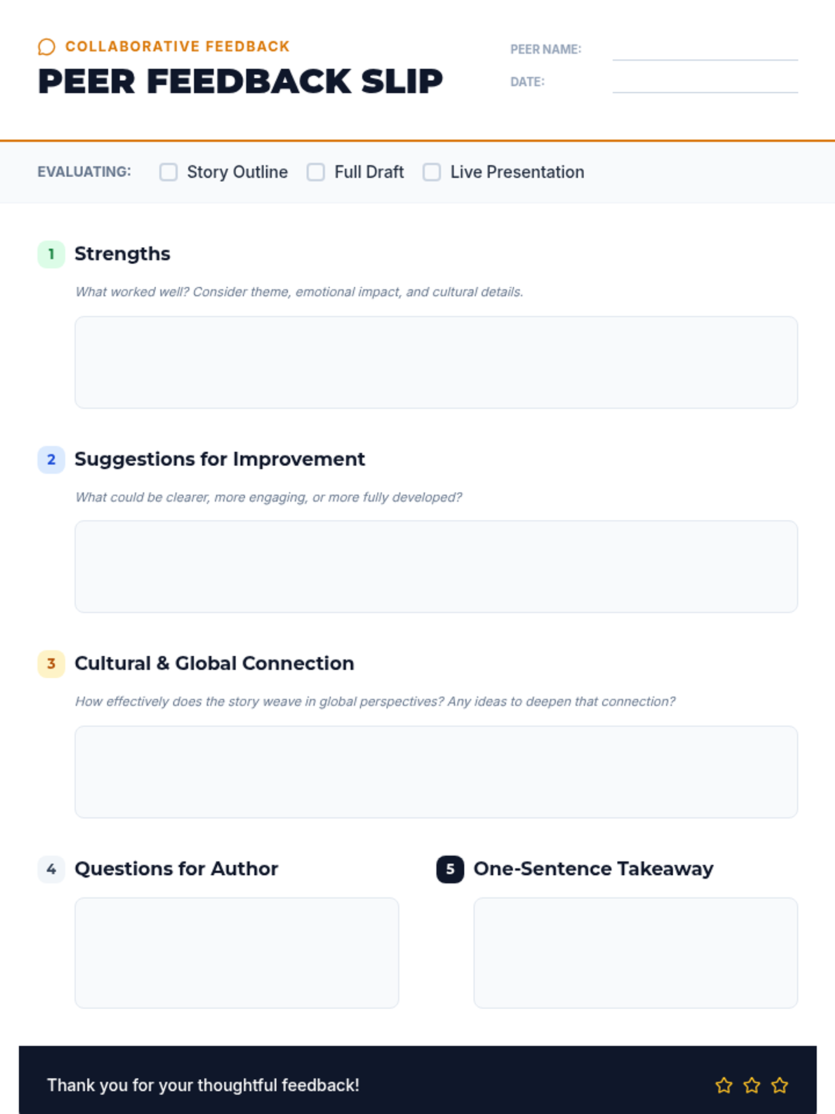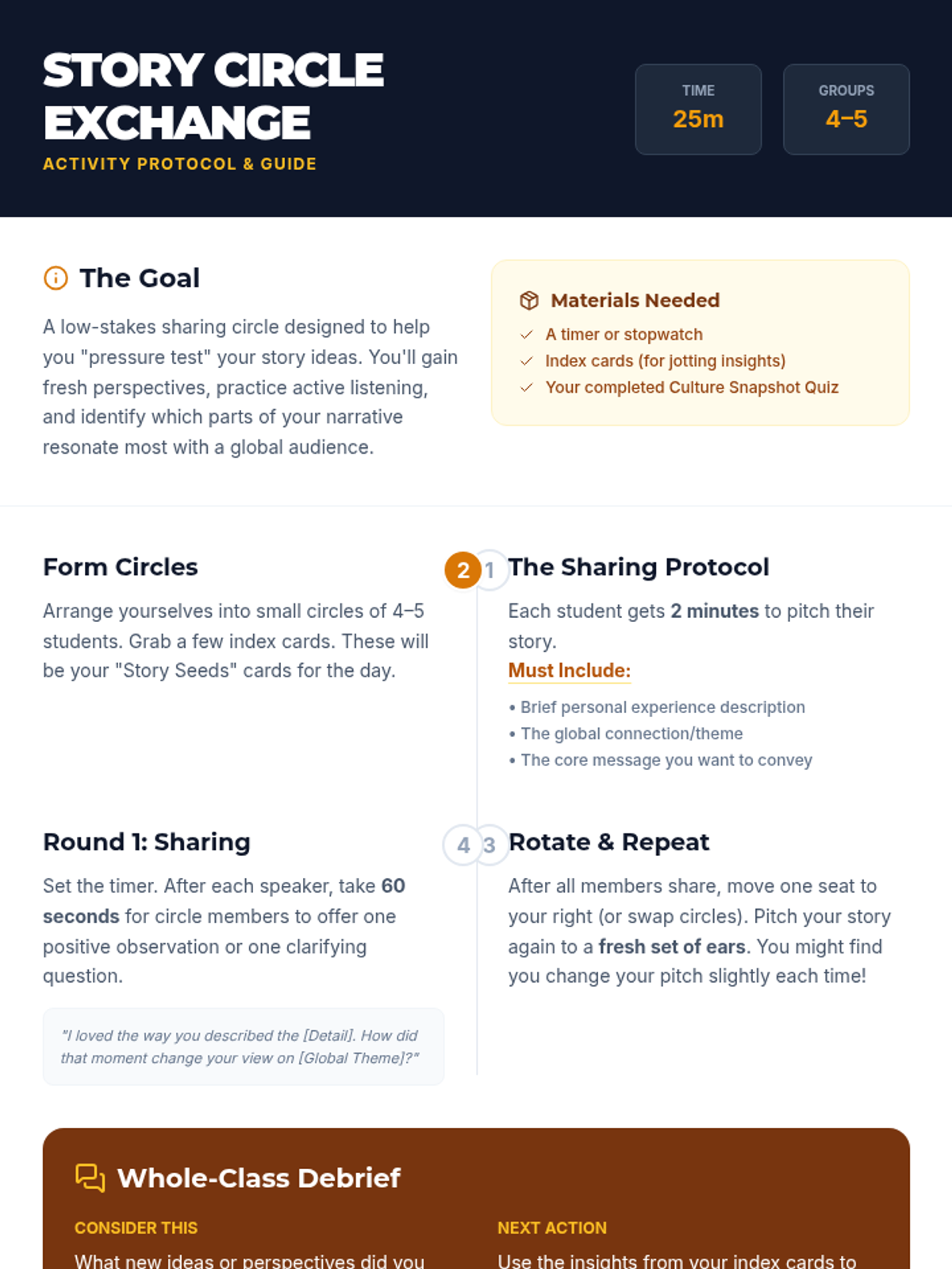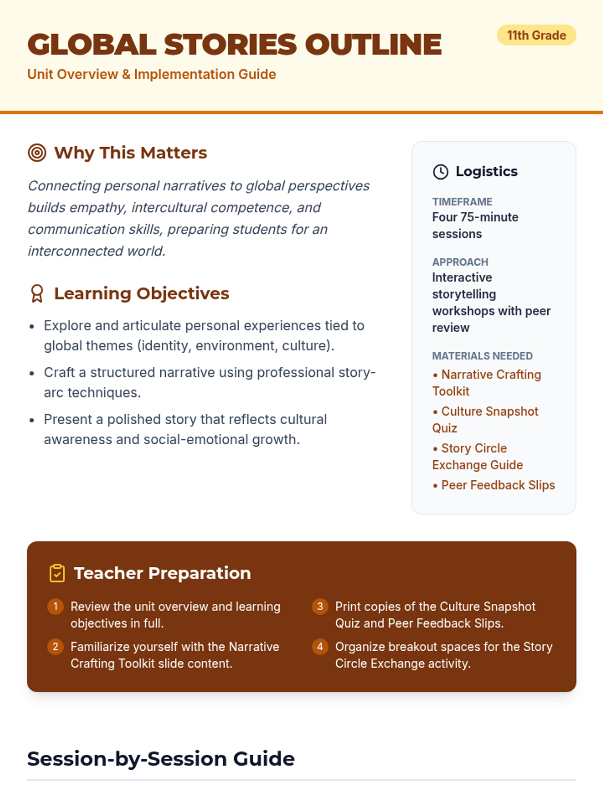 A four-session unit where 11th-grade students craft personal narratives that bridge individual experiences with global themes, fostering empathy and intercultural competence.
