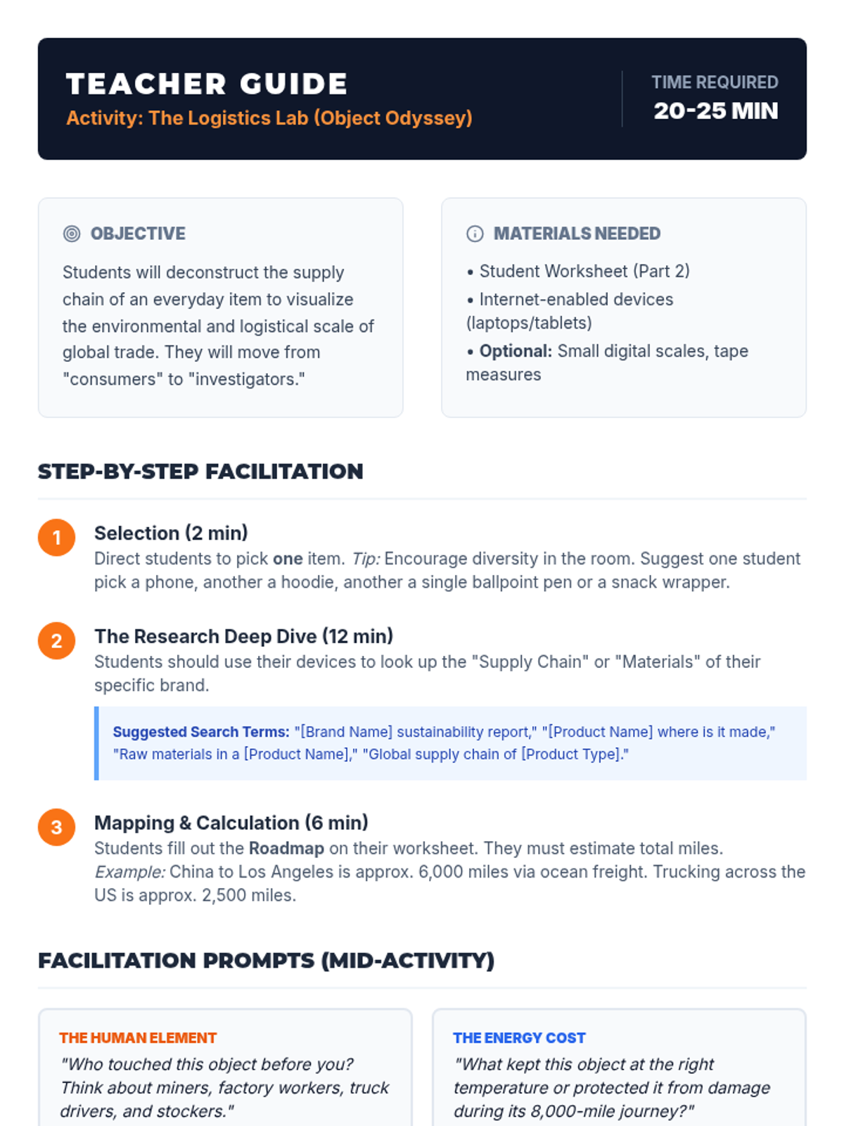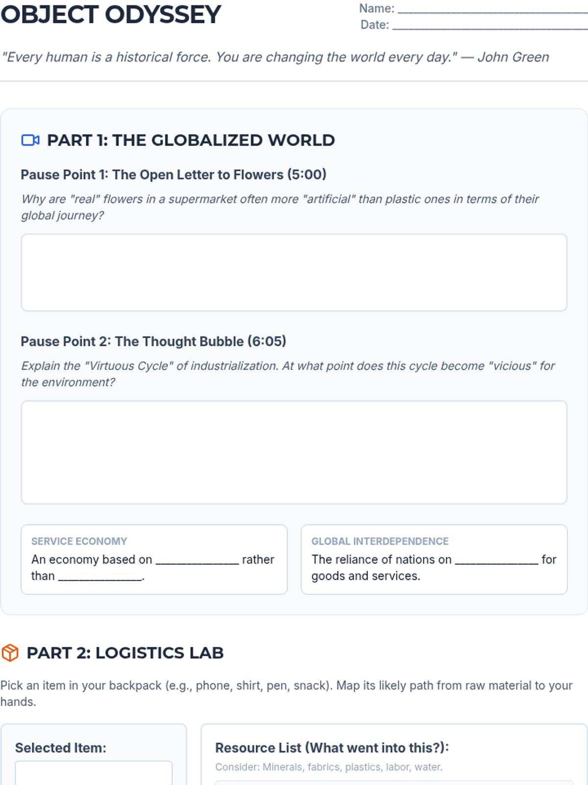 Students analyze the environmental and social costs of global supply chains using a 'Crash Course World History' video and a hands-on research activity exploring the lifecycle of everyday objects.