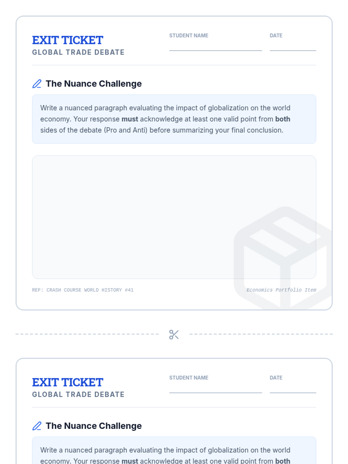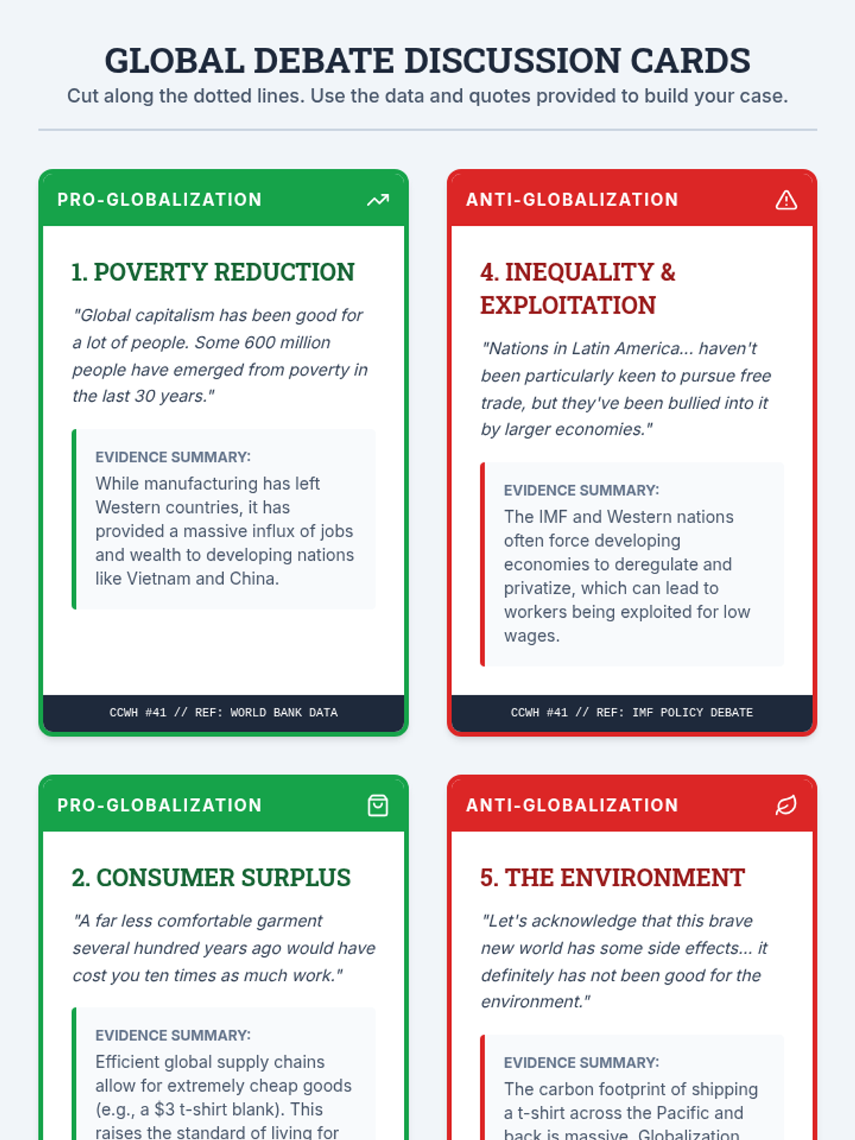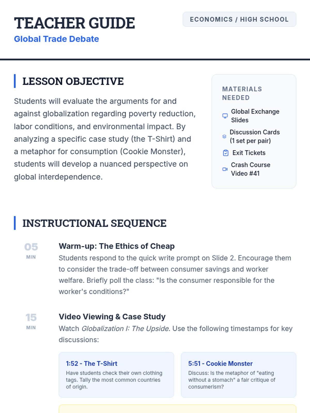 A high school economics lesson evaluating the impact of globalization on poverty, labor conditions, and consumption through a case study of a t-shirt and the 'Cookie Monster' metaphor.