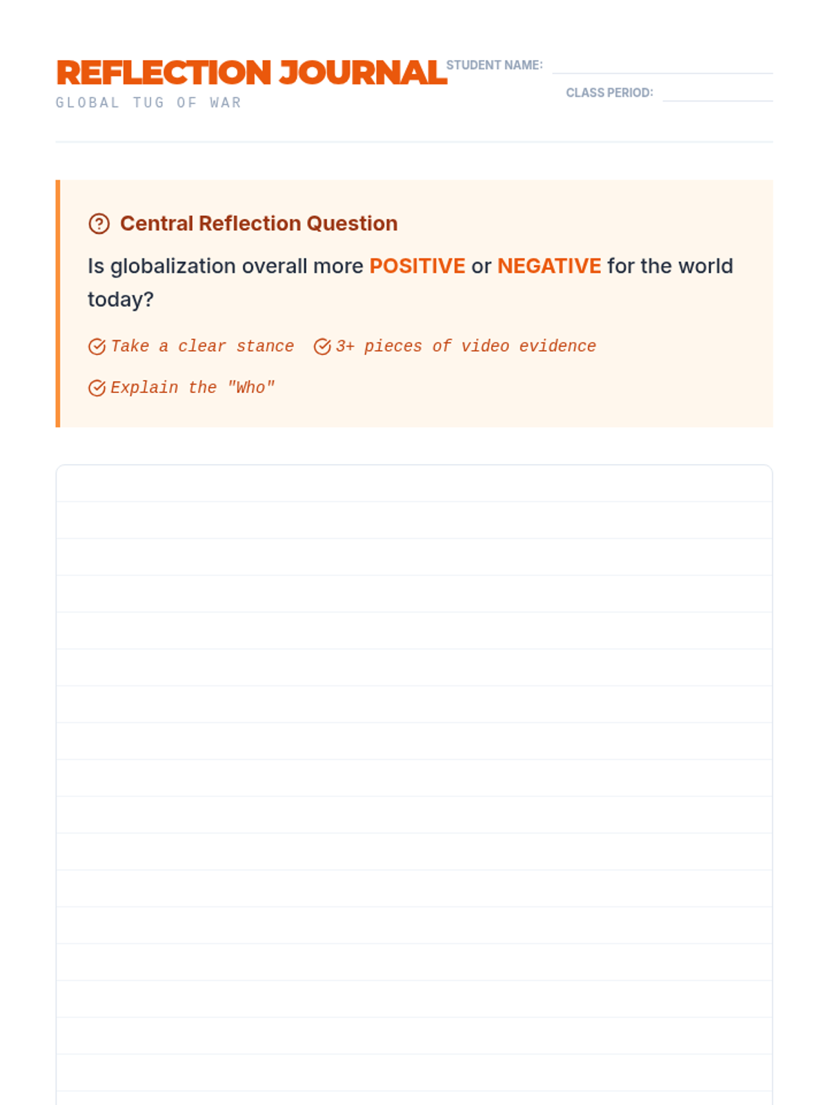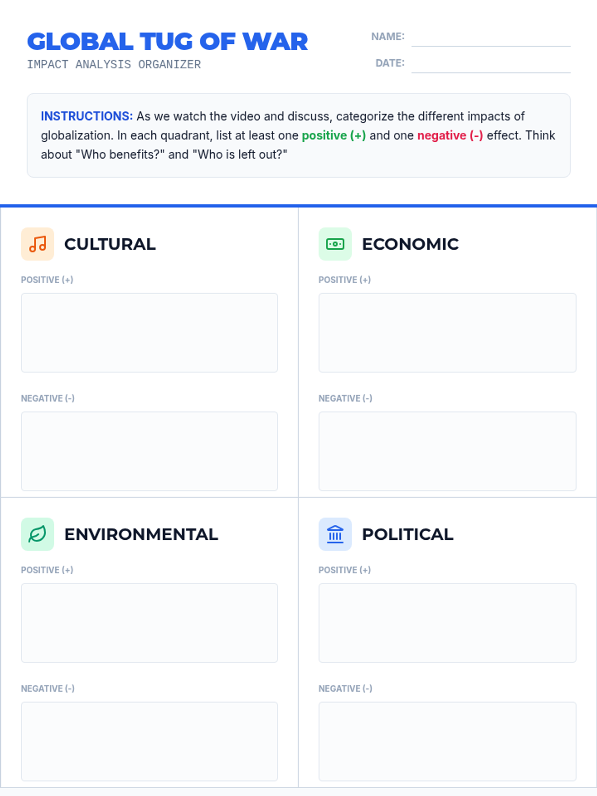 Students will evaluate the multifaceted impacts of globalization, focusing on cultural and environmental trade-offs through video analysis, Socratic discussion, and a four-quadrant impact analysis activity.